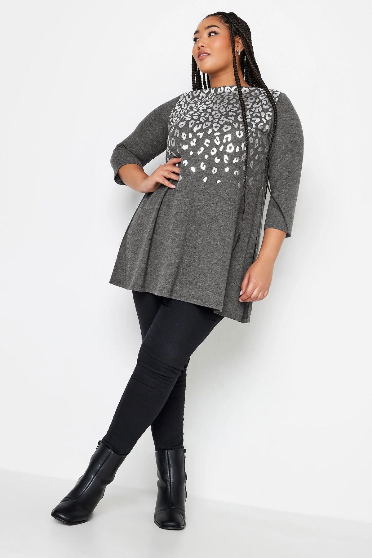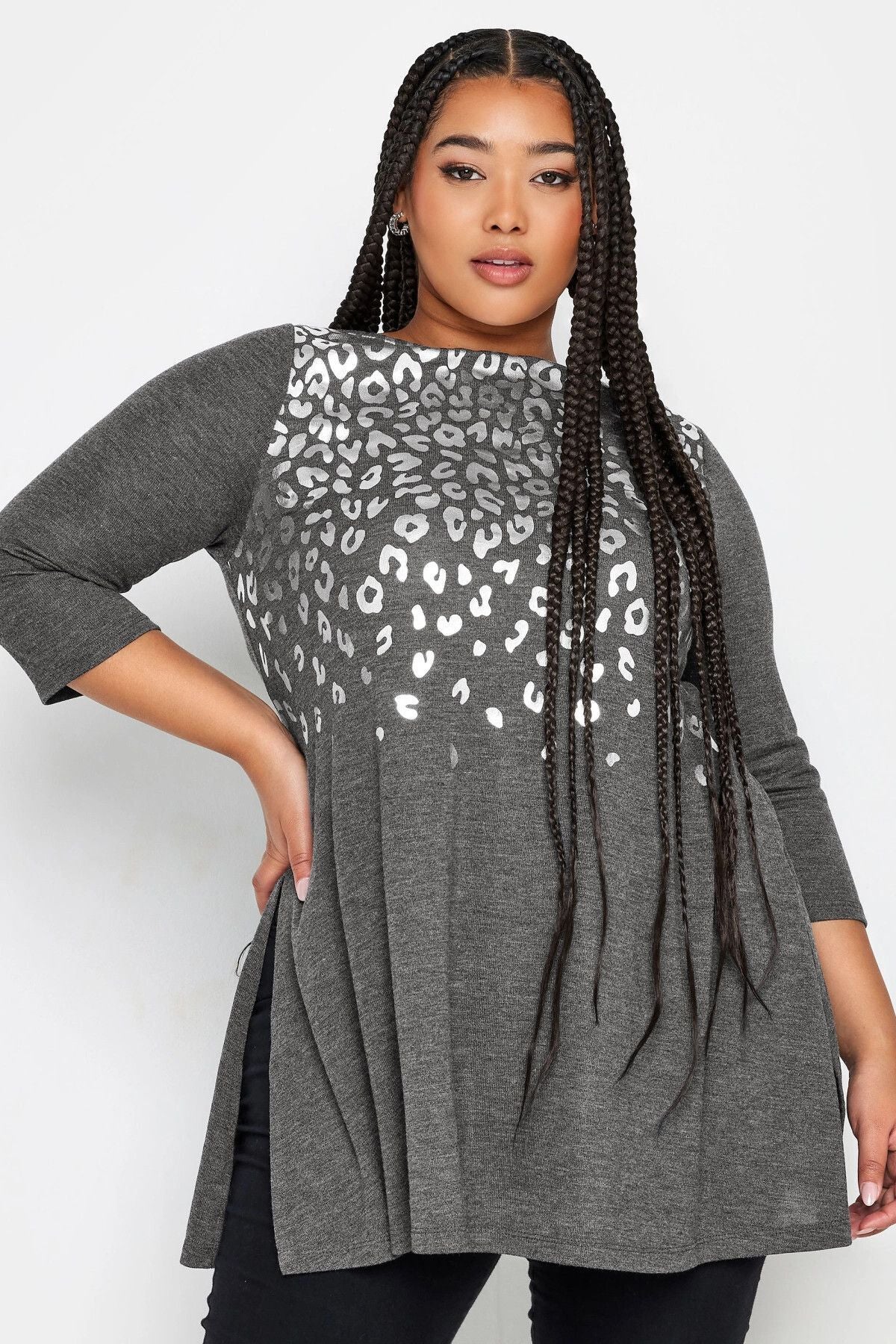 Büyük Beden Leopar Desen Baskılı Yırtmaç Detaylı Yarım Kolu Bluz 285010