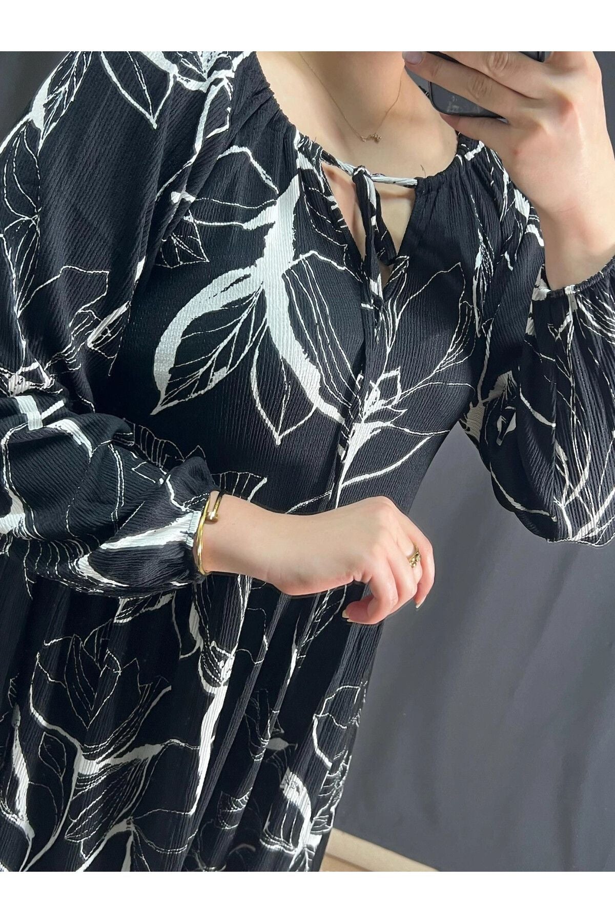 Büyük Beden Önü Bağlamalı Desenli Uzun Kollu Midi Elbise 302741