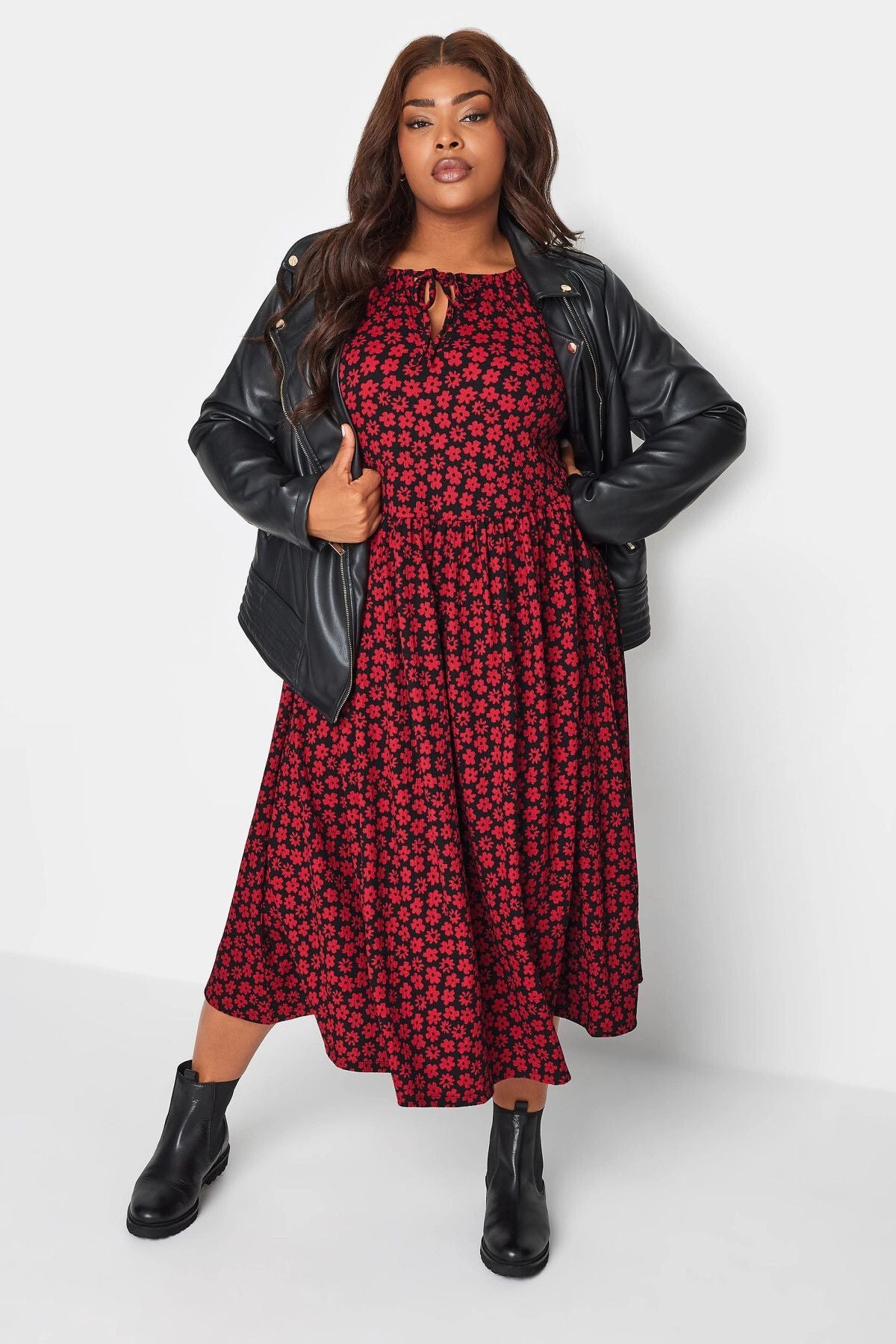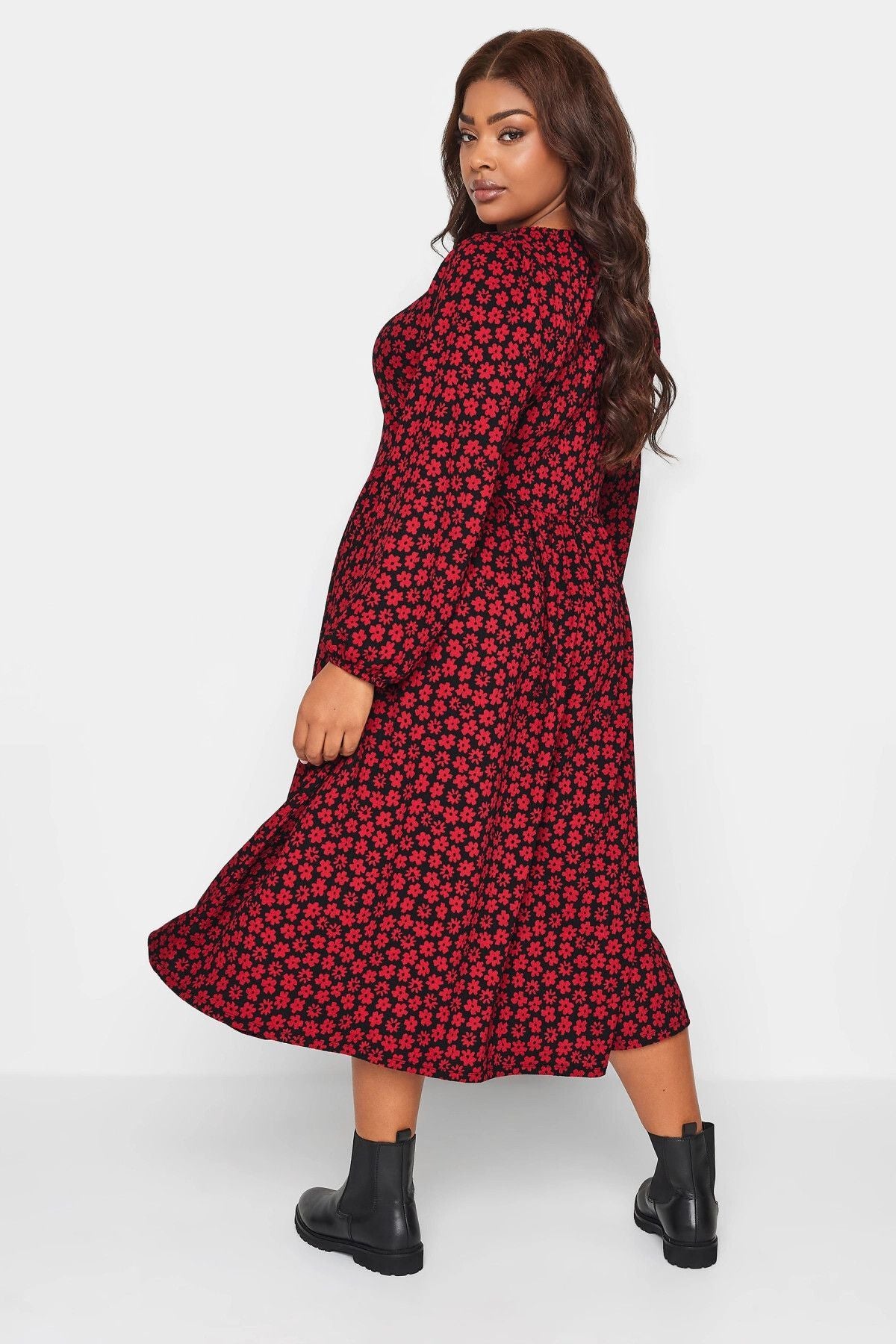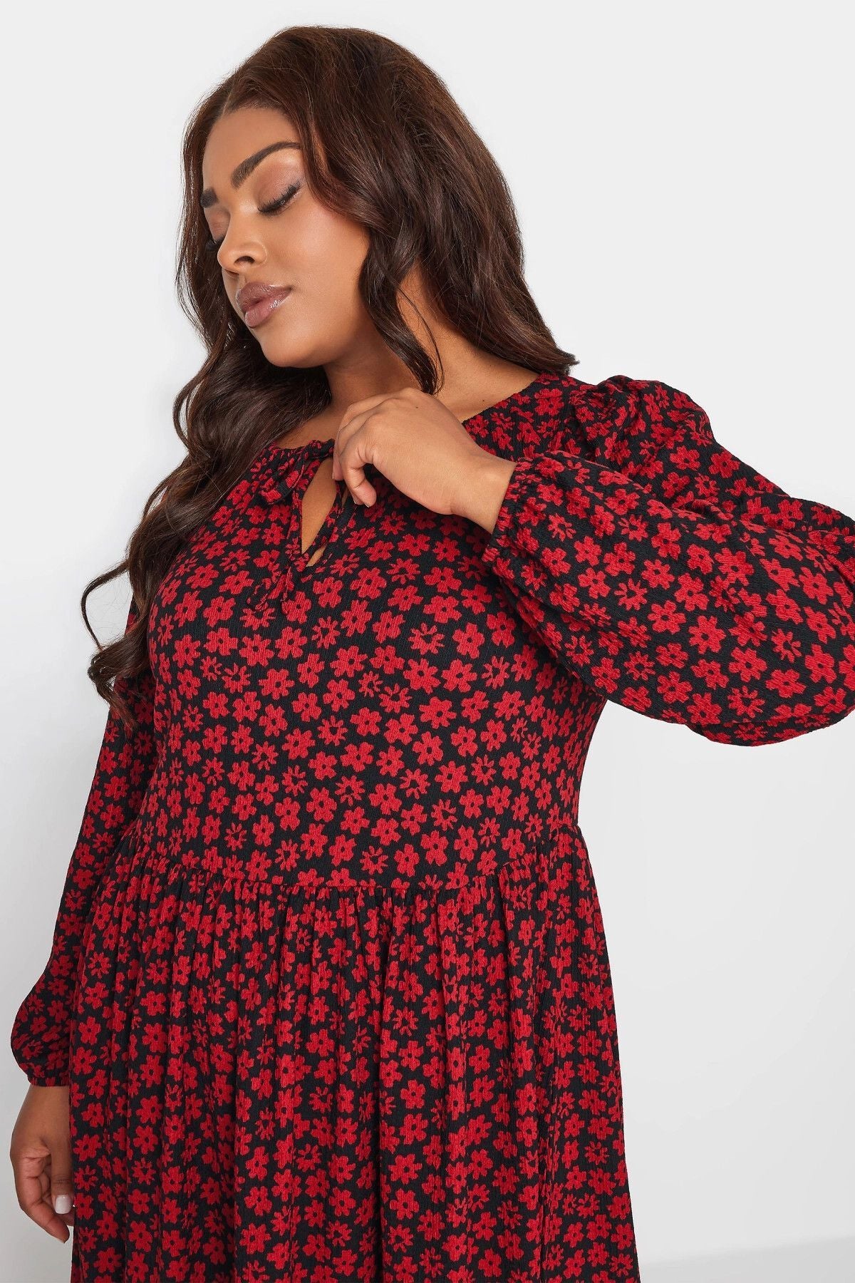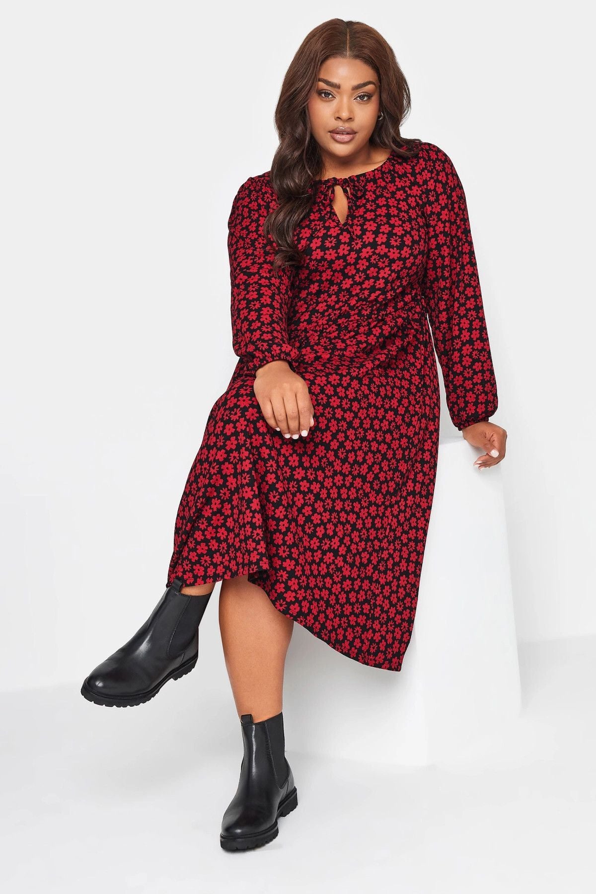 Büyük Beden Önü Bağlamalı Puantiye Desenli Uzun Kollu Midi Elbise 137625