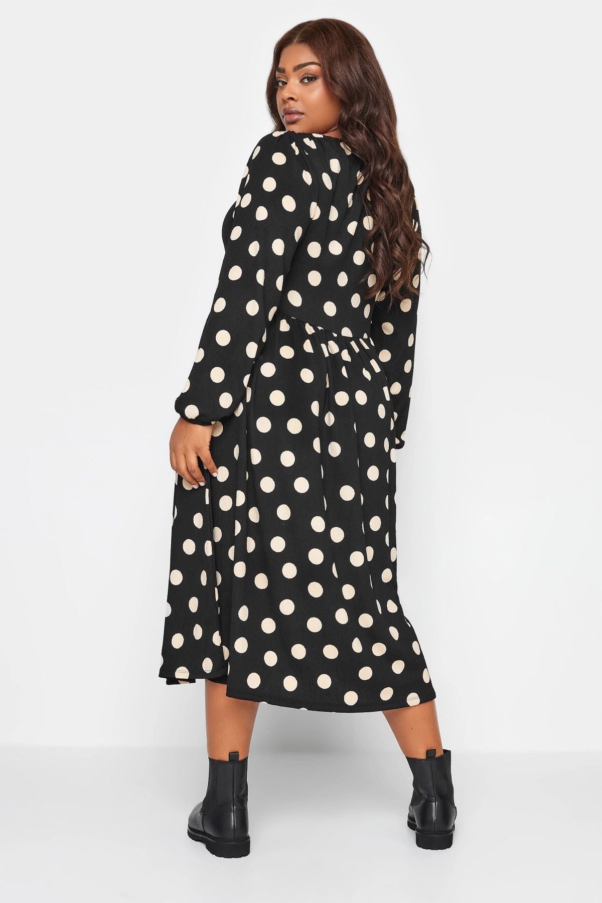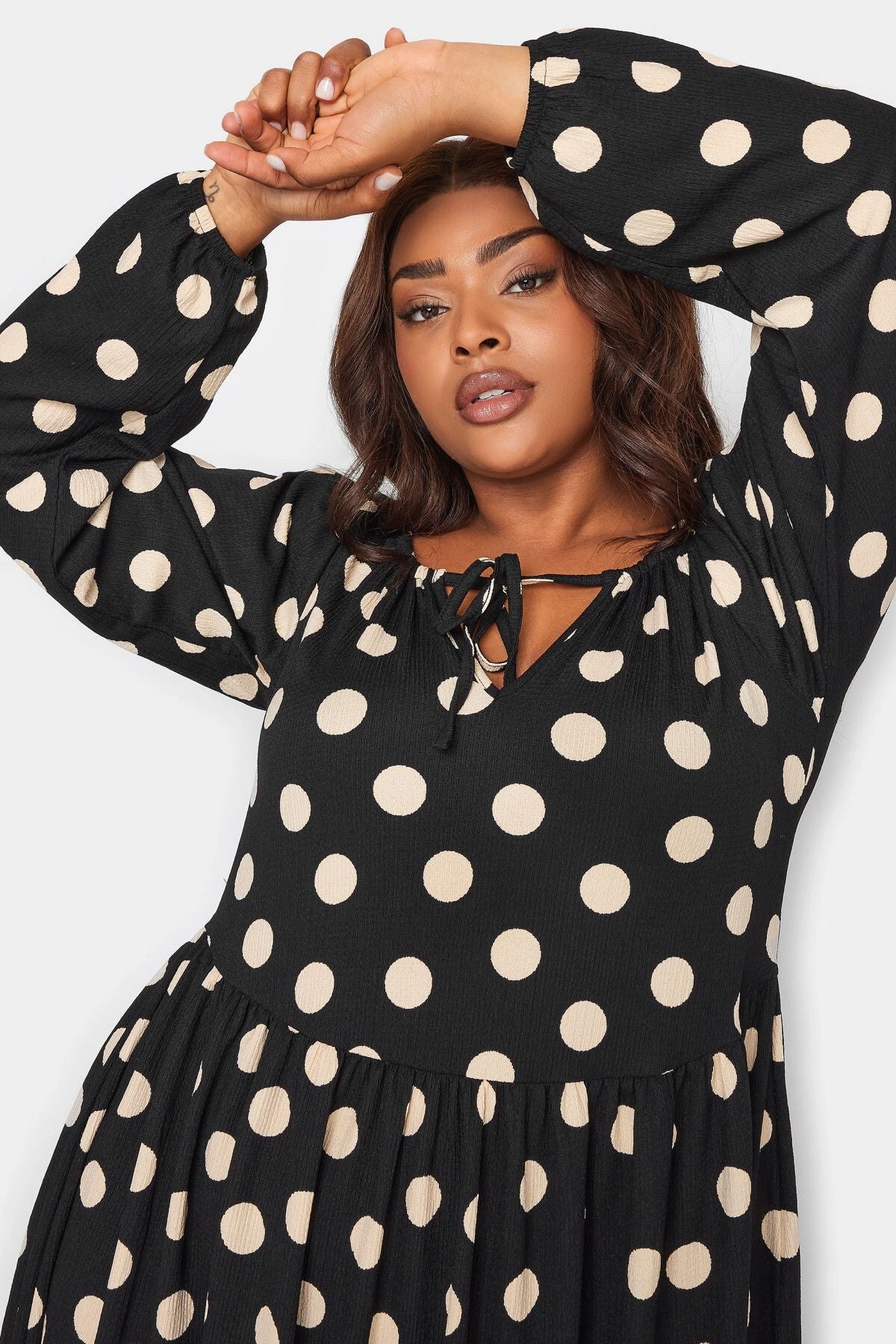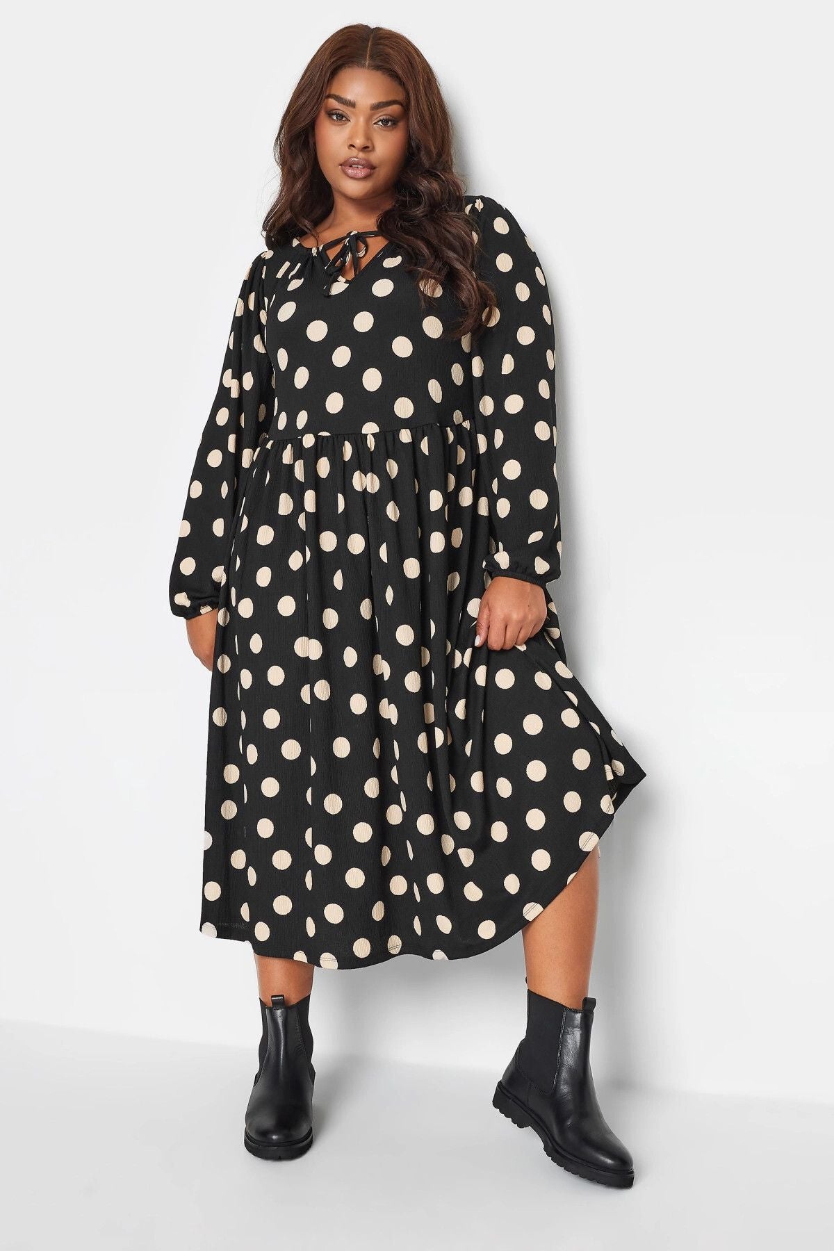 Büyük Beden Önü Bağlamalı Puantiye Desenli Uzun Kollu Midi Elbise 137626