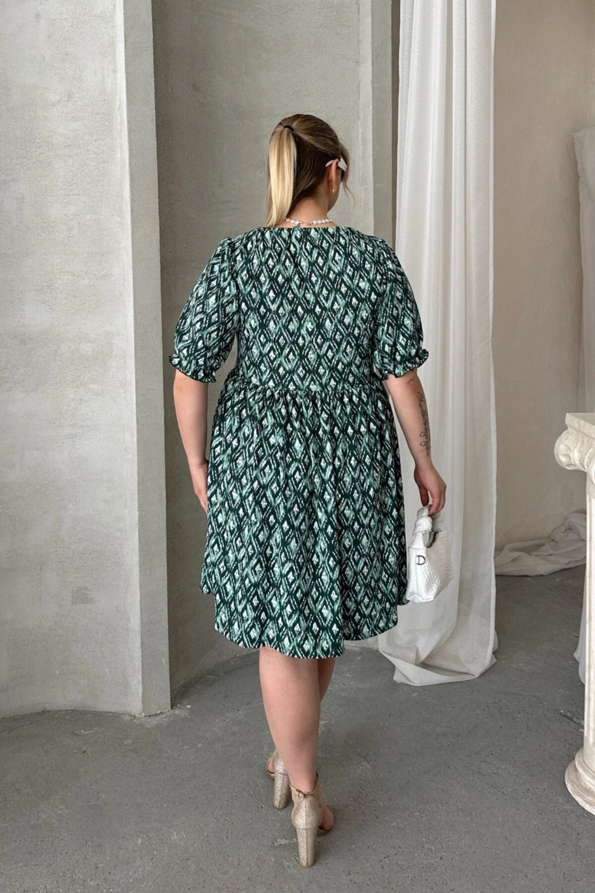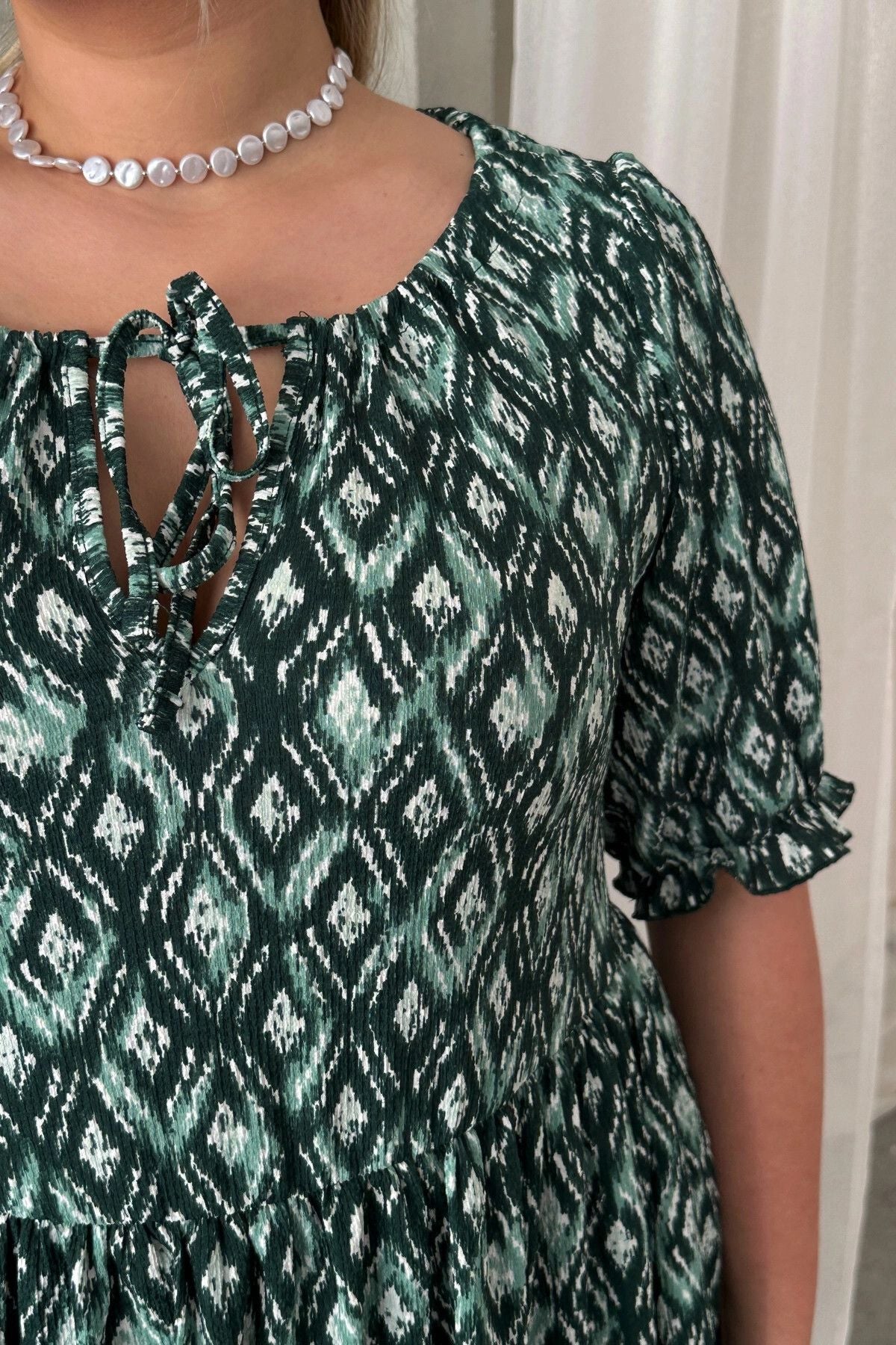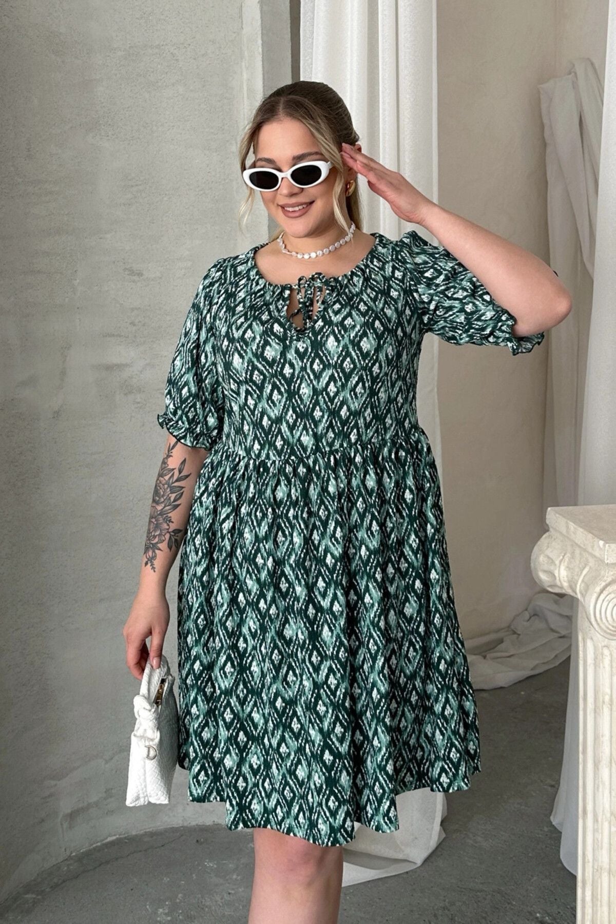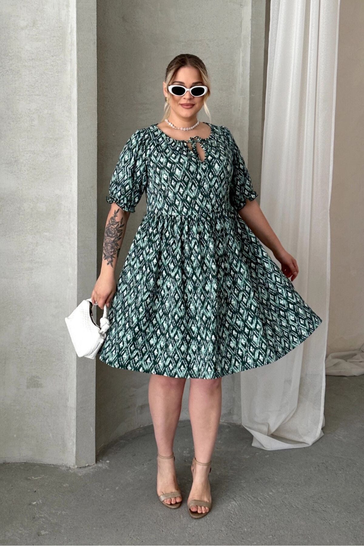 Büyük Beden Önü Bağlamalı Yarım Kollu Desenli Mini Elbise 101-8