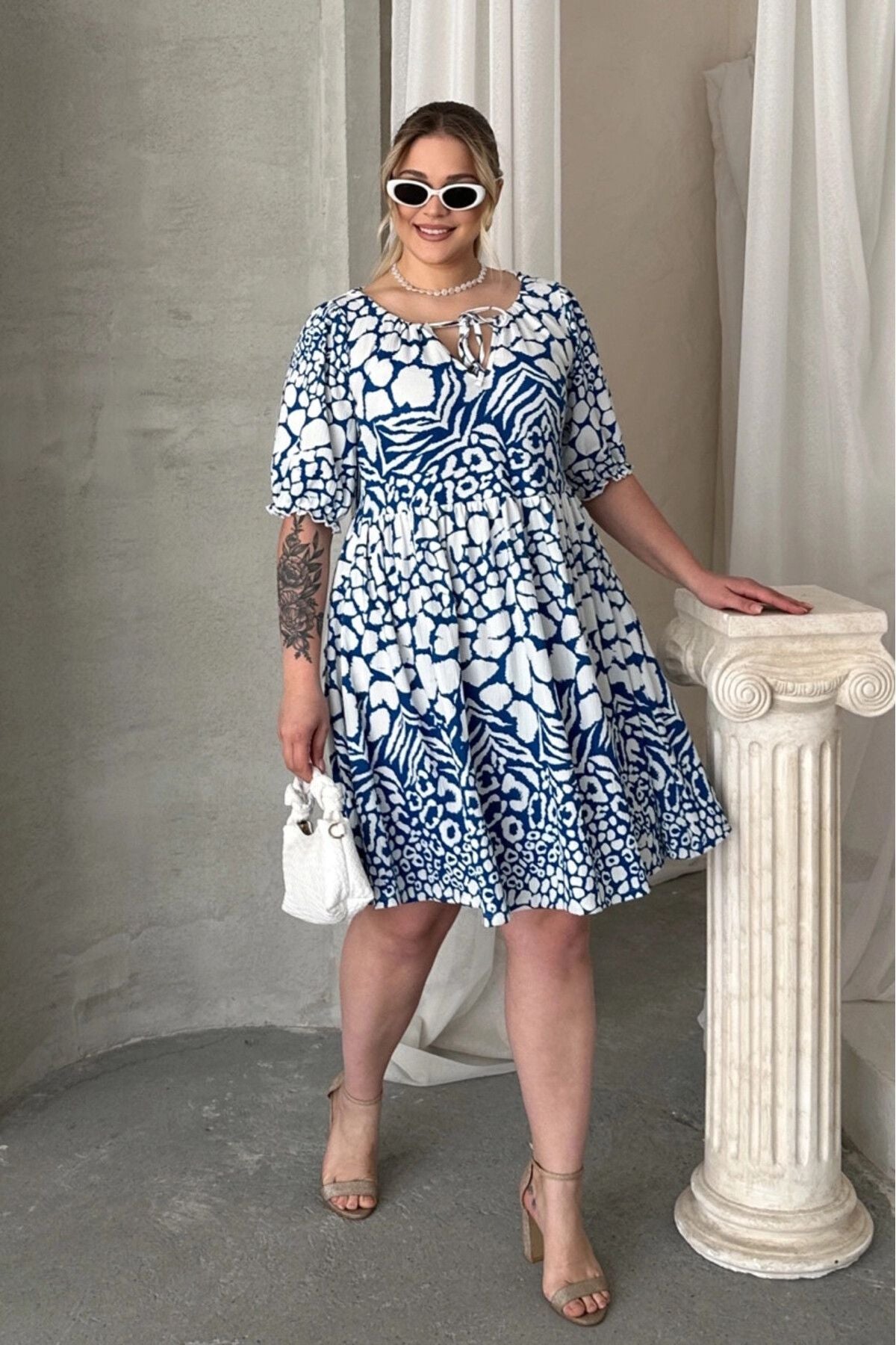 Büyük Beden Önü Bağlamalı Yarım Kollu Desenli Mini Elbise 101-9