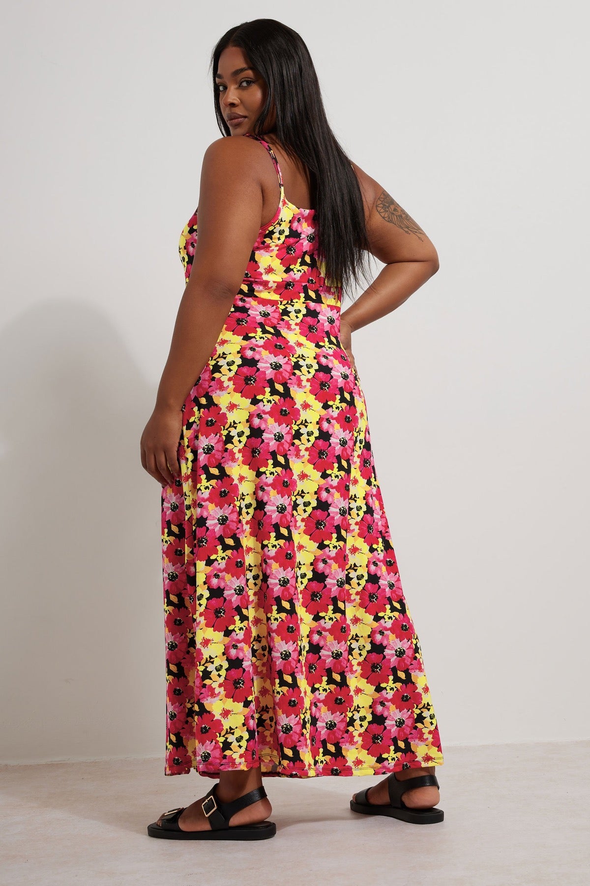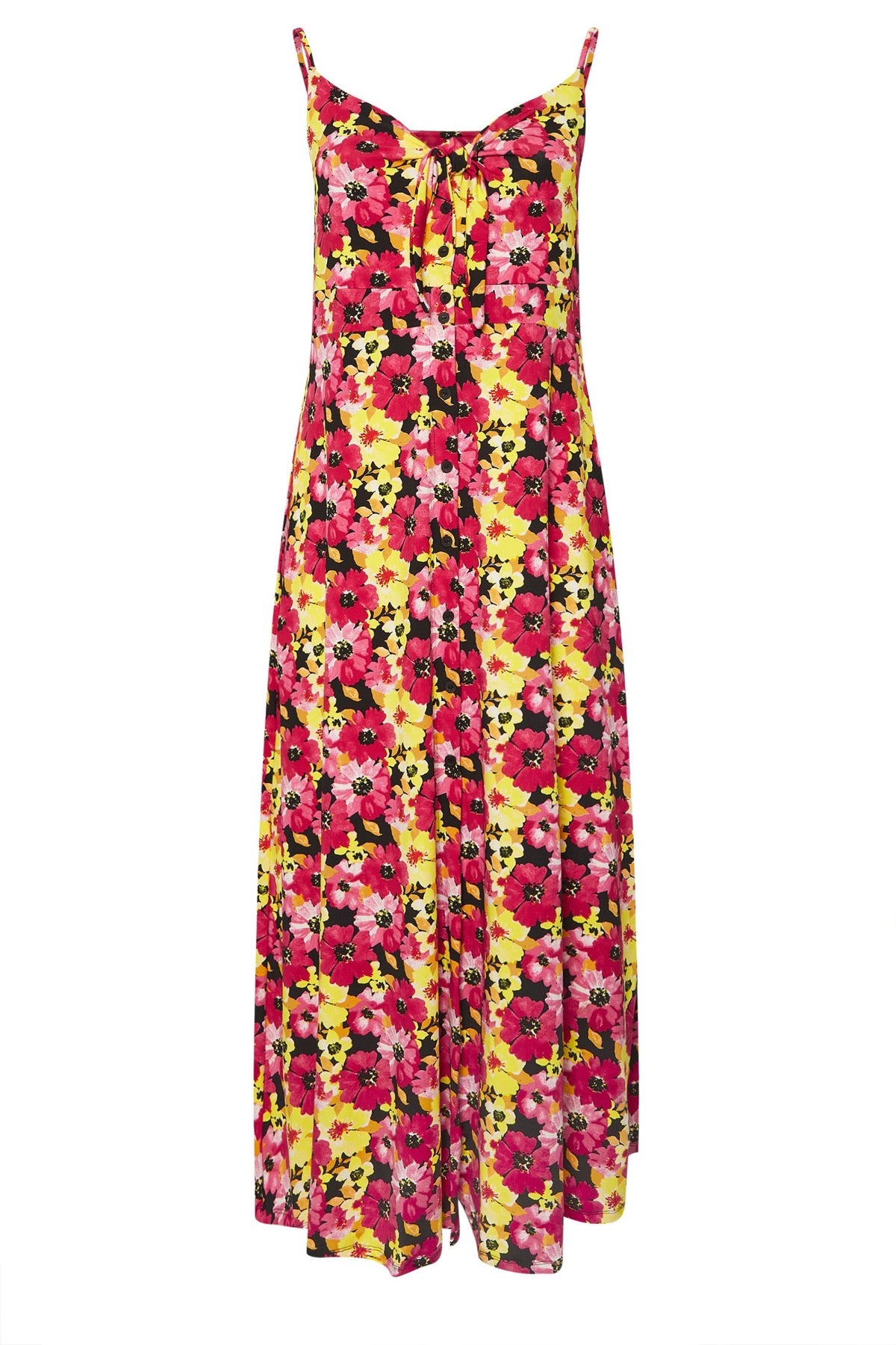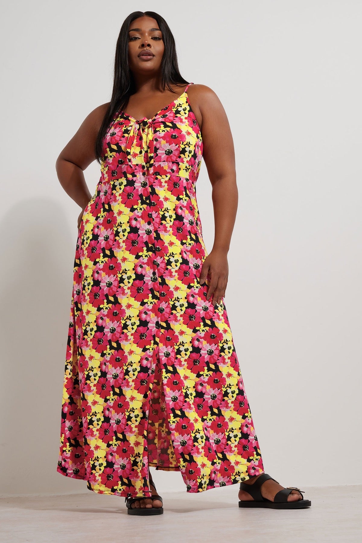 Büyük Beden Önü Büzgülü Askılı Çiçek Desenli Düğmeli Elbise 303481