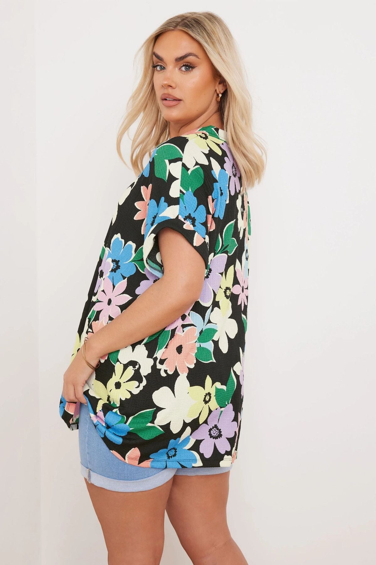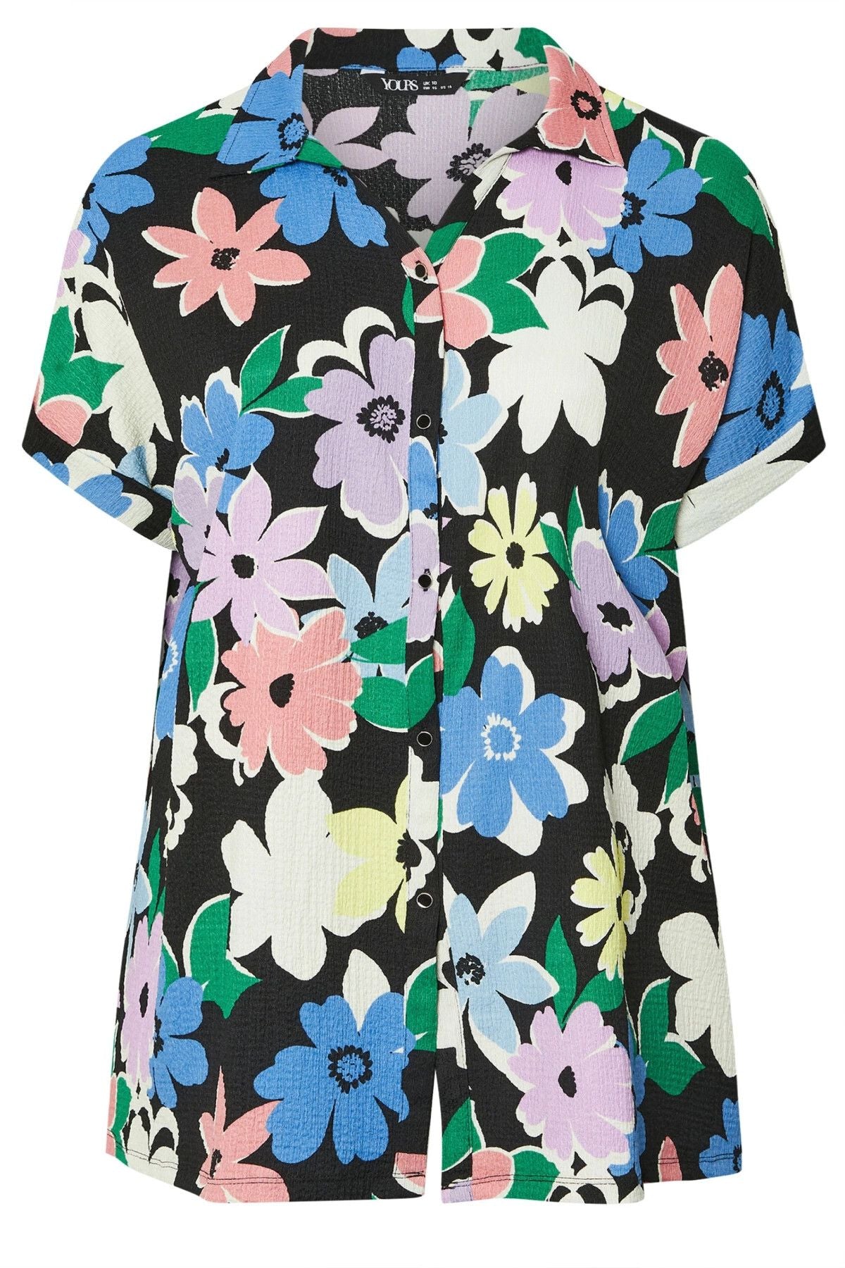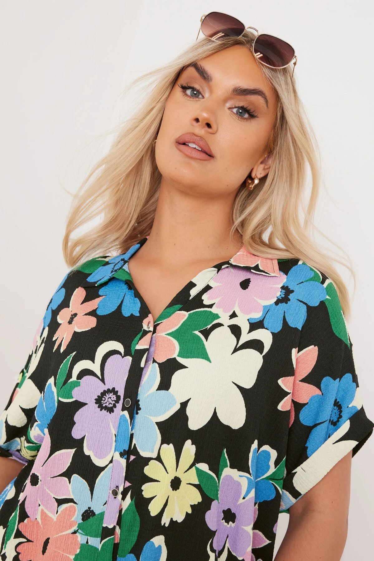 Büyük Beden Önü Düğmeli Kısa Kollu Çiçek Desenli Gömlek 303964