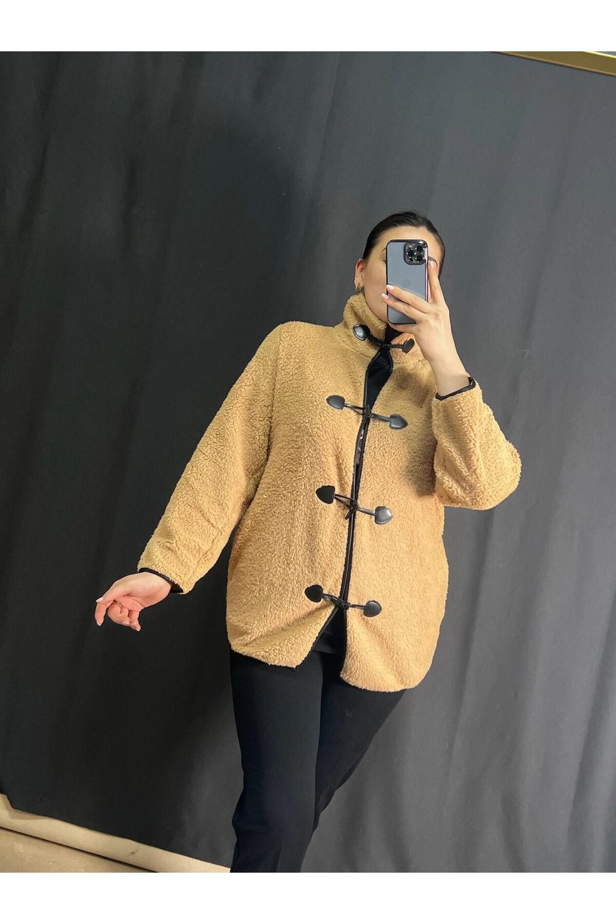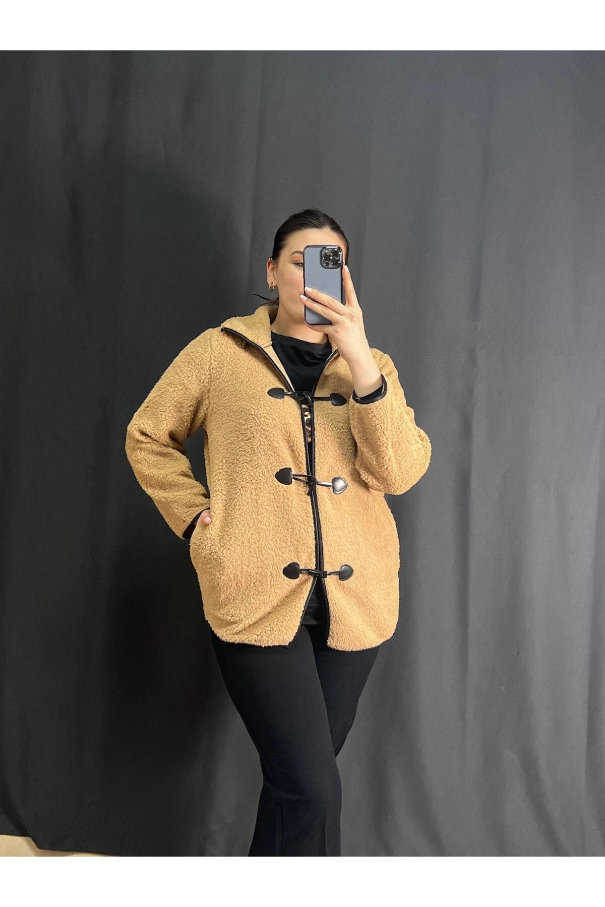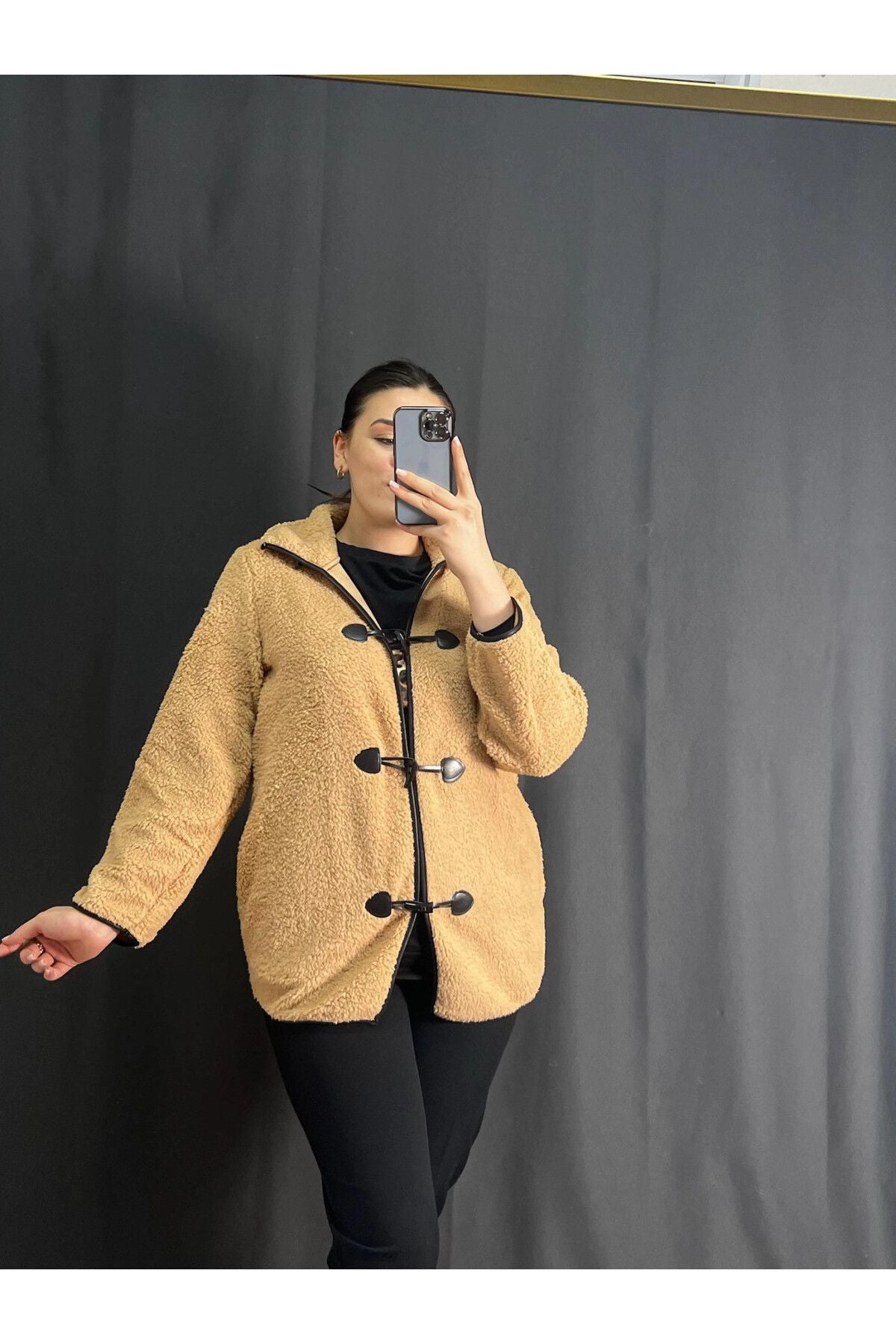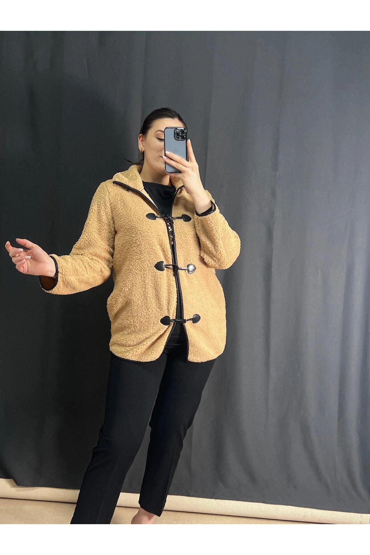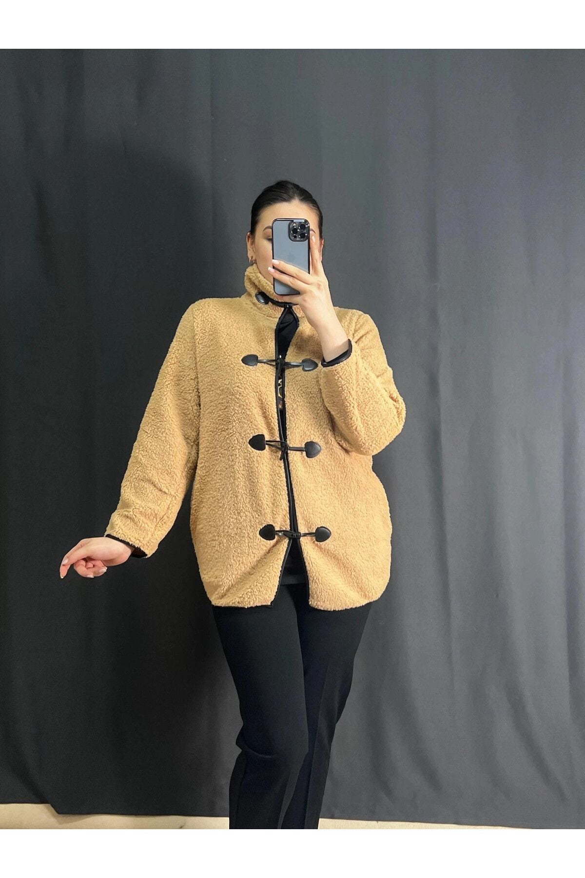 Büyük Beden Önü Kapamalı Cepli Uzun Kollu Peluş Mont 301817