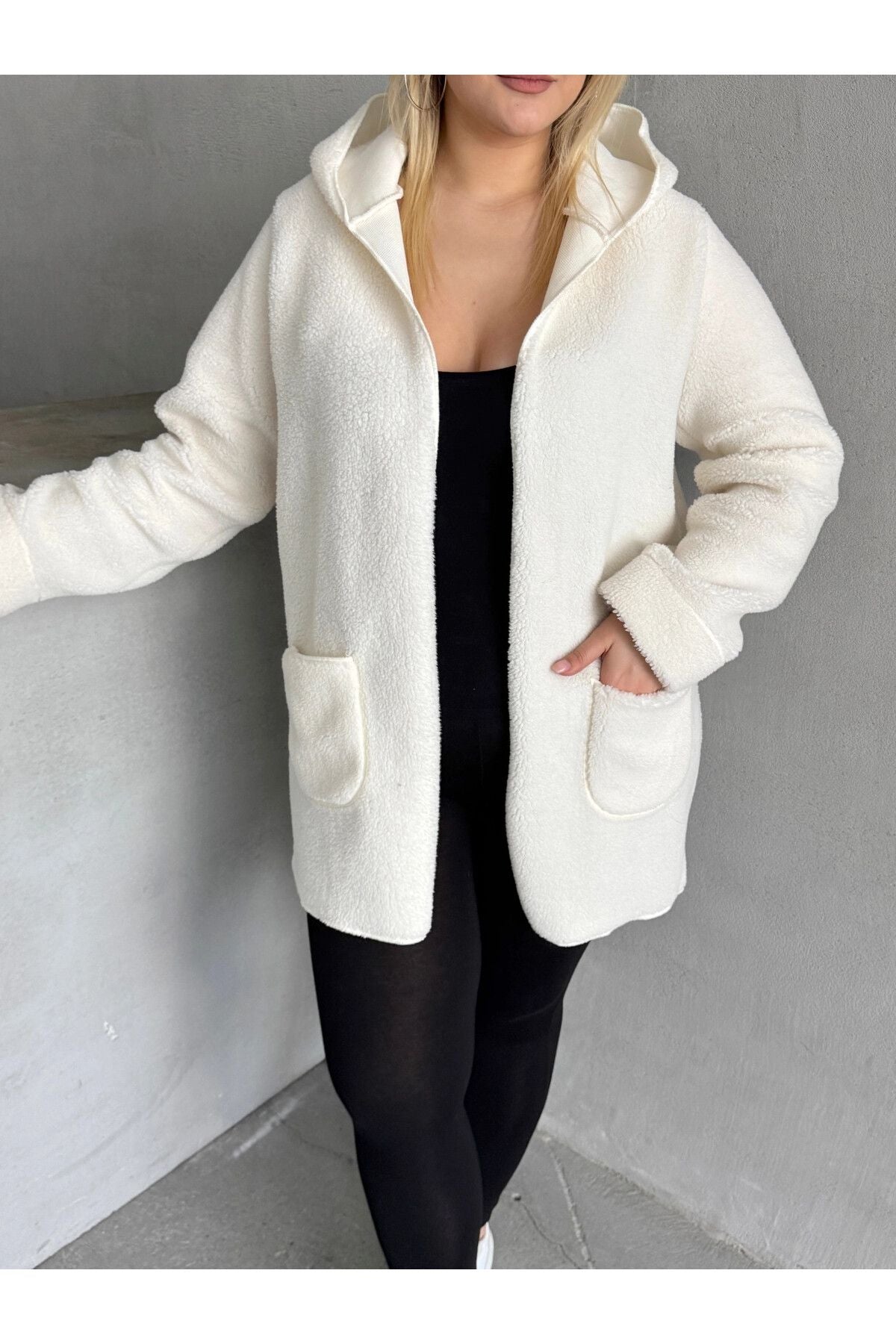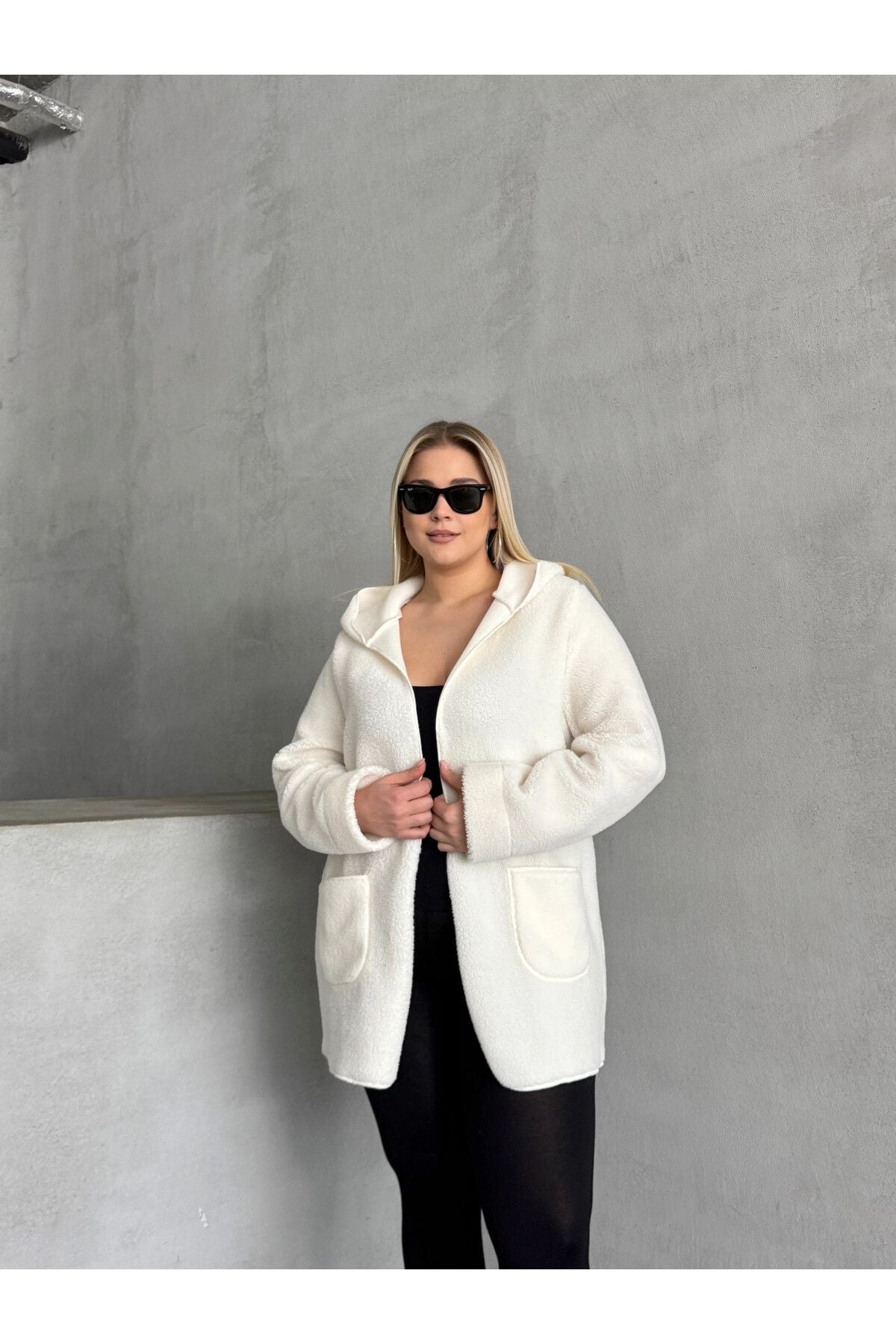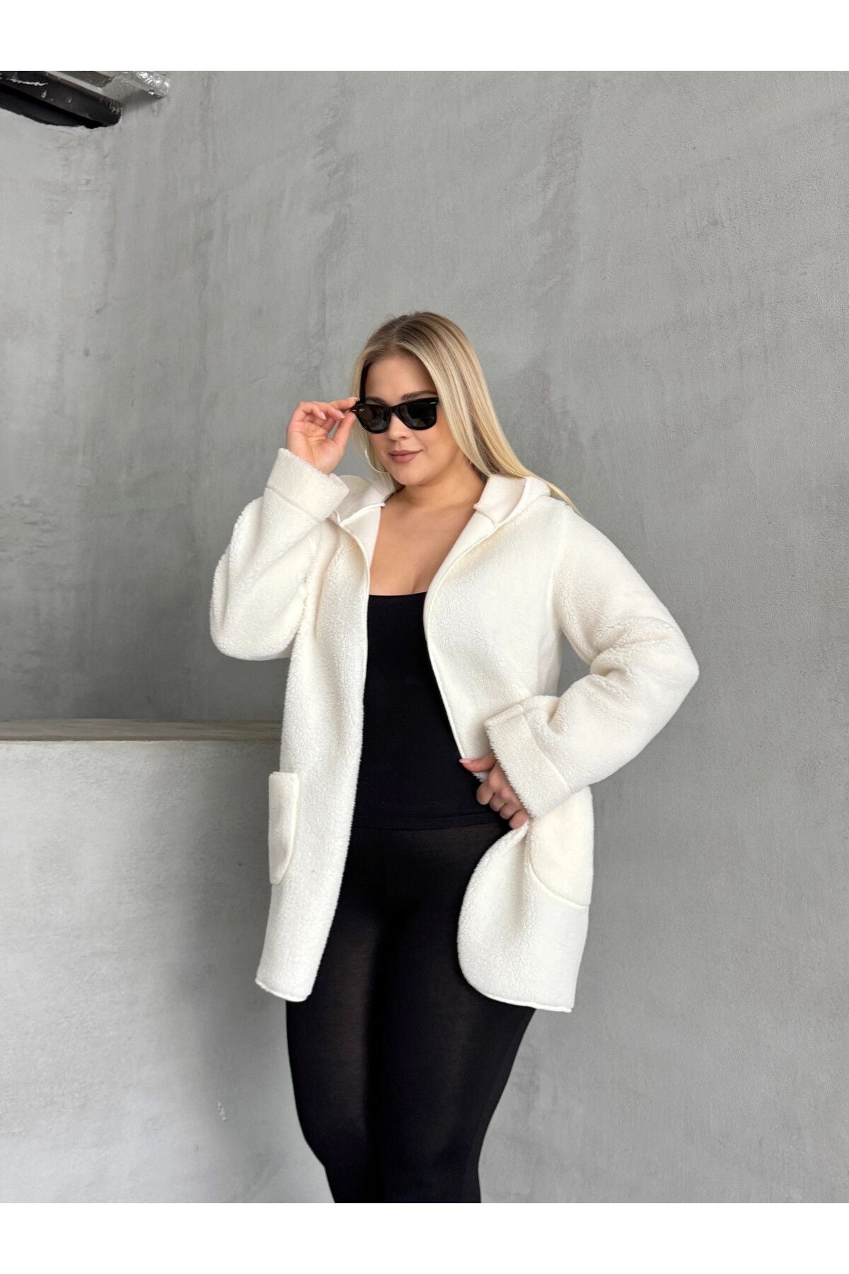 • Büyük Beden Önü Kapamasız Cepli Kapüşonlu İnce Peluş Ceket 301256