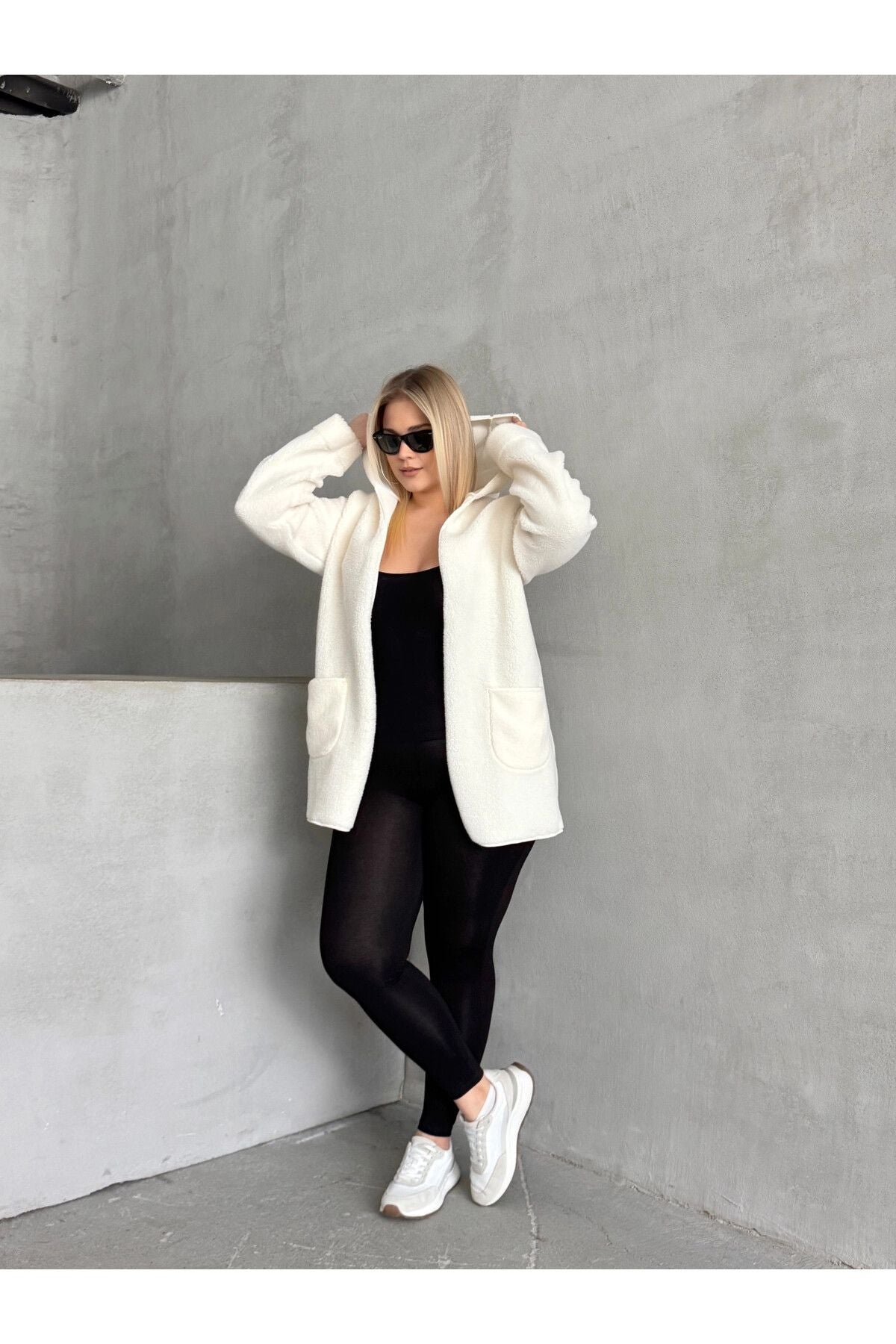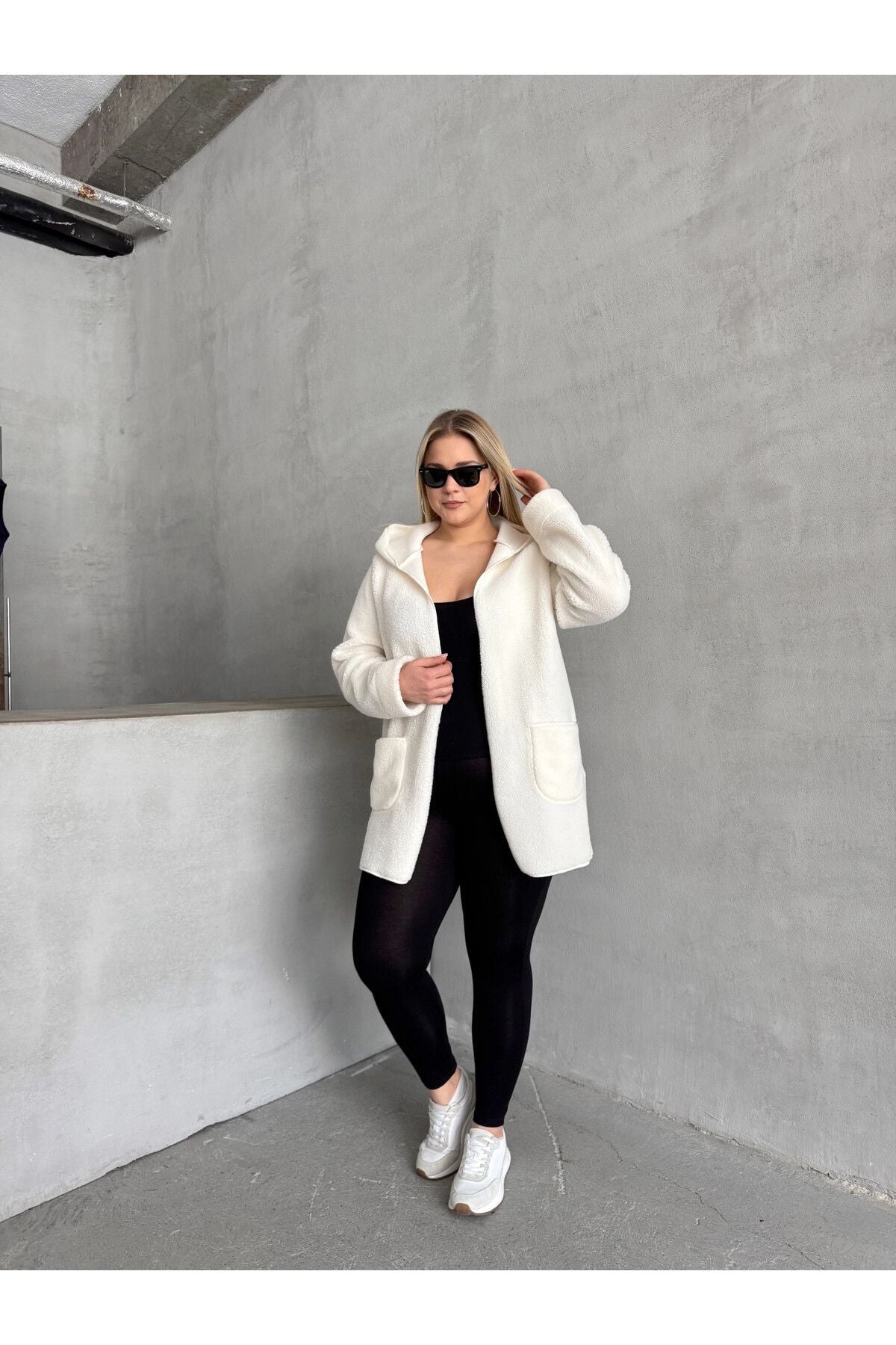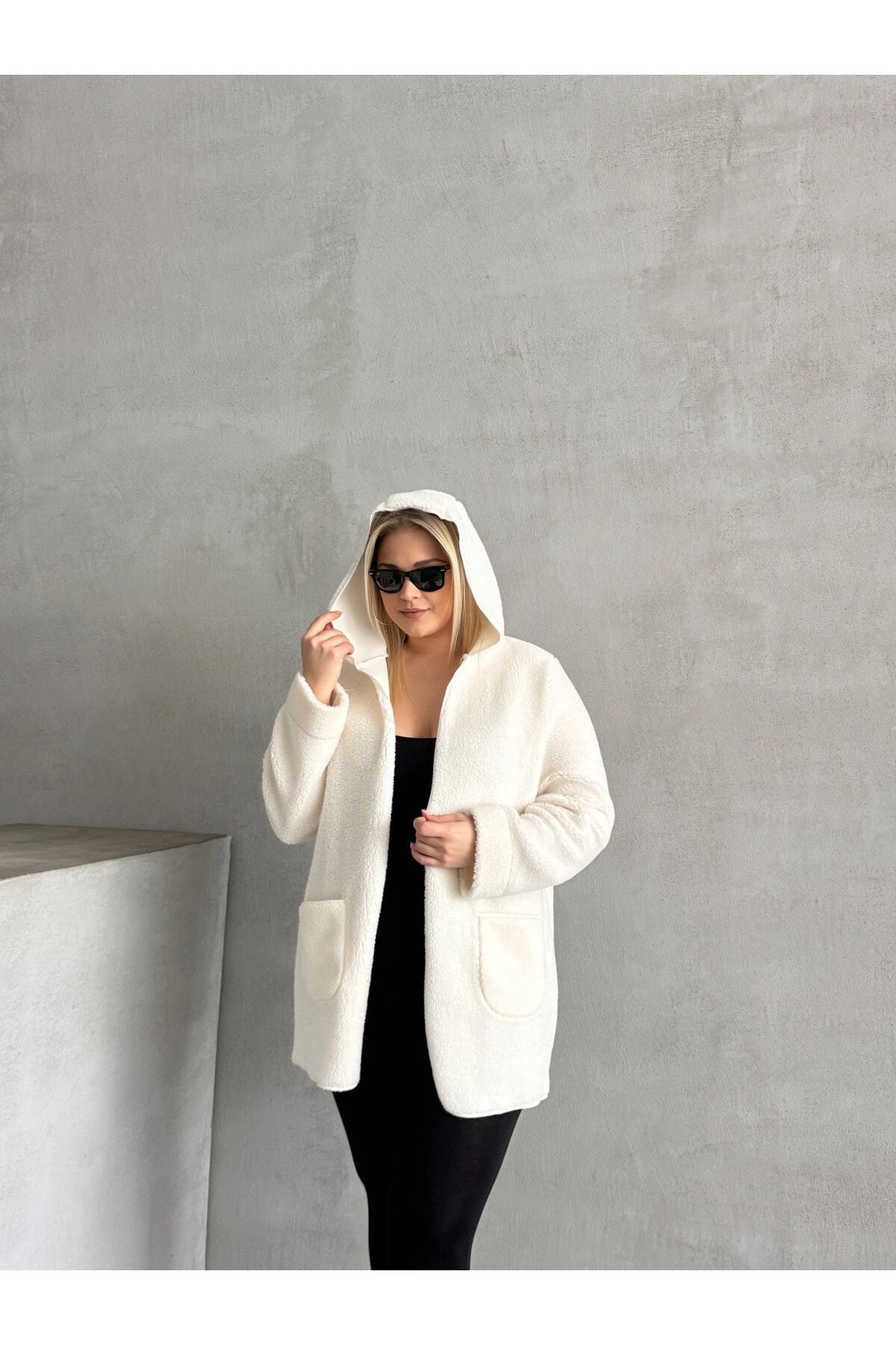 • Büyük Beden Önü Kapamasız Cepli Kapüşonlu İnce Peluş Ceket 301256