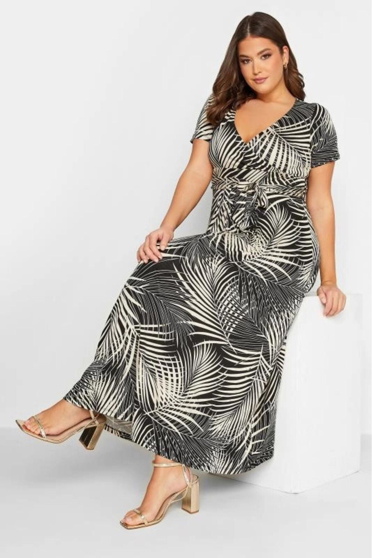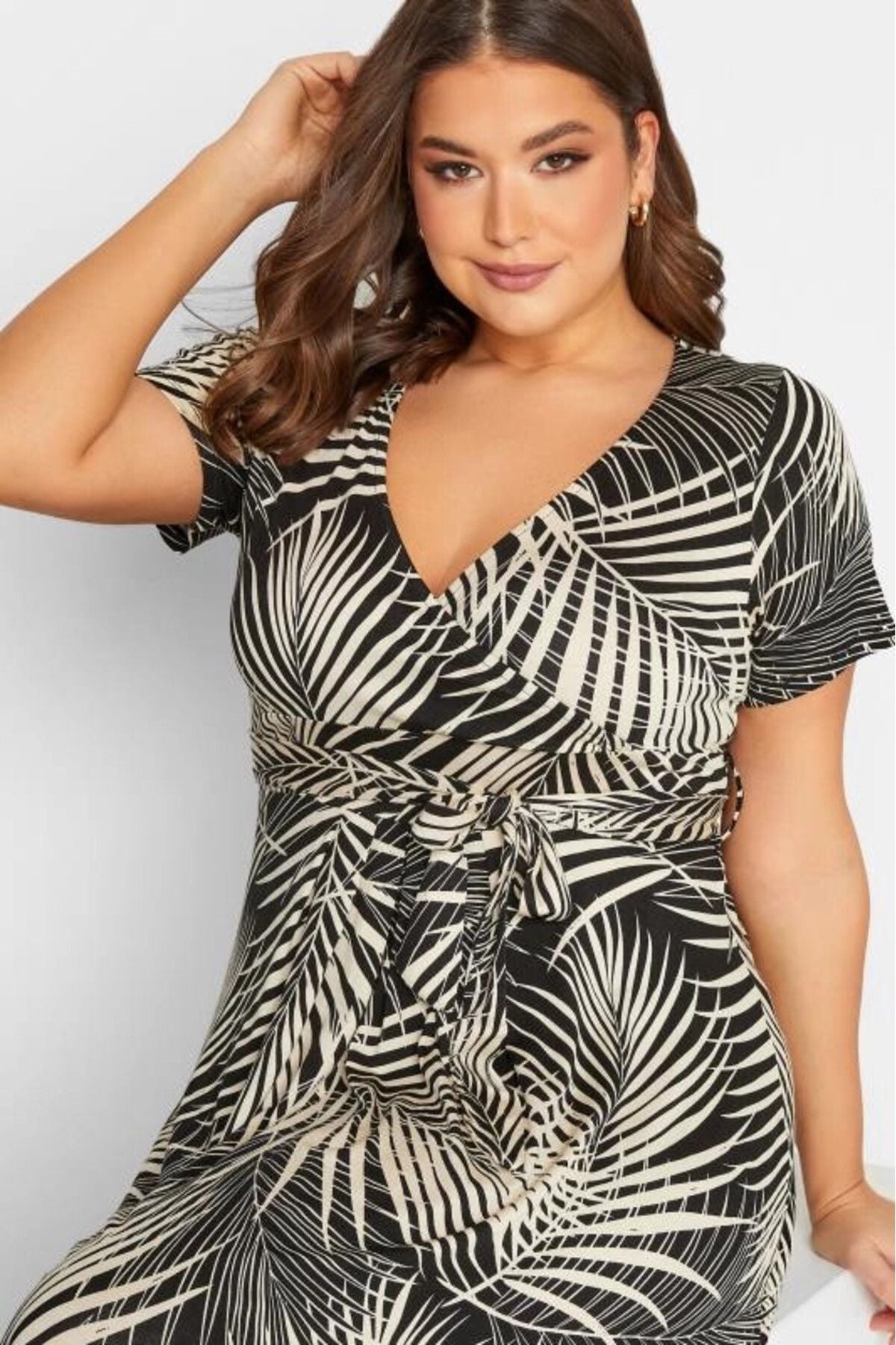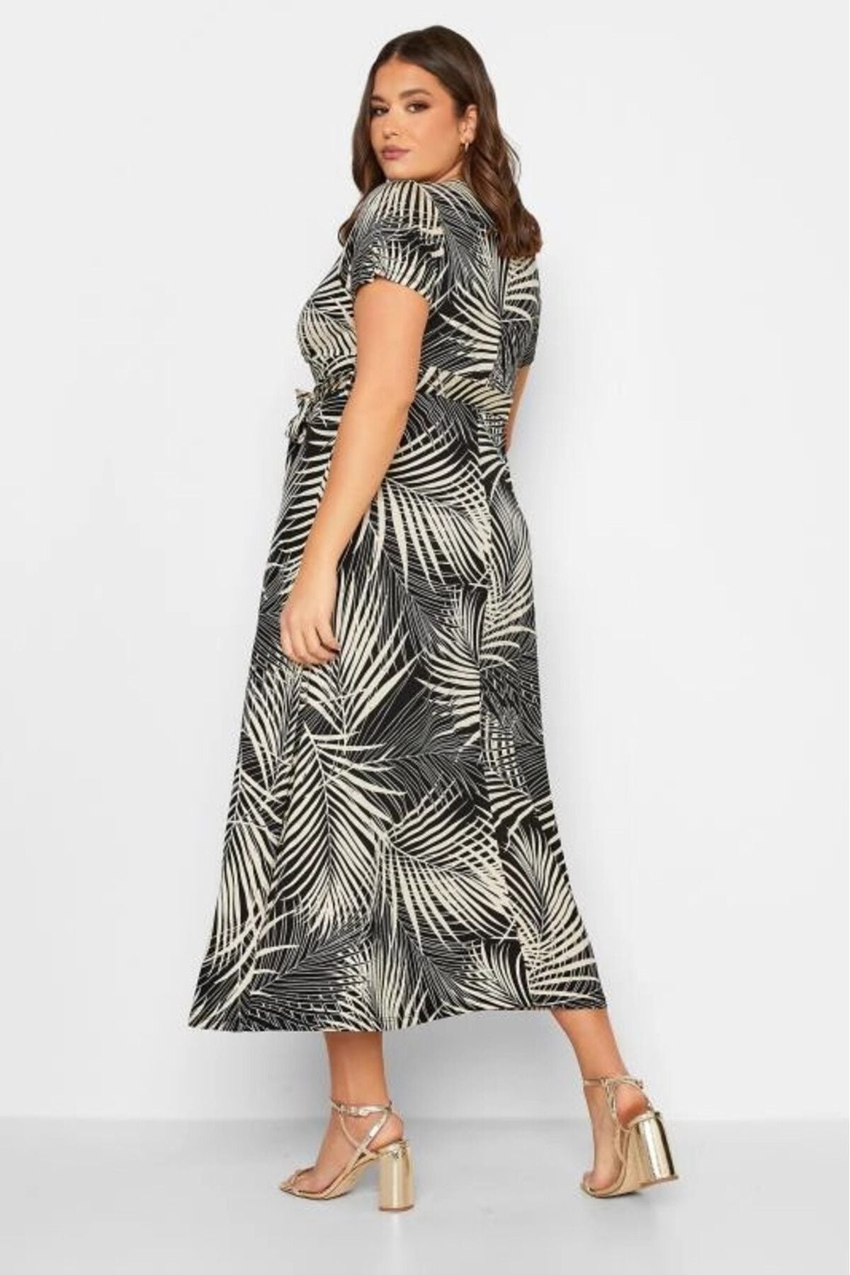 Büyük Beden Palmiye Desenli V Yaka Yarım Kollu Kuşaklı Elbise 301599