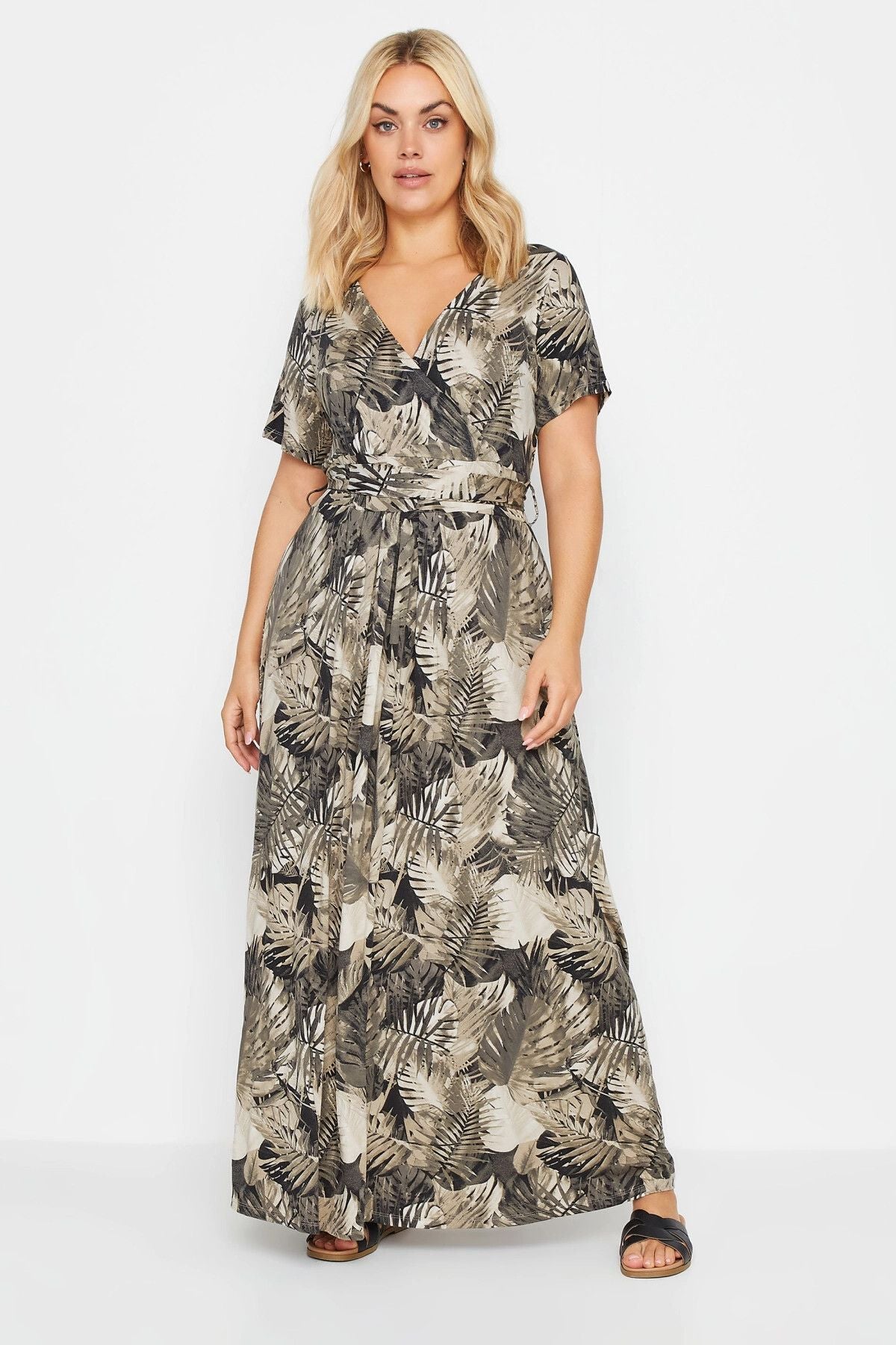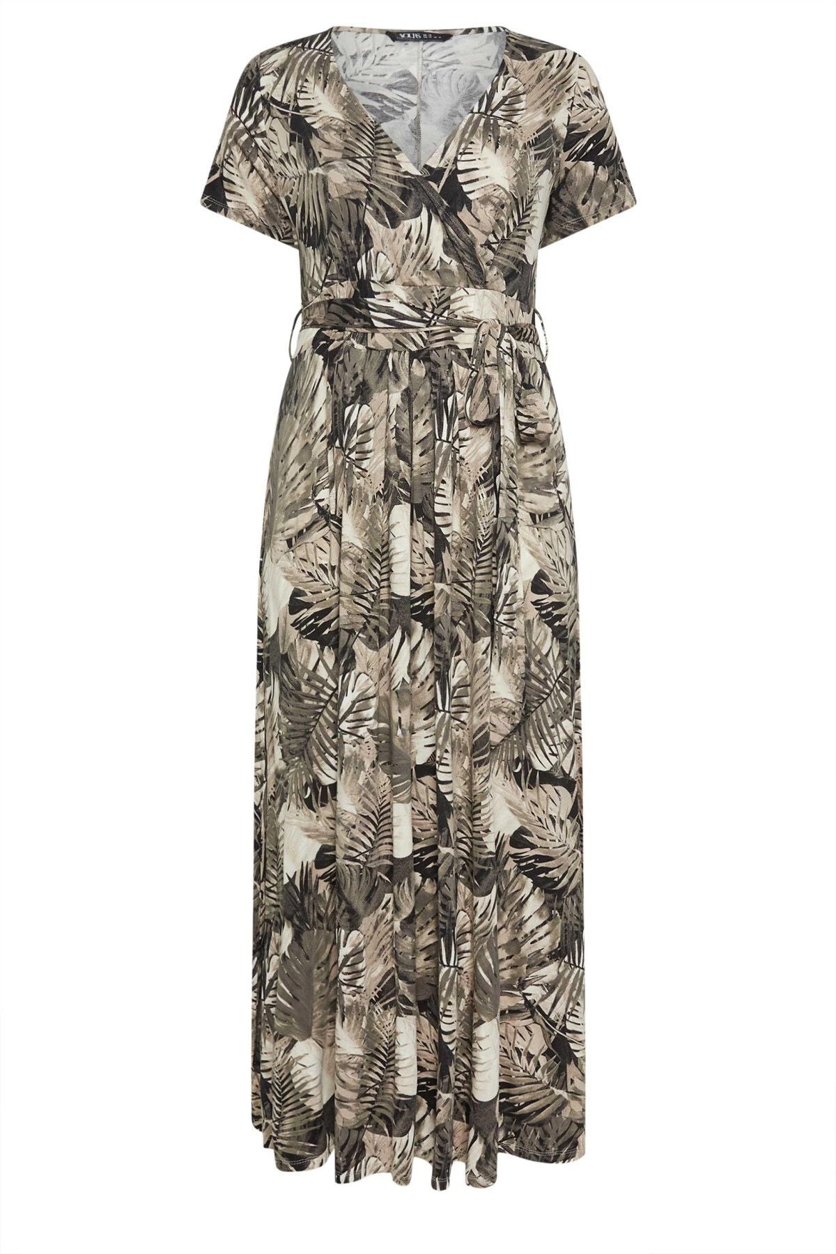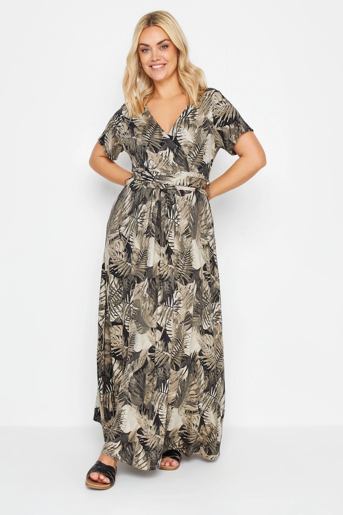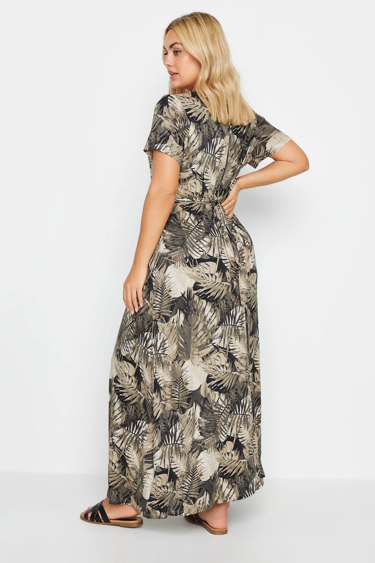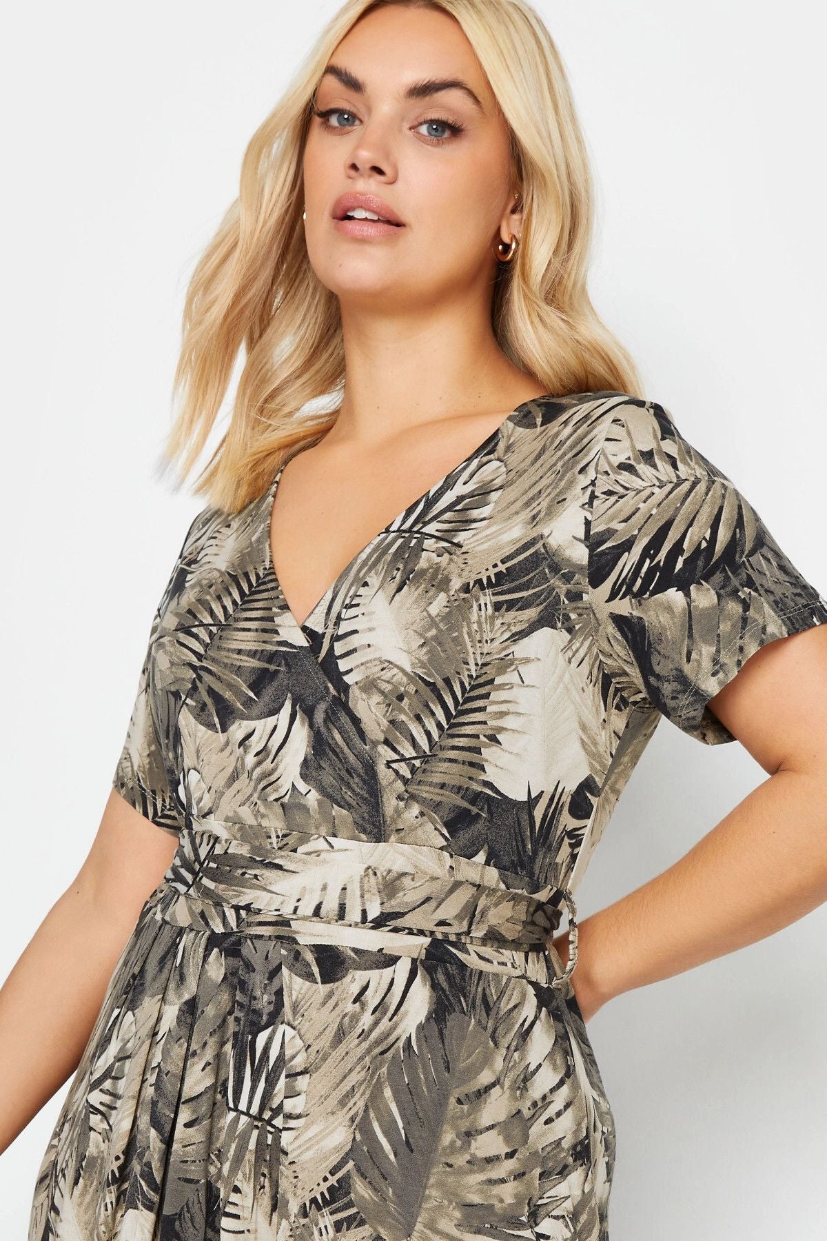 Büyük Beden Palmiye Desenli V Yaka Yarım Kollu Kuşaklı Elbise 303031