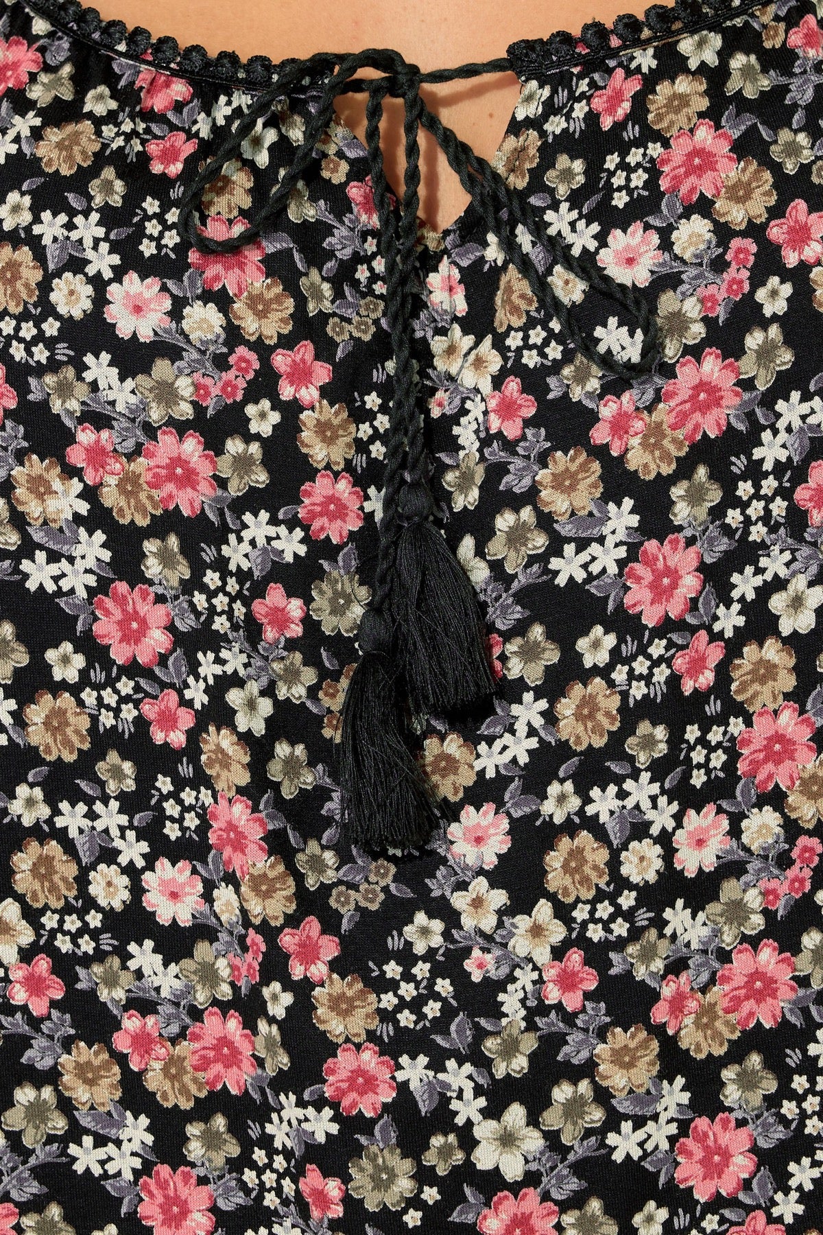 Büyük Beden Sıfır Kol Yaka Detaylı Çiçek Desenli T-shirt 304240