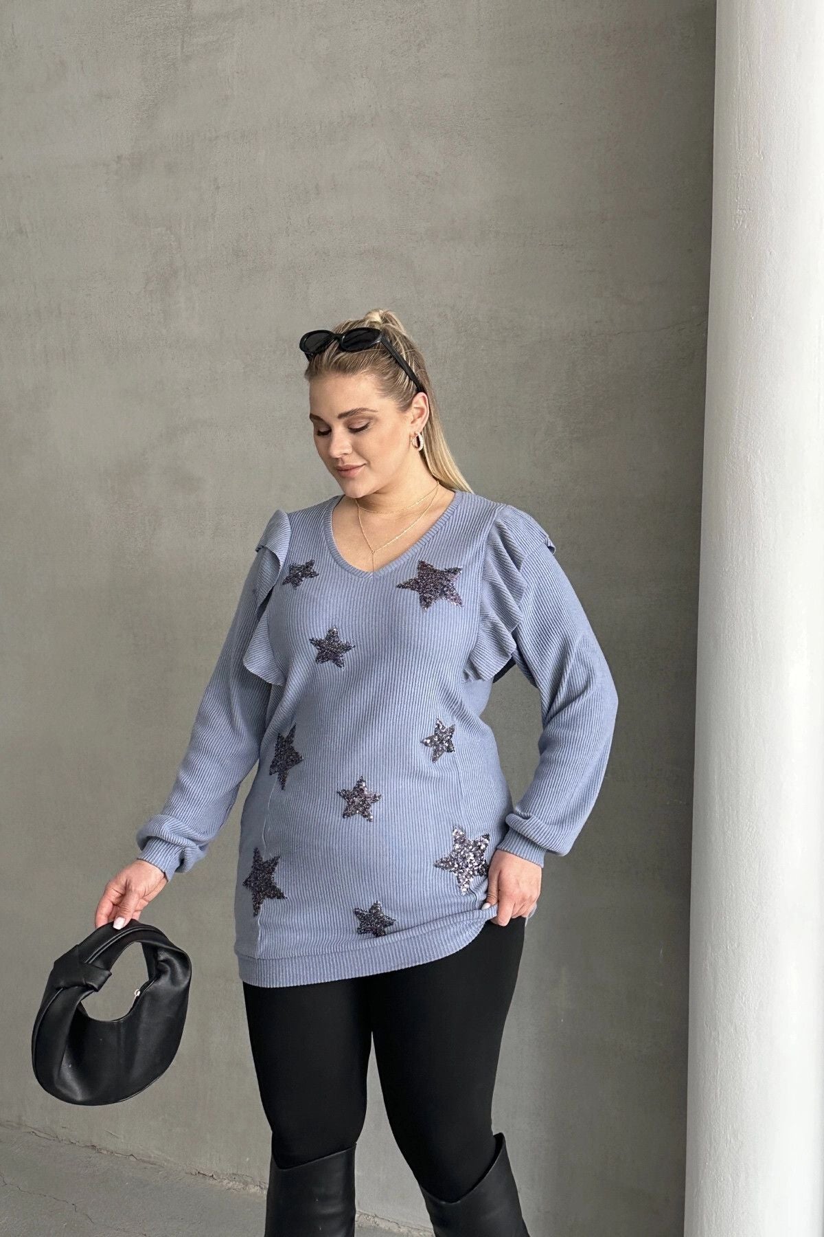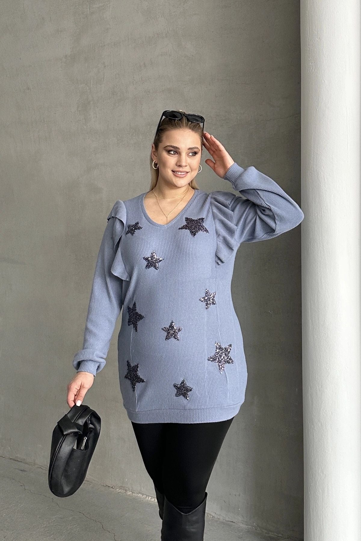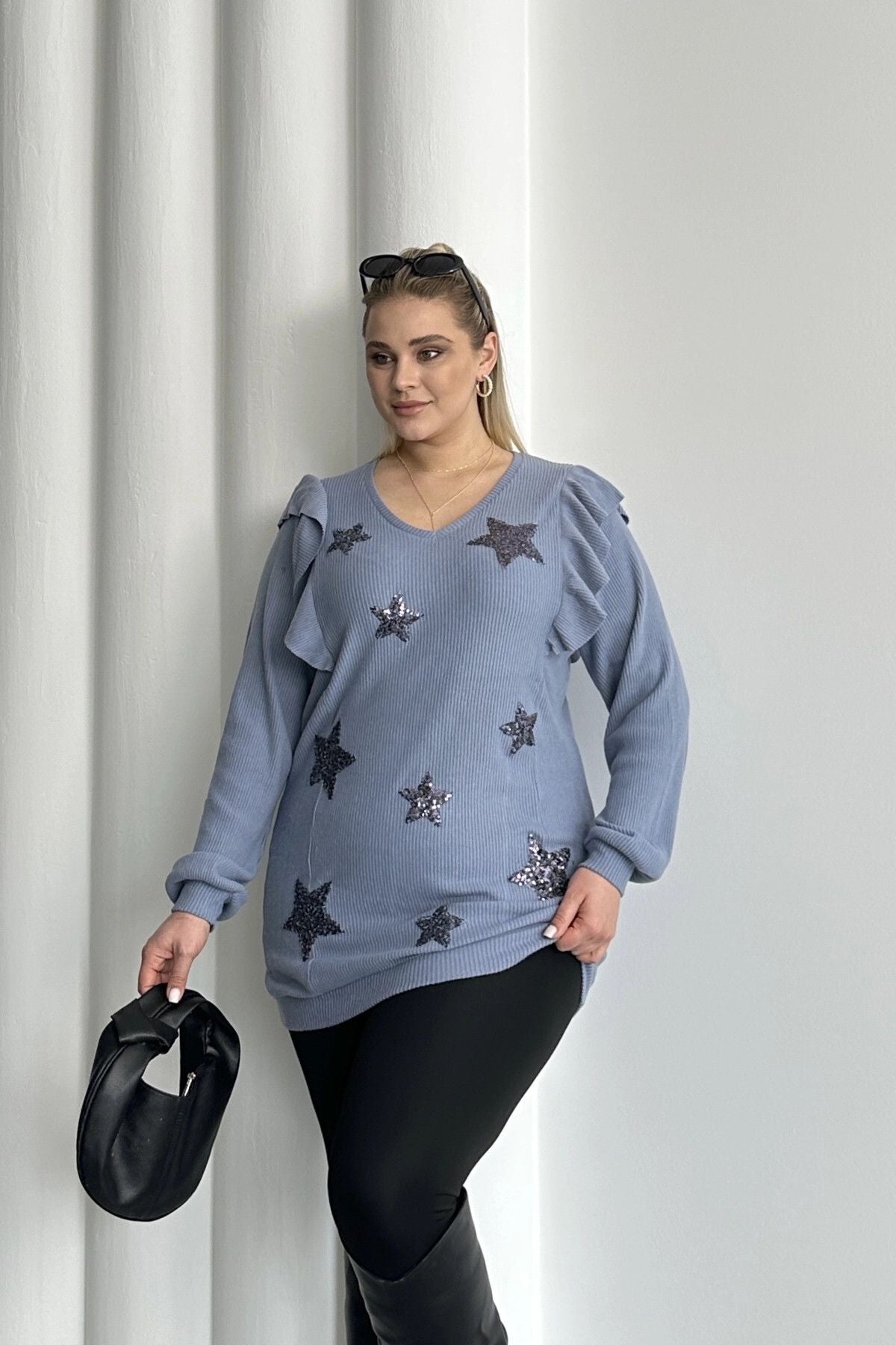 Moda Notu: Büyük Beden Uzun Kolları Fırfırlı Yıldız Desen İşlemeli Bluz, şıklık ve rahatlığı bir araya getiren özel bir tasarım. V yaka kesimi ile feminen bir görünüm sunarken, uzun kollarındaki fırfır detayları modern bir dokunuş katıyor. Üzerindeki yıldız desenli işlemeler, bluza zarif ve dikkat çekici bir hava veriyor. Hem günlük kullanımda hem de özel günlerde tercih edebileceğiniz bu şık parça, gardırobunuzun vazgeçilmez bir unsuru olacak. Makinede yıkanabilir özelliği ile bakımı da kolaydır.