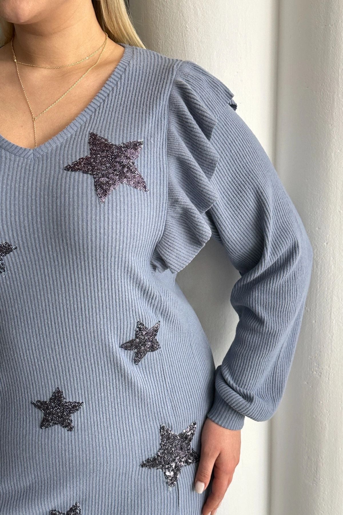 Model Detayı: V yaka, uzun kollu, fırfırlı kollar, yıldız desenli işlemeli