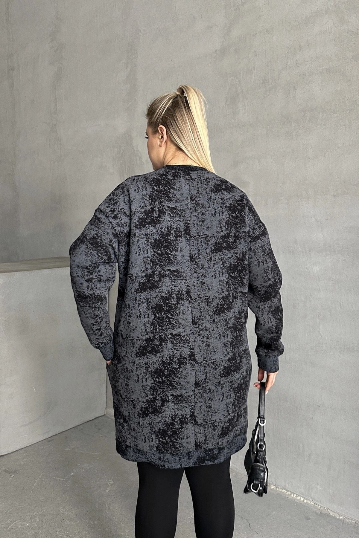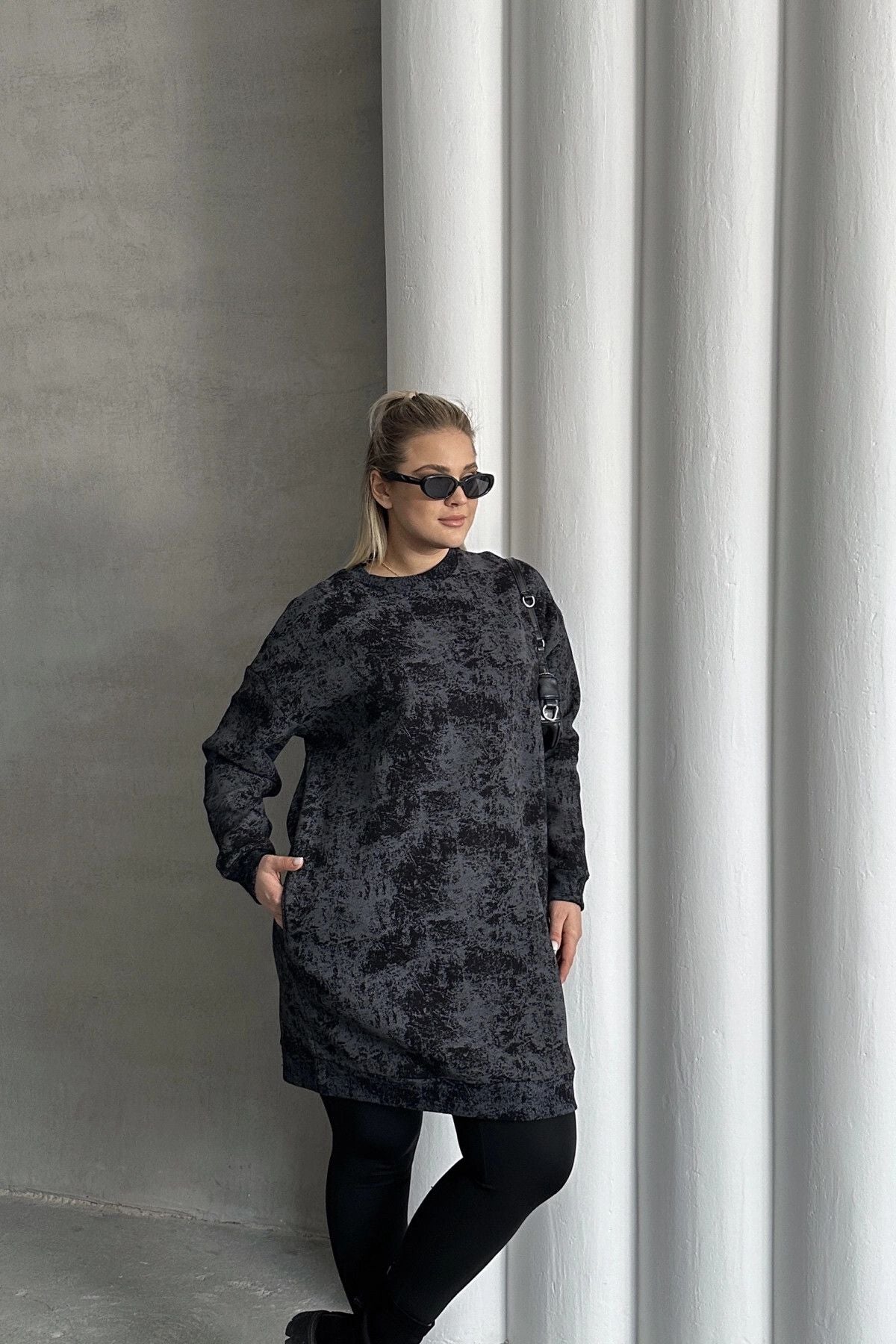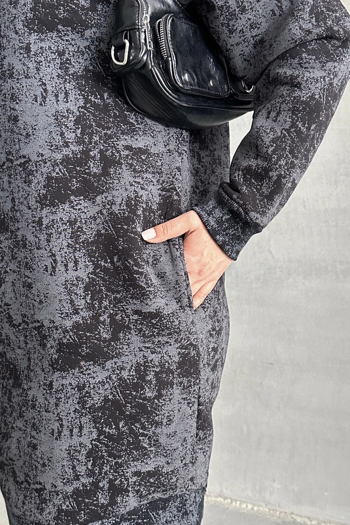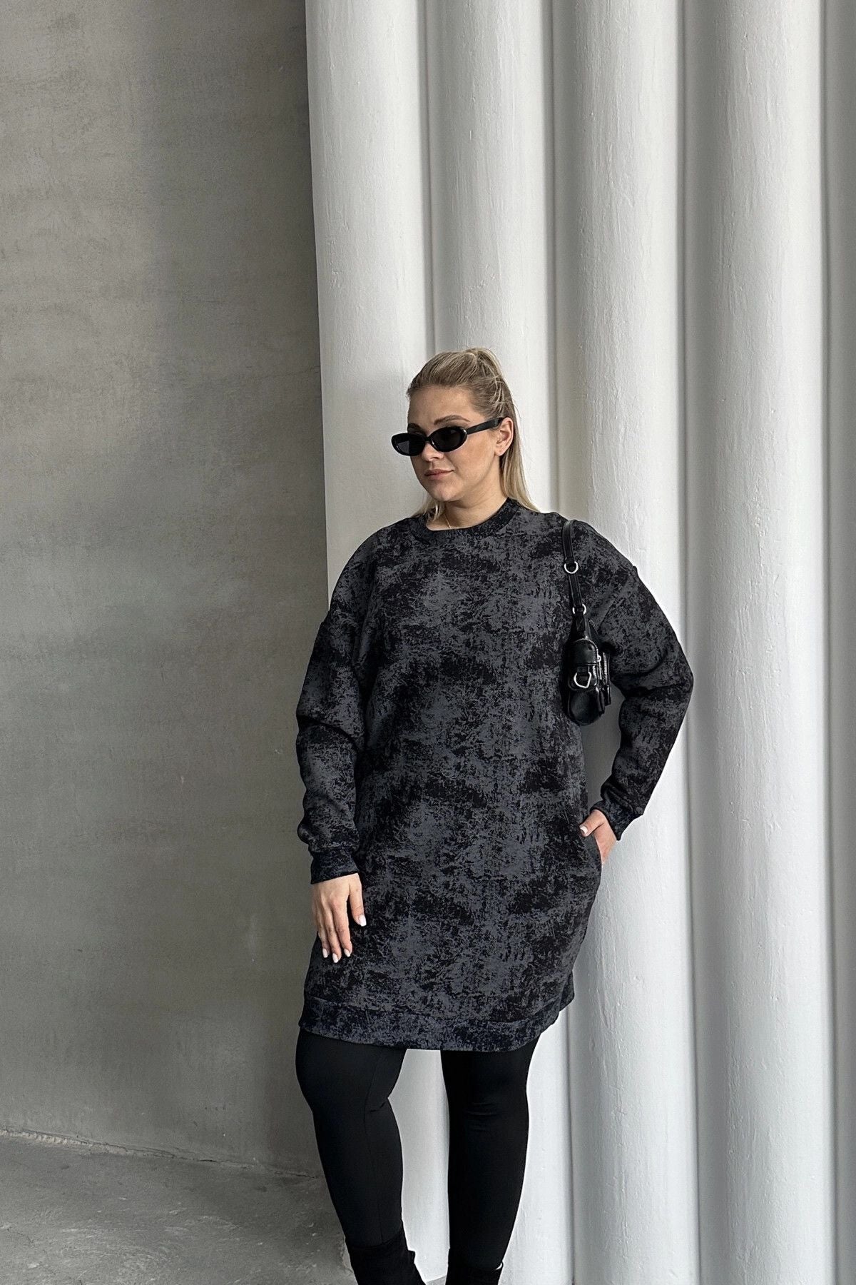 Büyük Beden Uzun Kollu Bisiklet Yaka Cepli Desenli Elbise 106-75