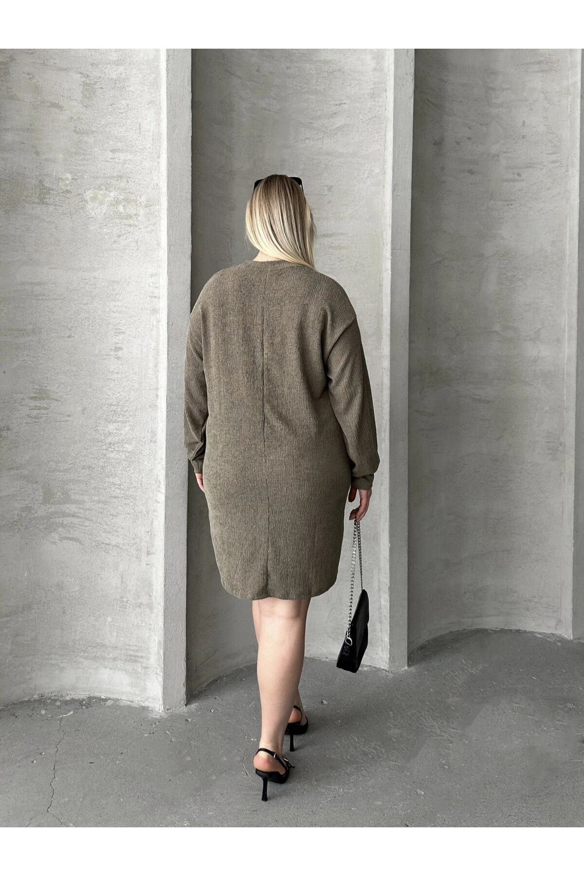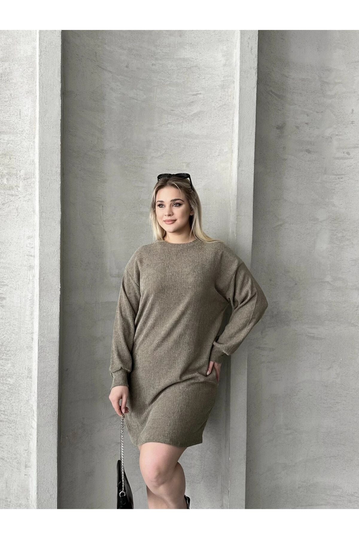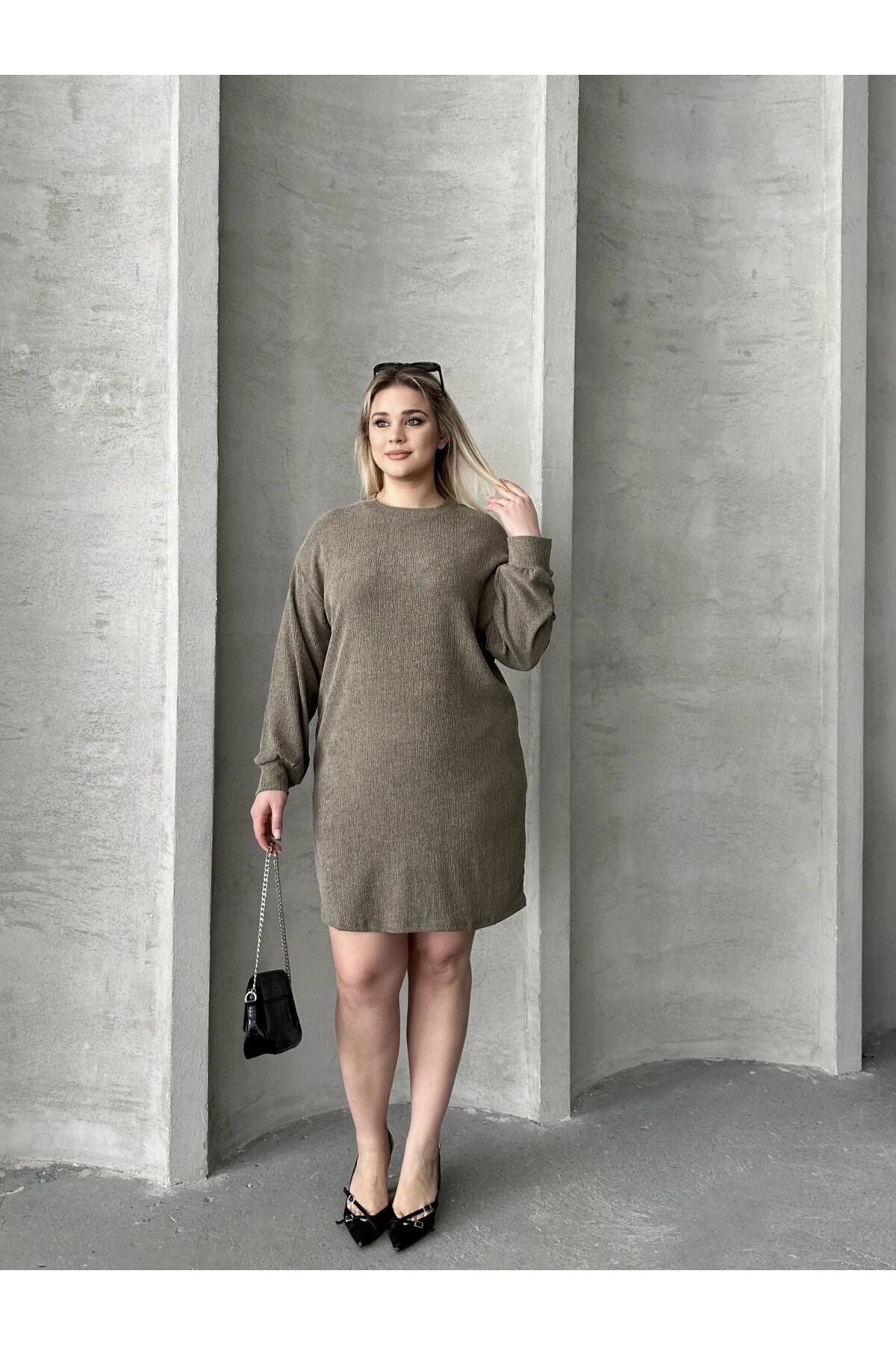 Büyük Beden Uzun Kollu Bisiklet Yaka Düz Kesim Elbise 106-97