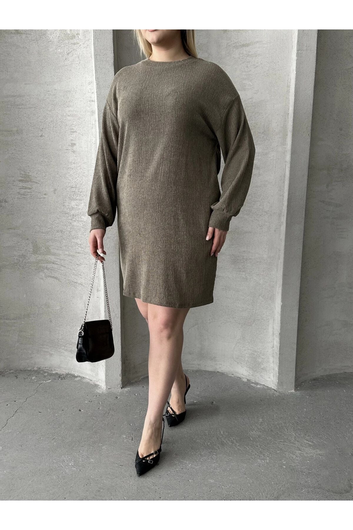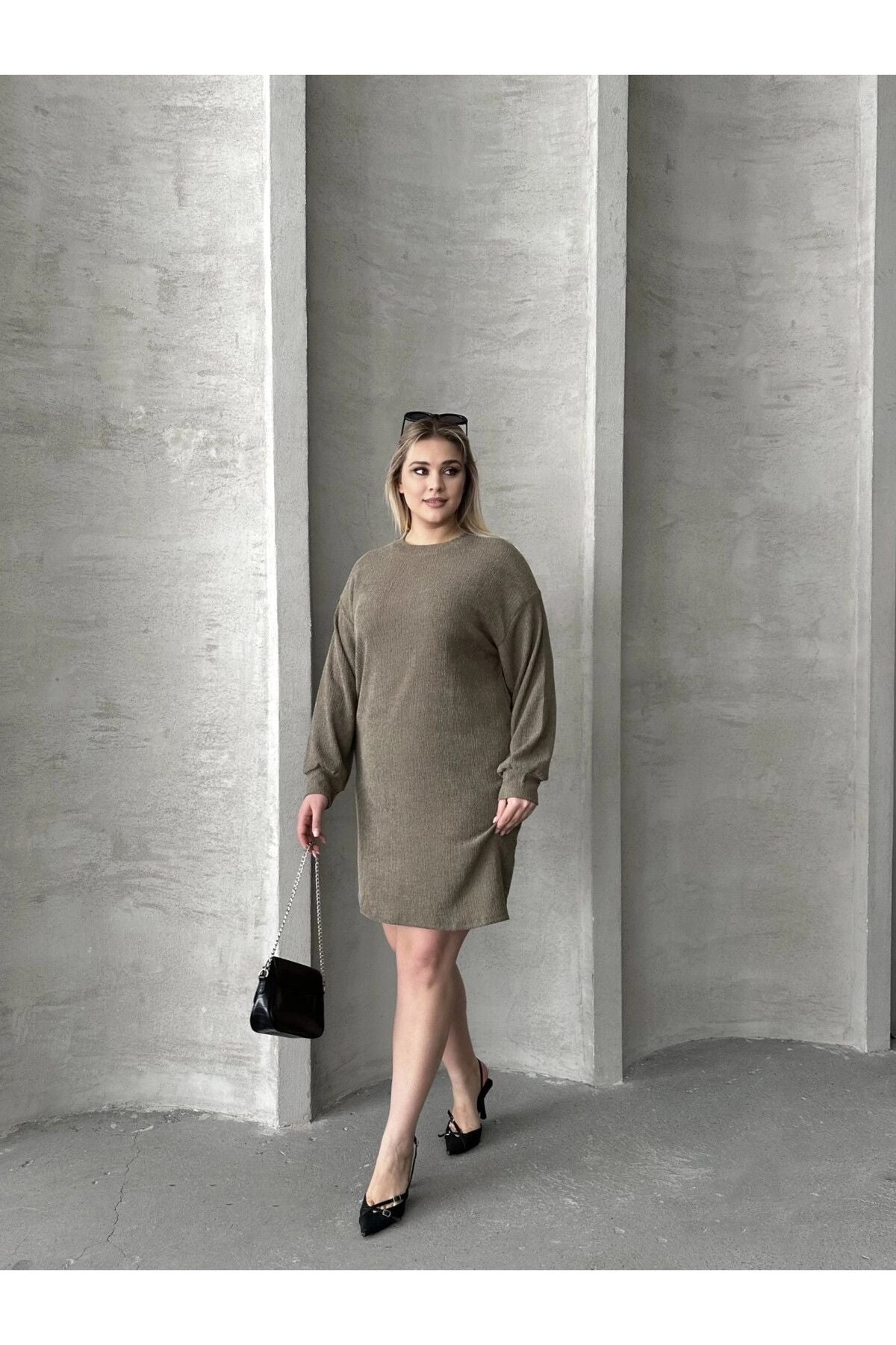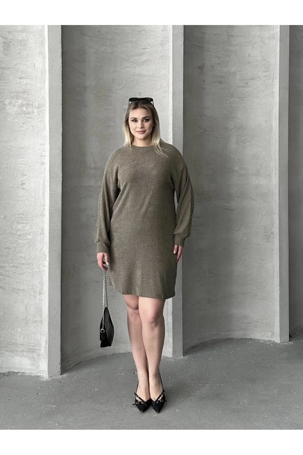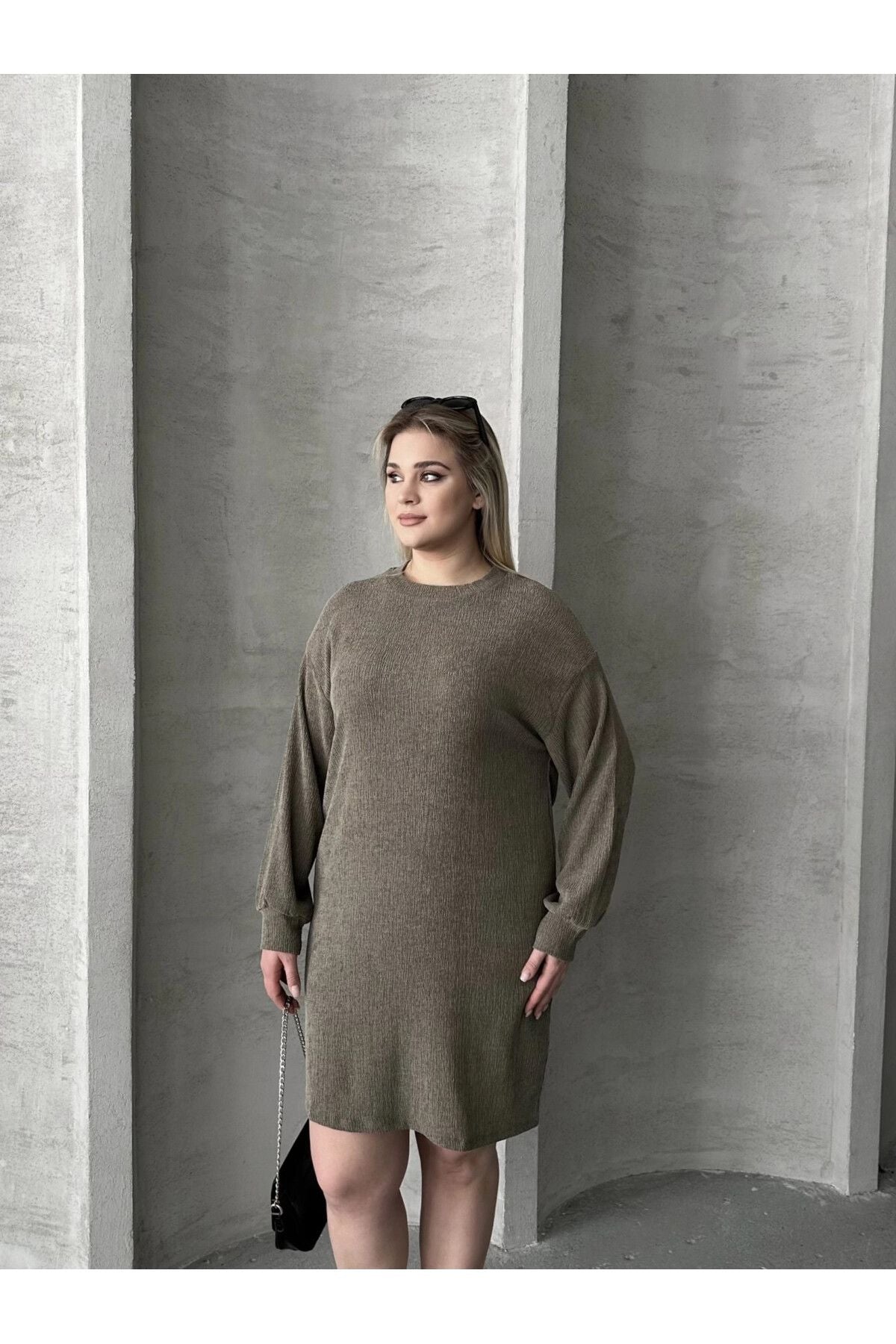 Büyük Beden Uzun Kollu Bisiklet Yaka Düz Kesim Elbise 106-97