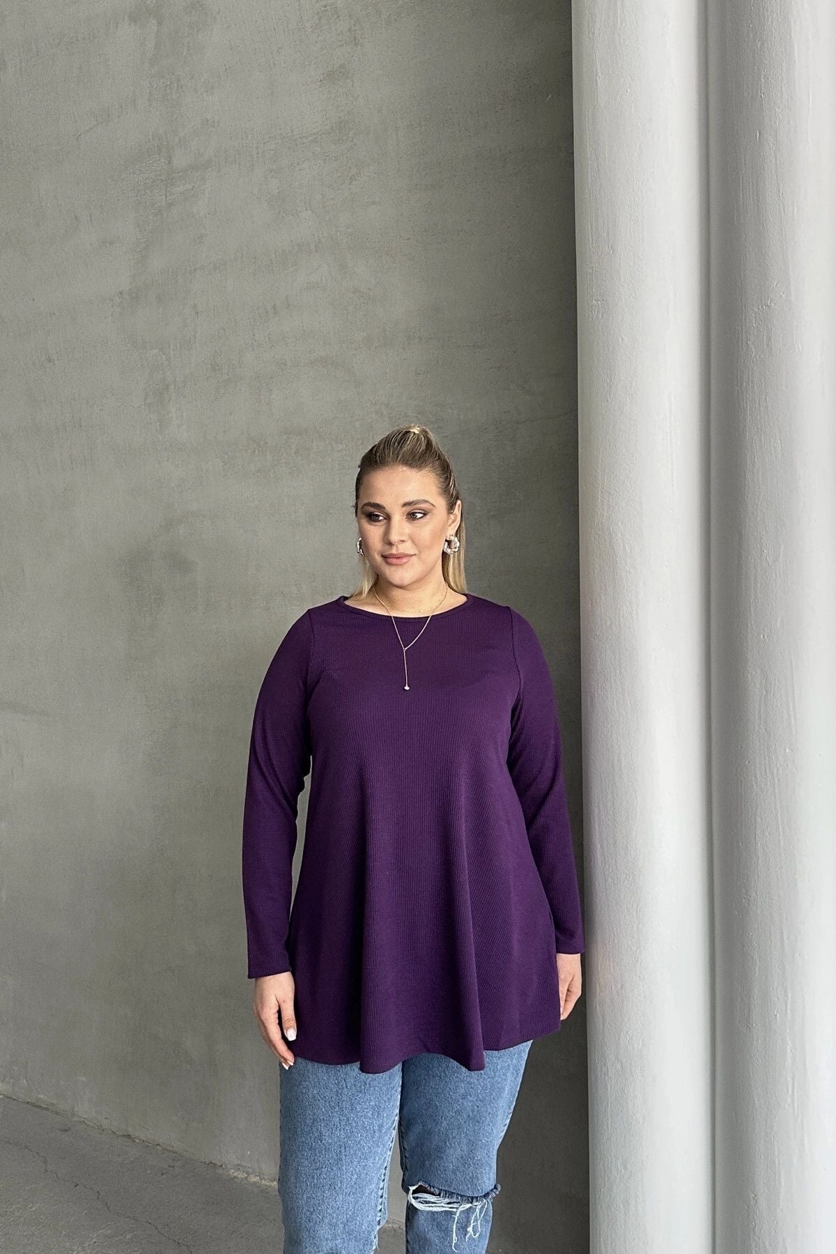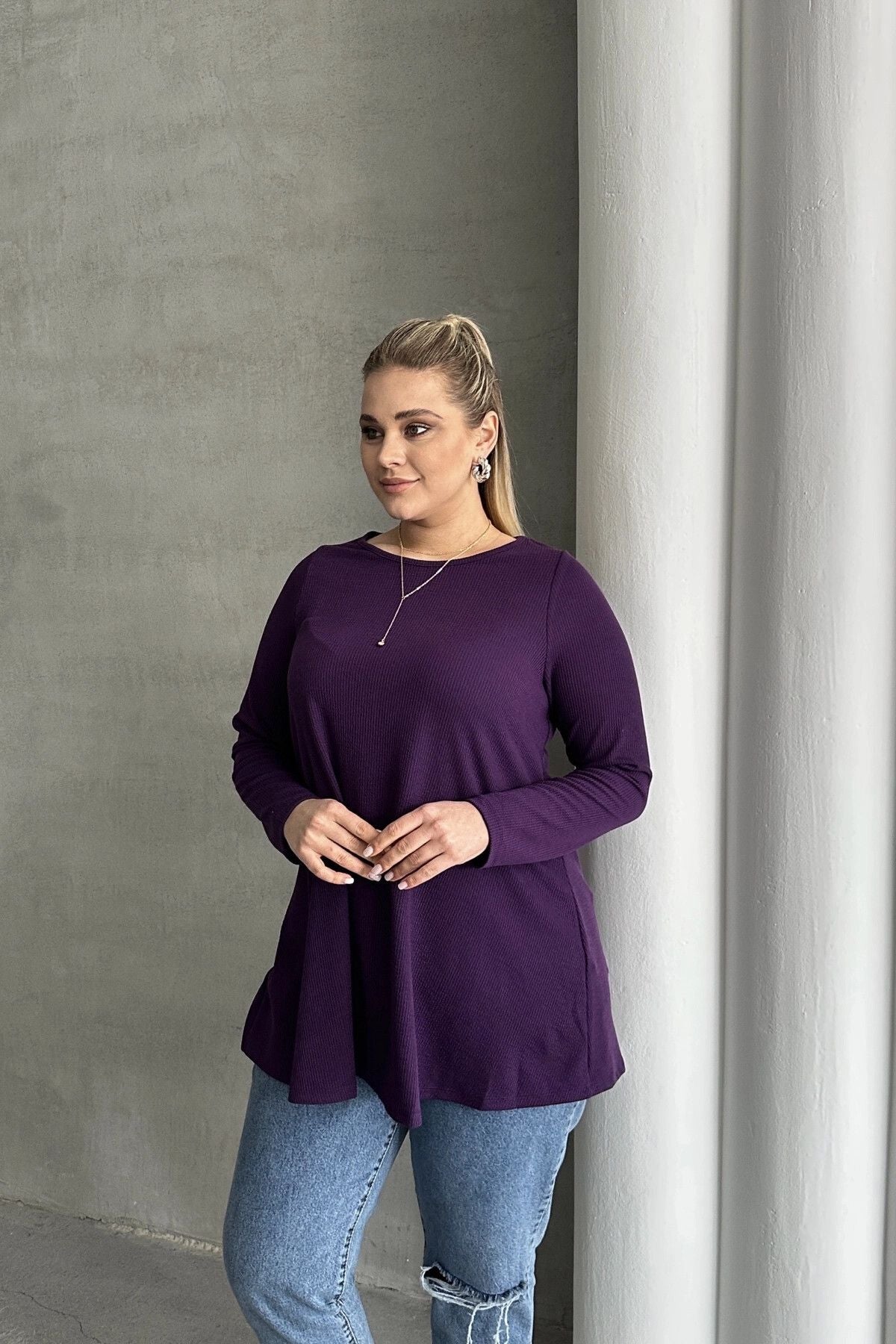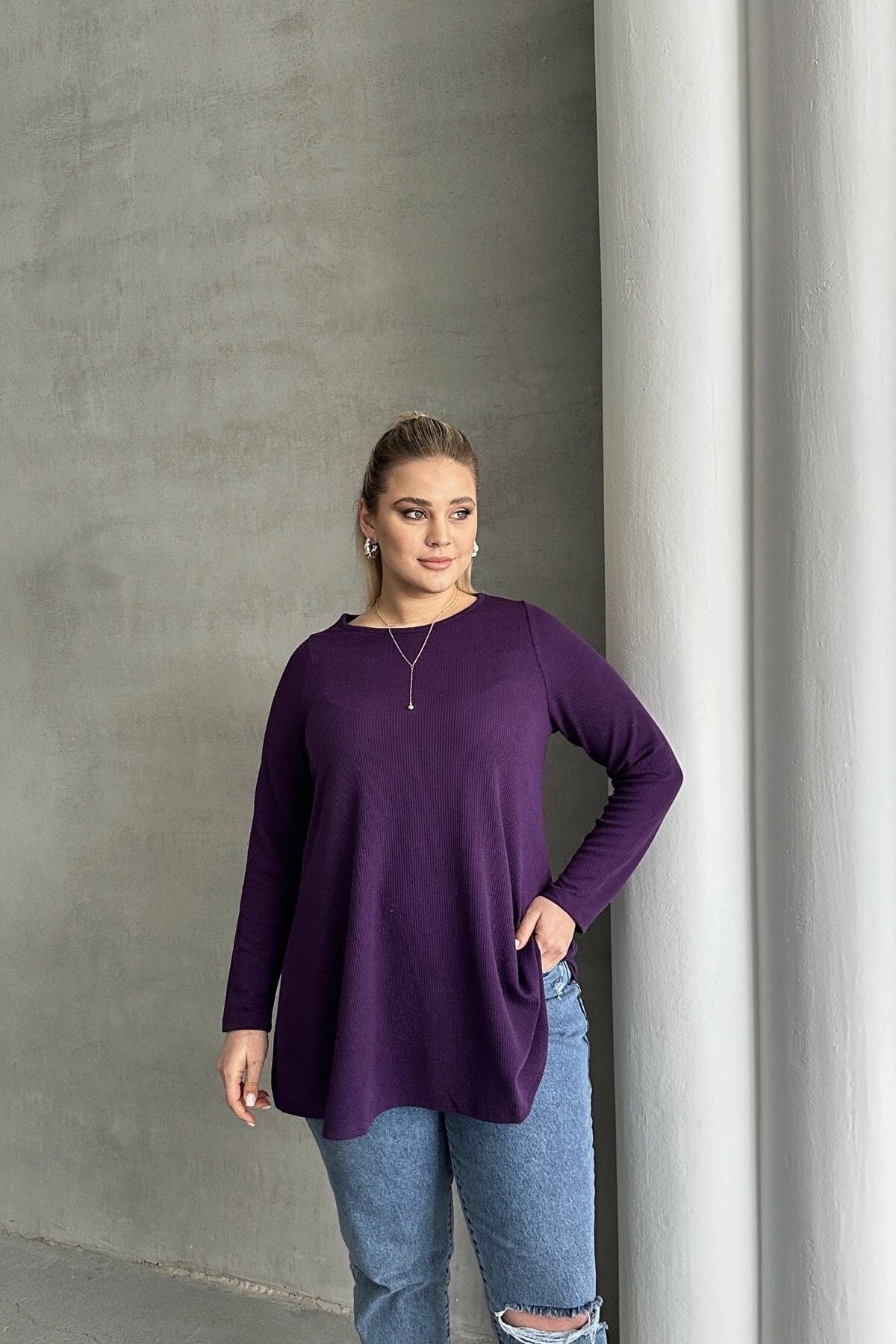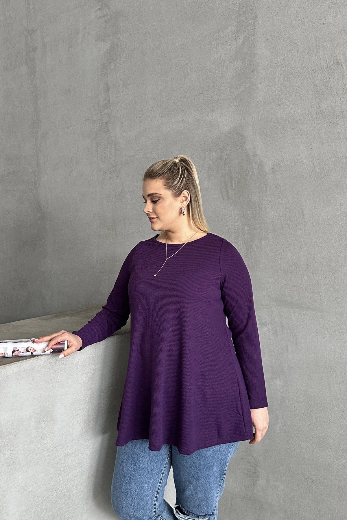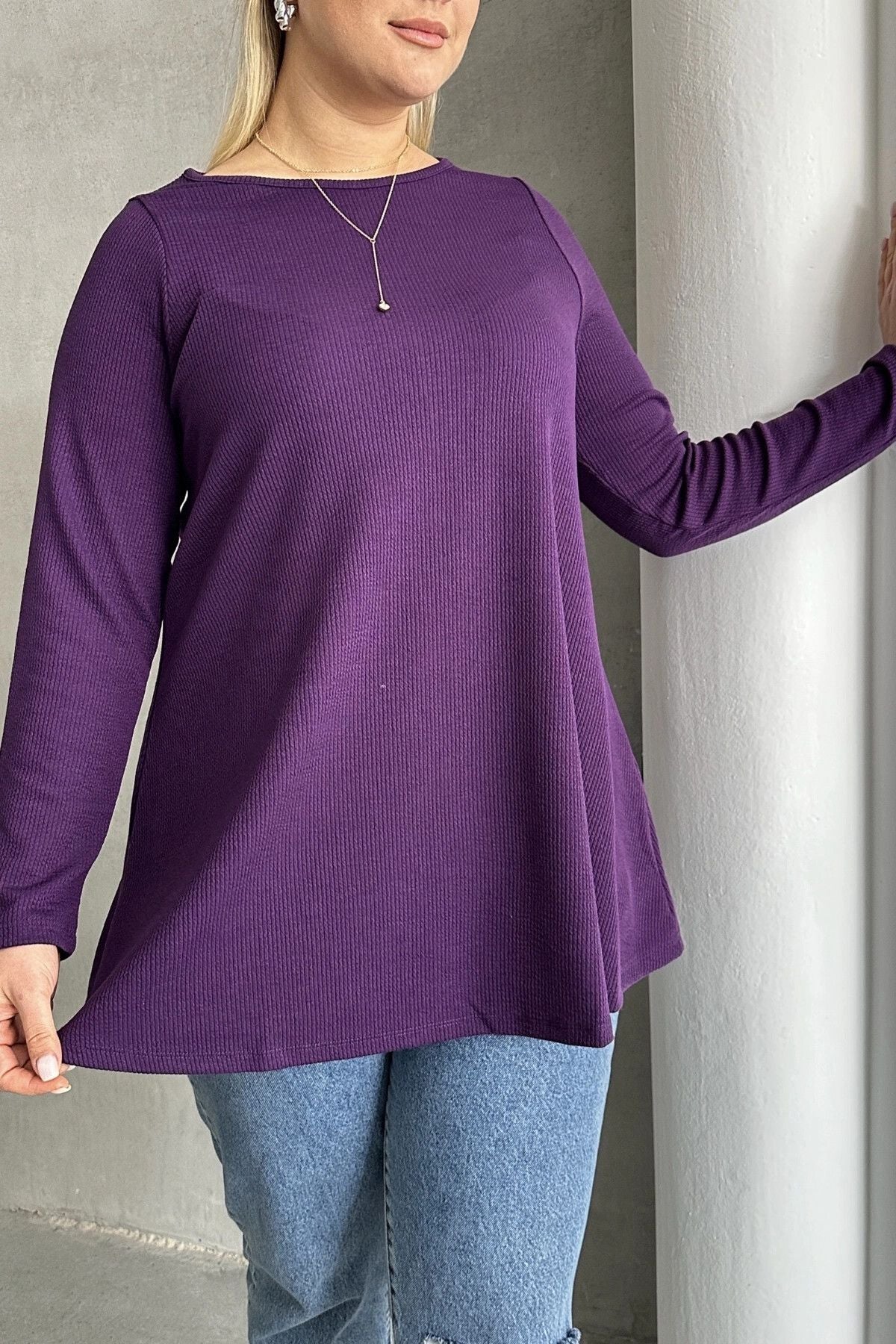 Büyük Beden Uzun Kollu Bisiklet Yaka Fitilli Bluz 100-123