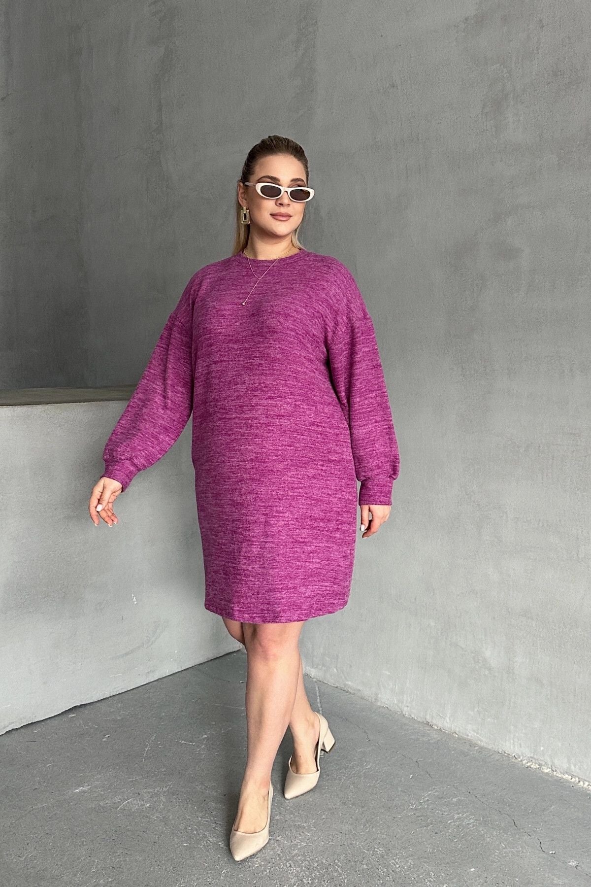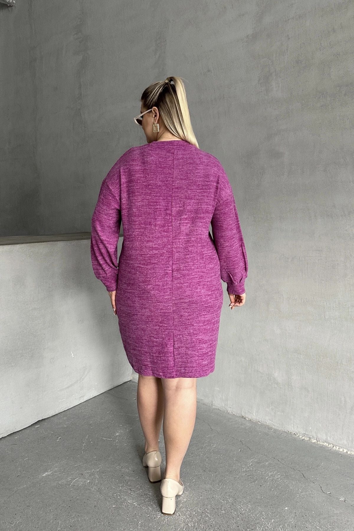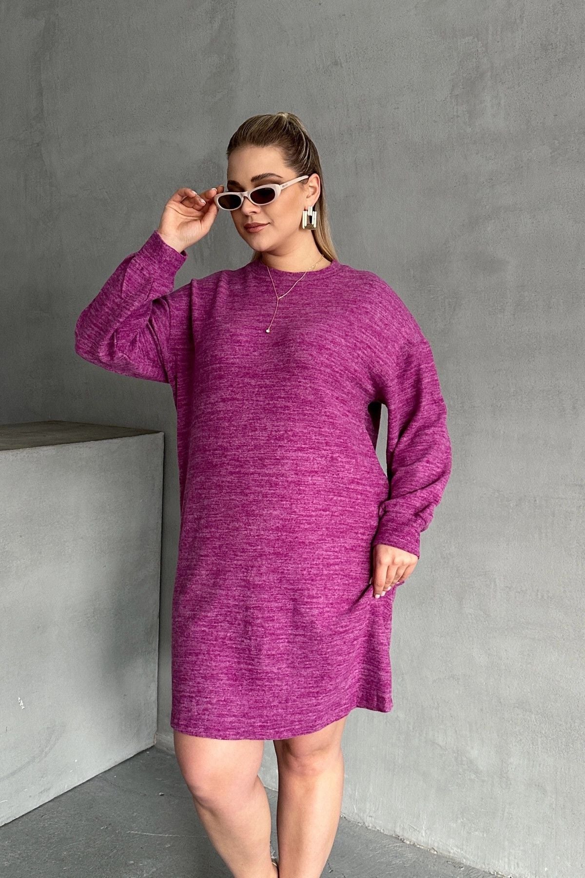 Büyük Beden Uzun Kollu Bisiklet Yaka Kırçıllı Elbise 84-162