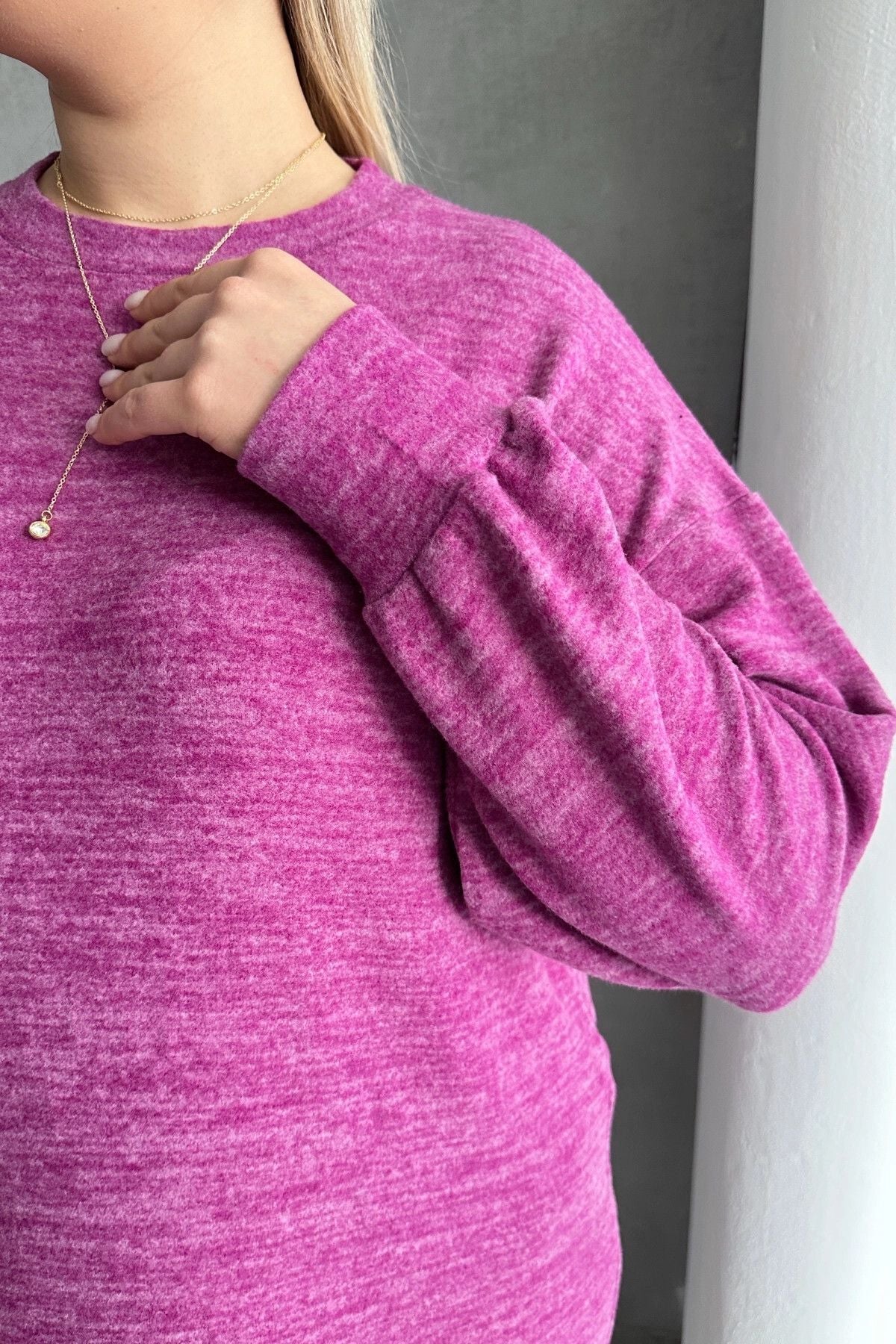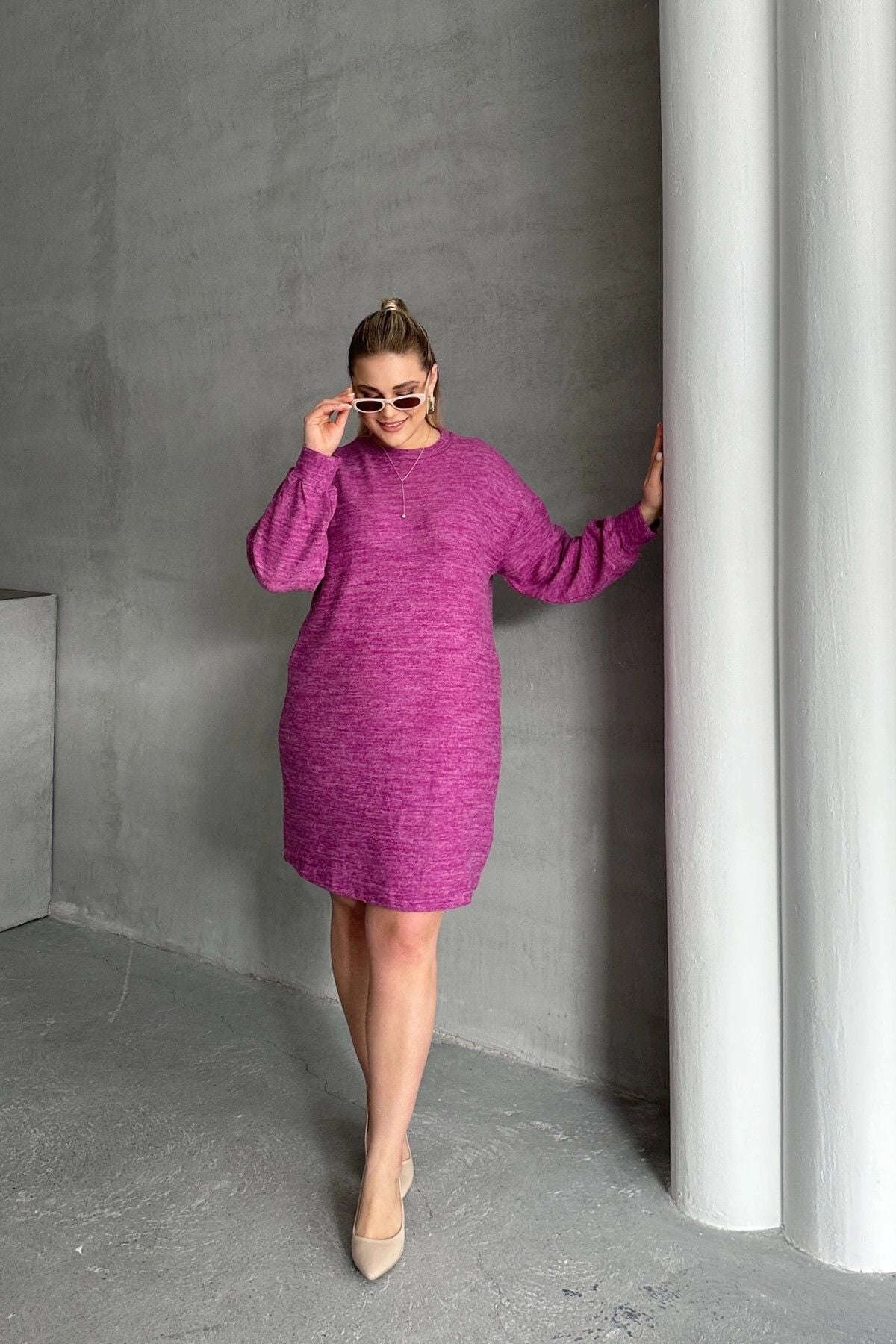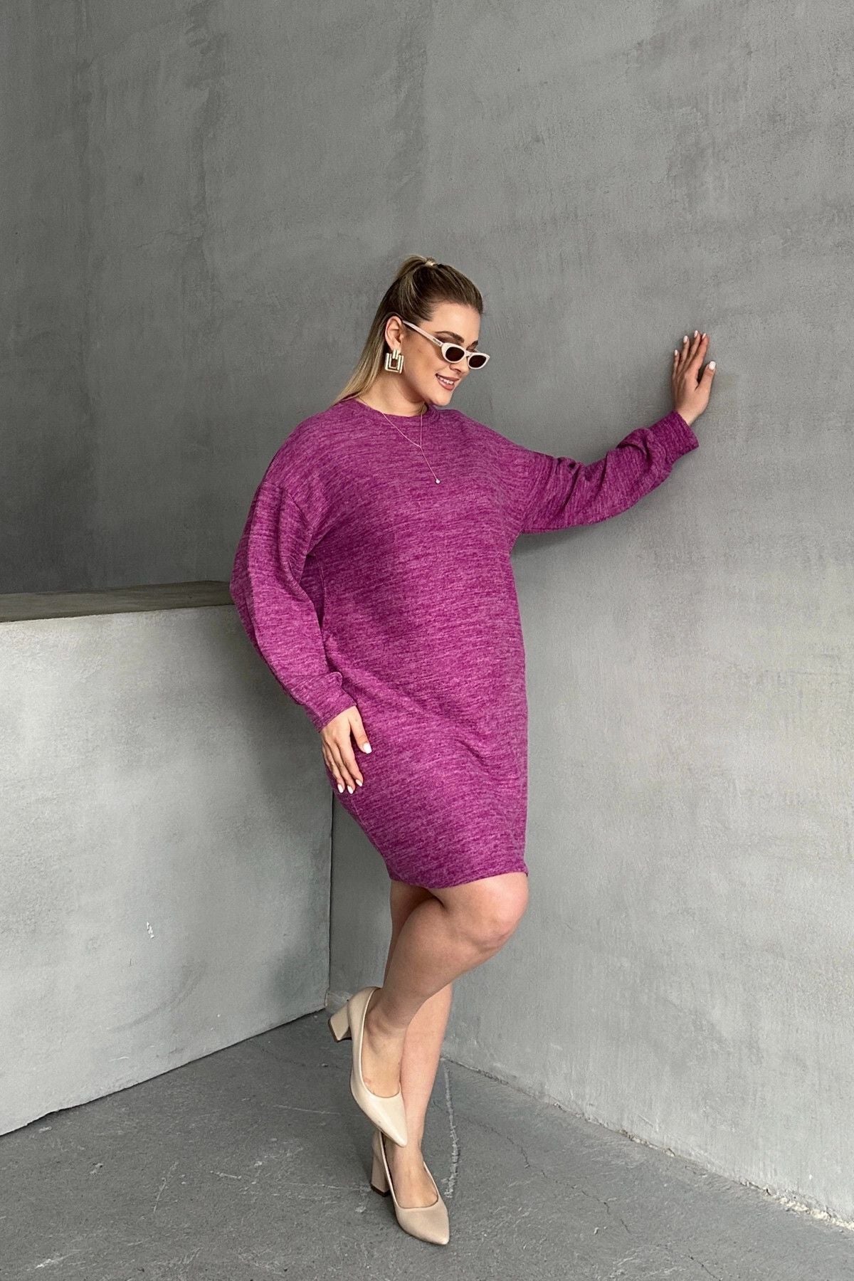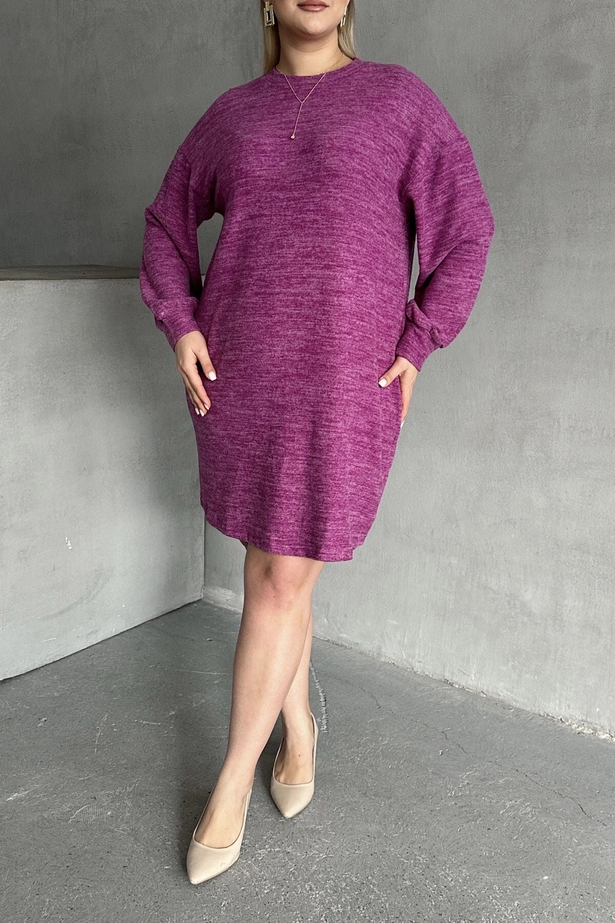 Büyük Beden Uzun Kollu Bisiklet Yaka Kırçıllı Elbise 84-162
