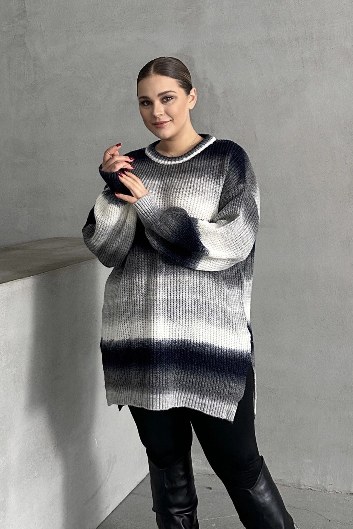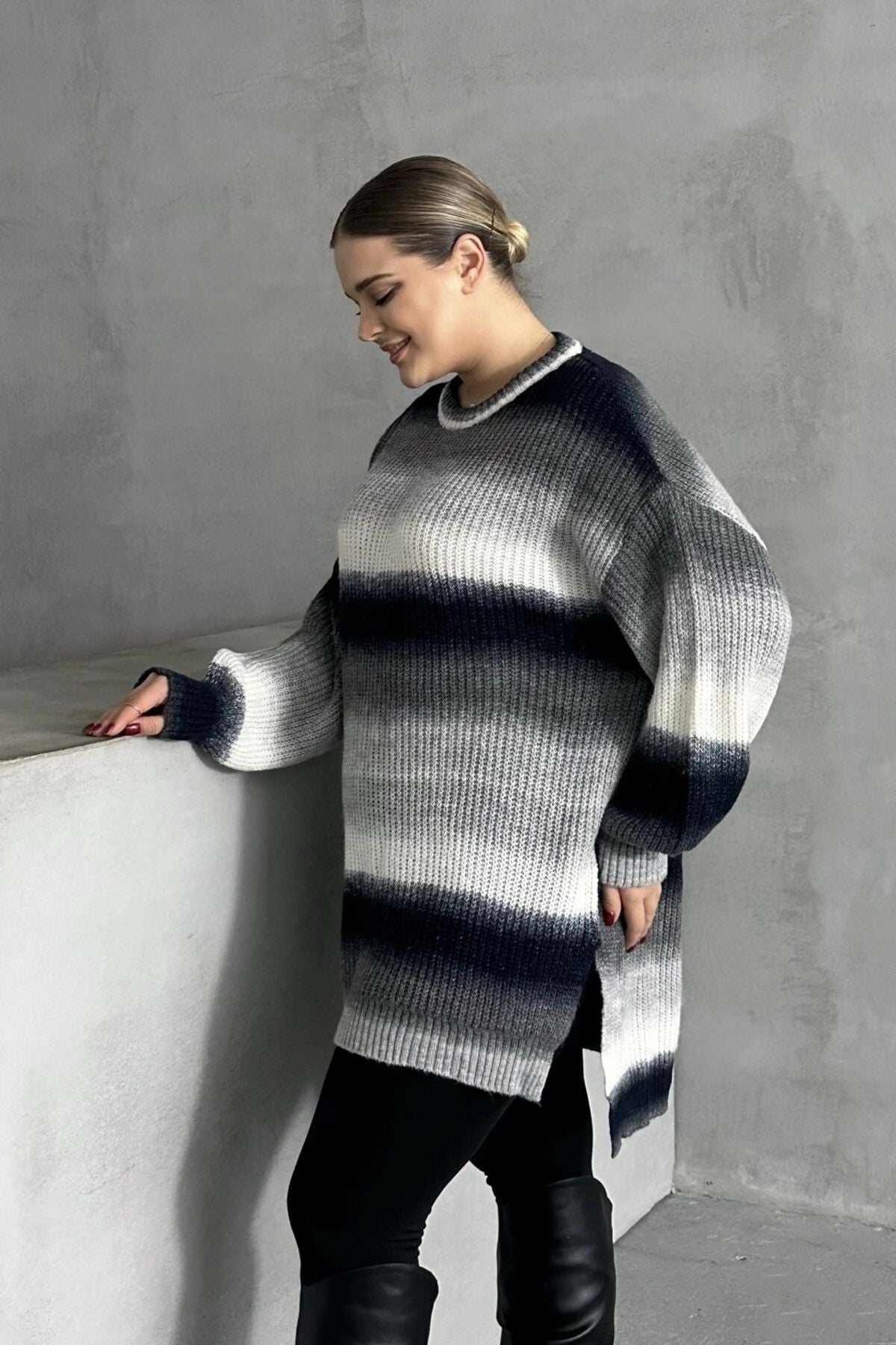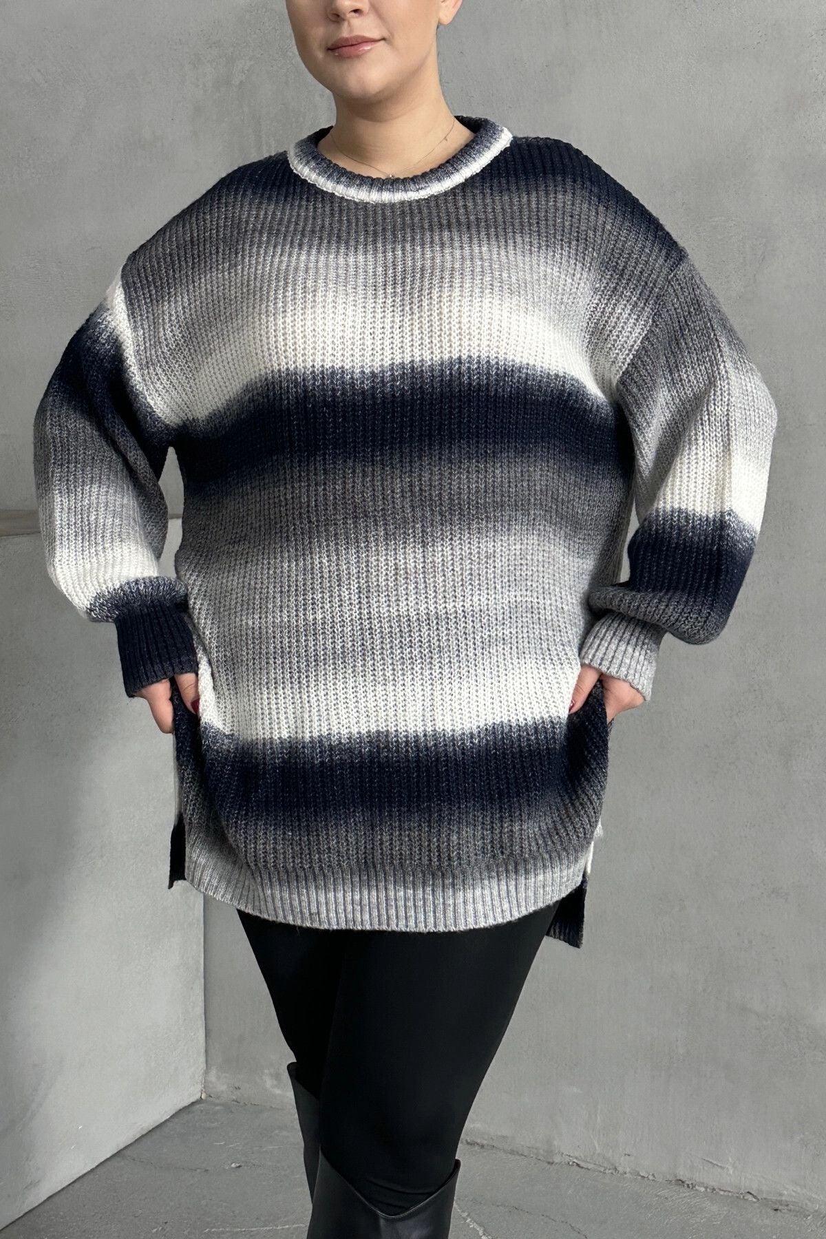 Büyük Beden Uzun Kollu Bisiklet Yaka Renk Bloklu Yırtmaçlı Triko Kazak 302345