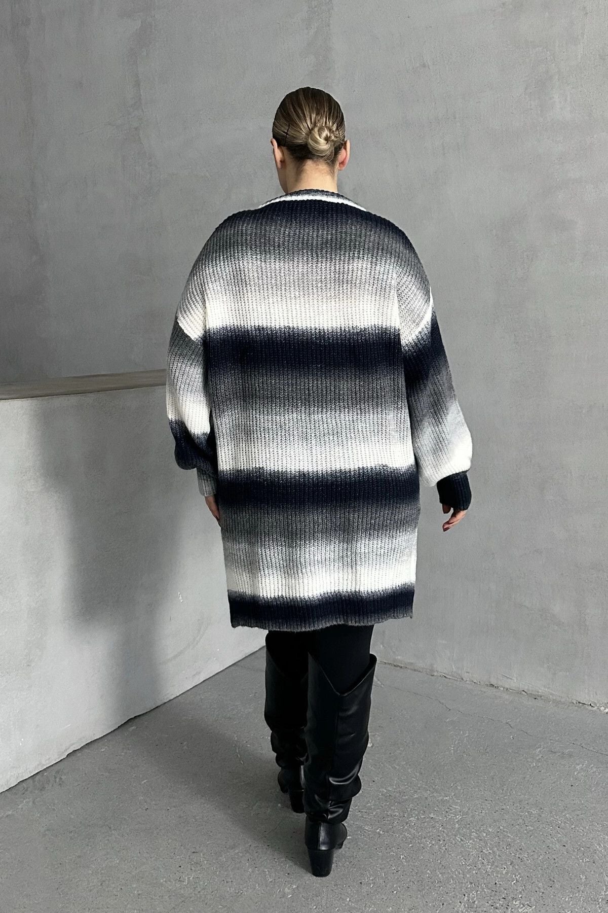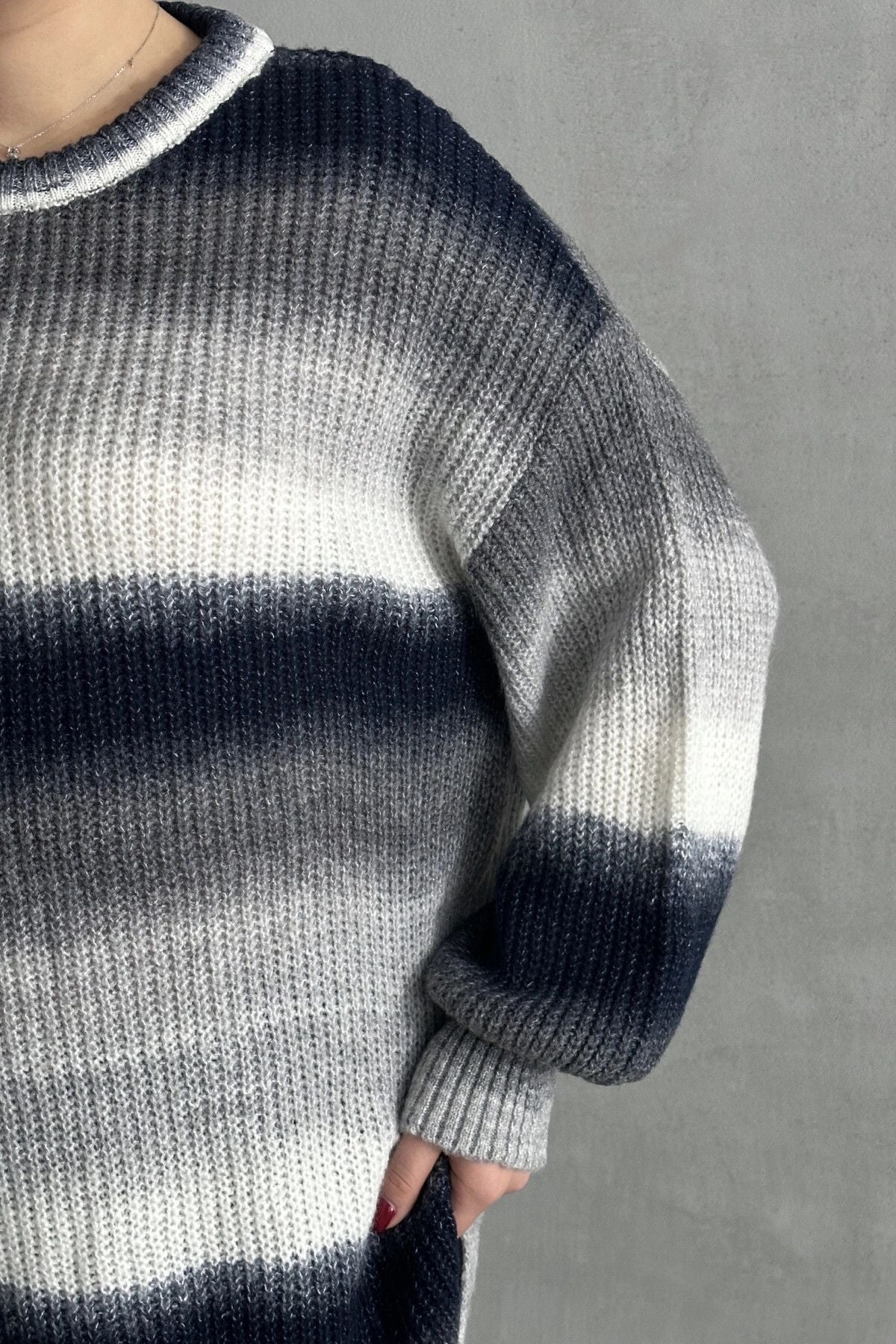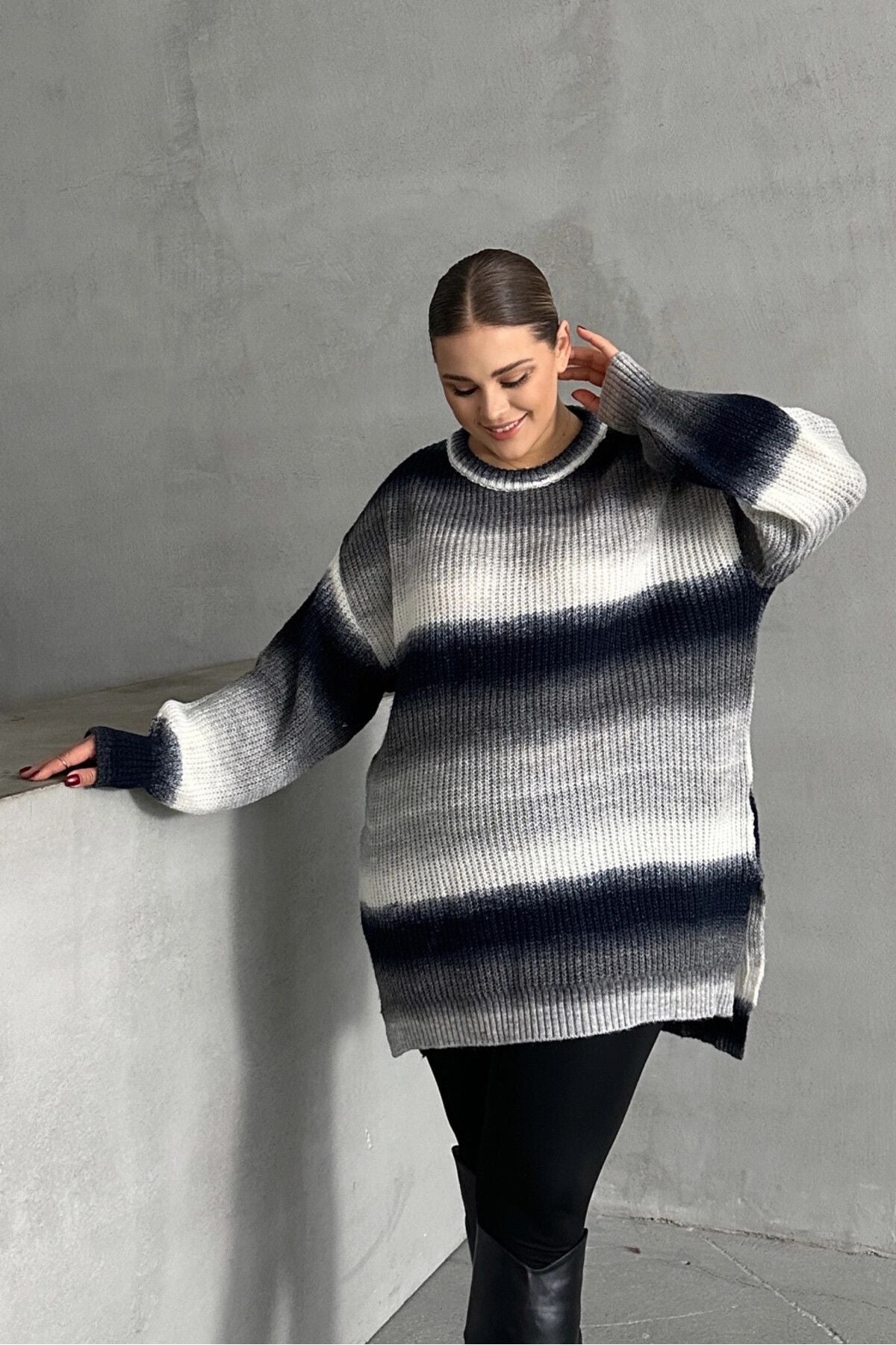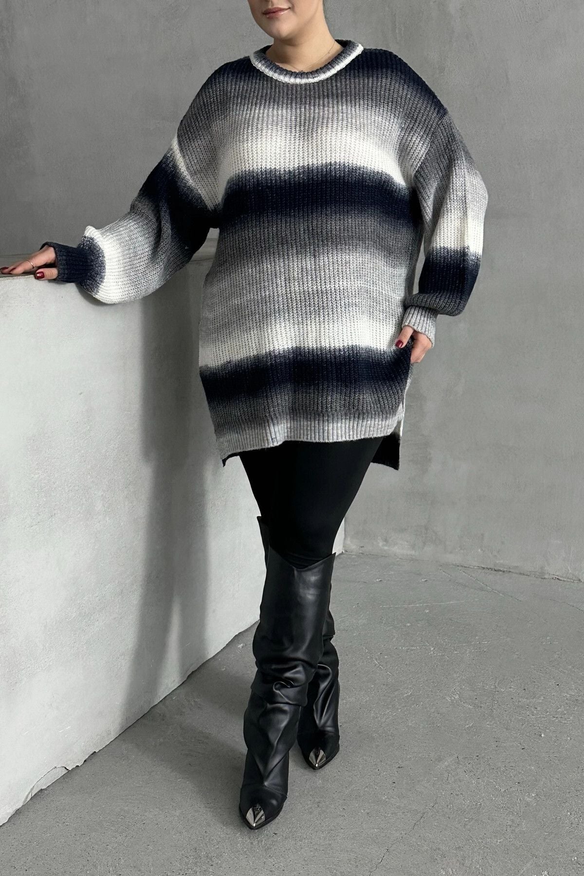 Büyük Beden Uzun Kollu Bisiklet Yaka Renk Bloklu Yırtmaçlı Triko Kazak 302345