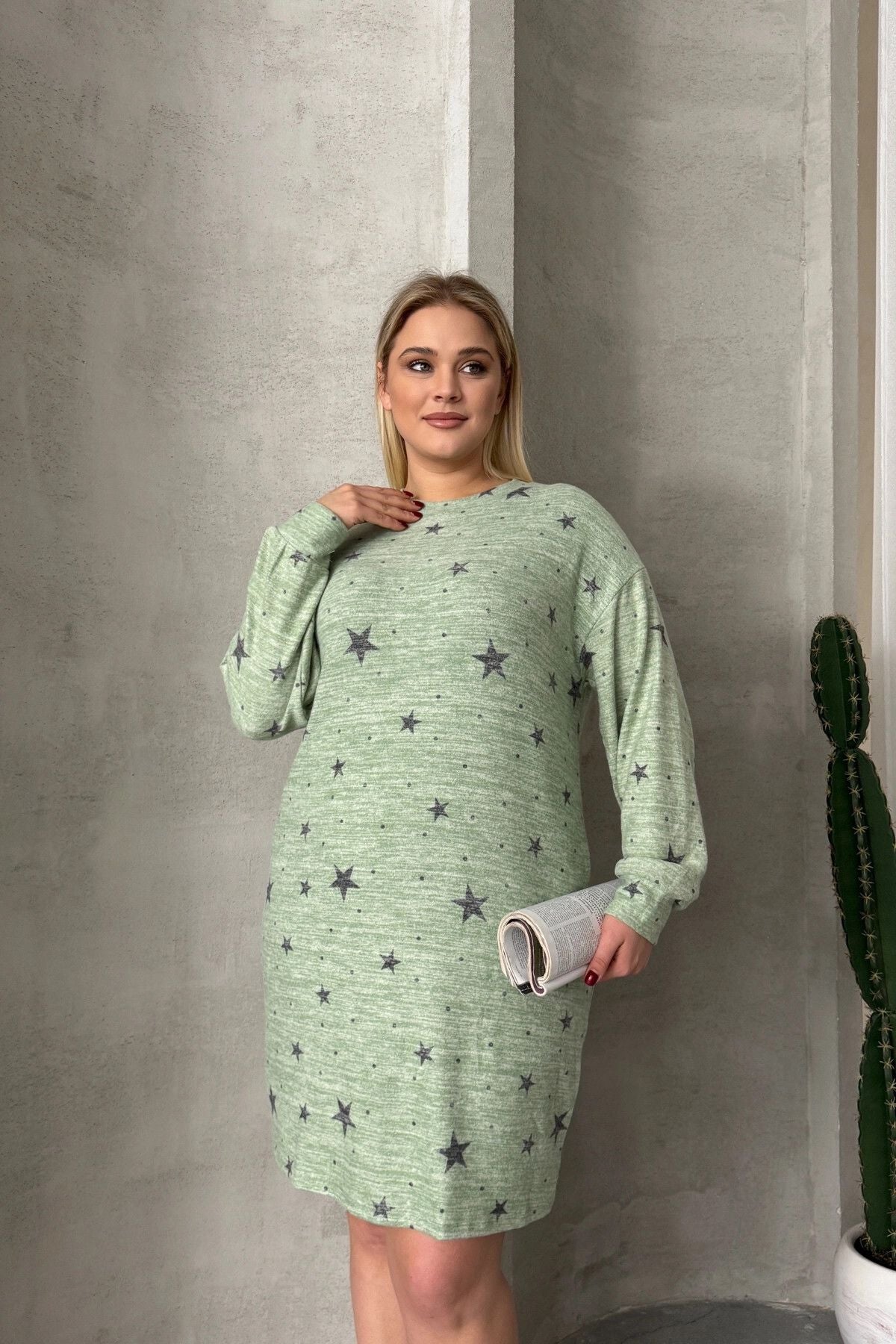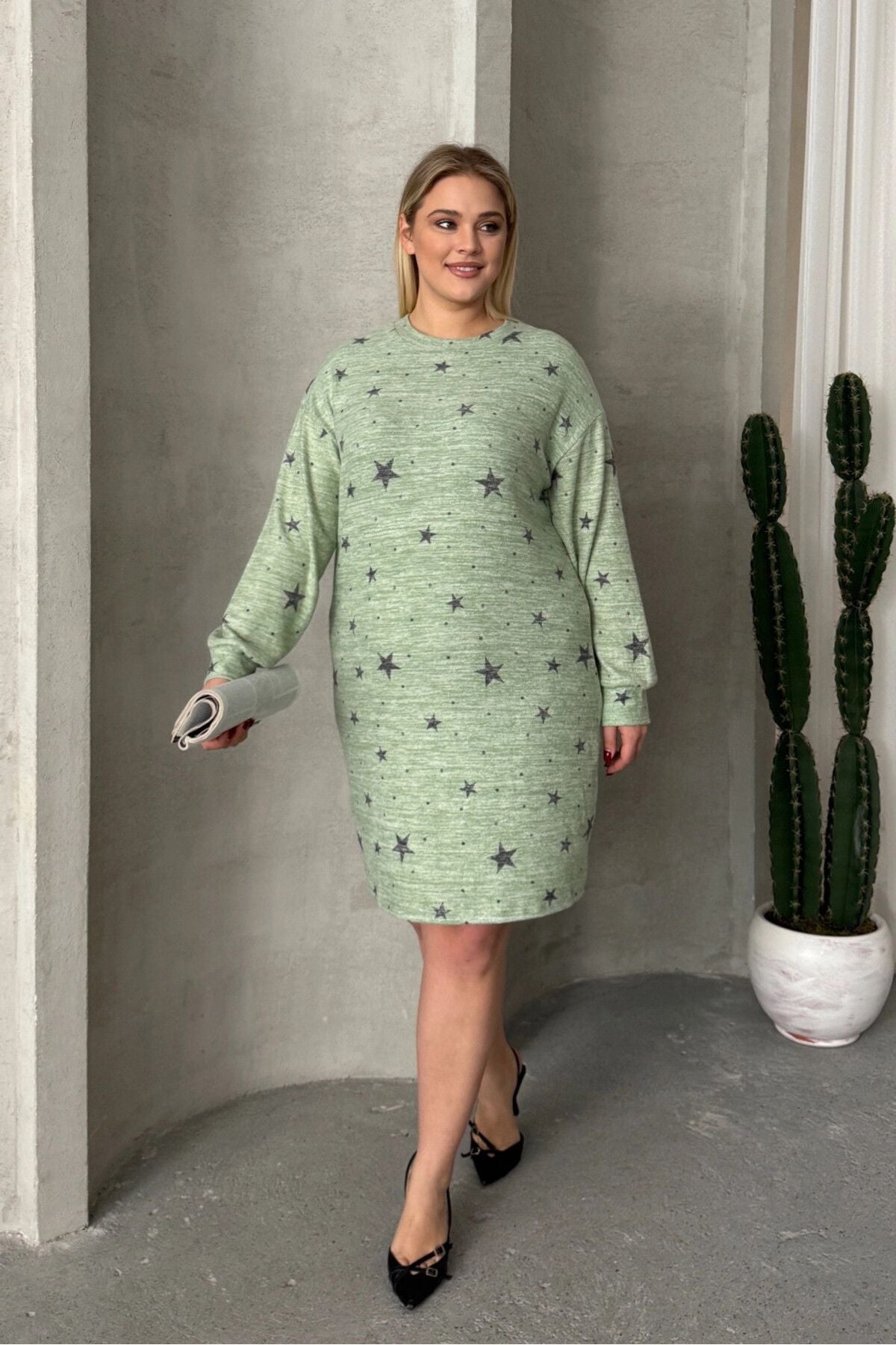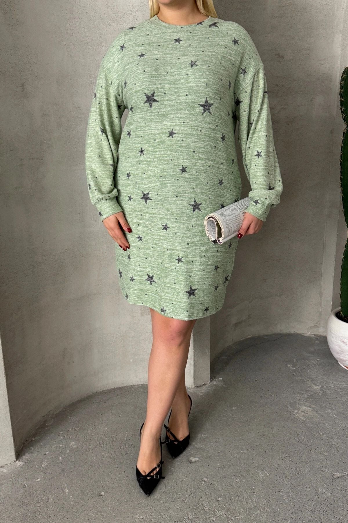 Büyük Beden Uzun Kollu Bisiklet Yaka Yıldız Desenli Esnek Elbise 84-158