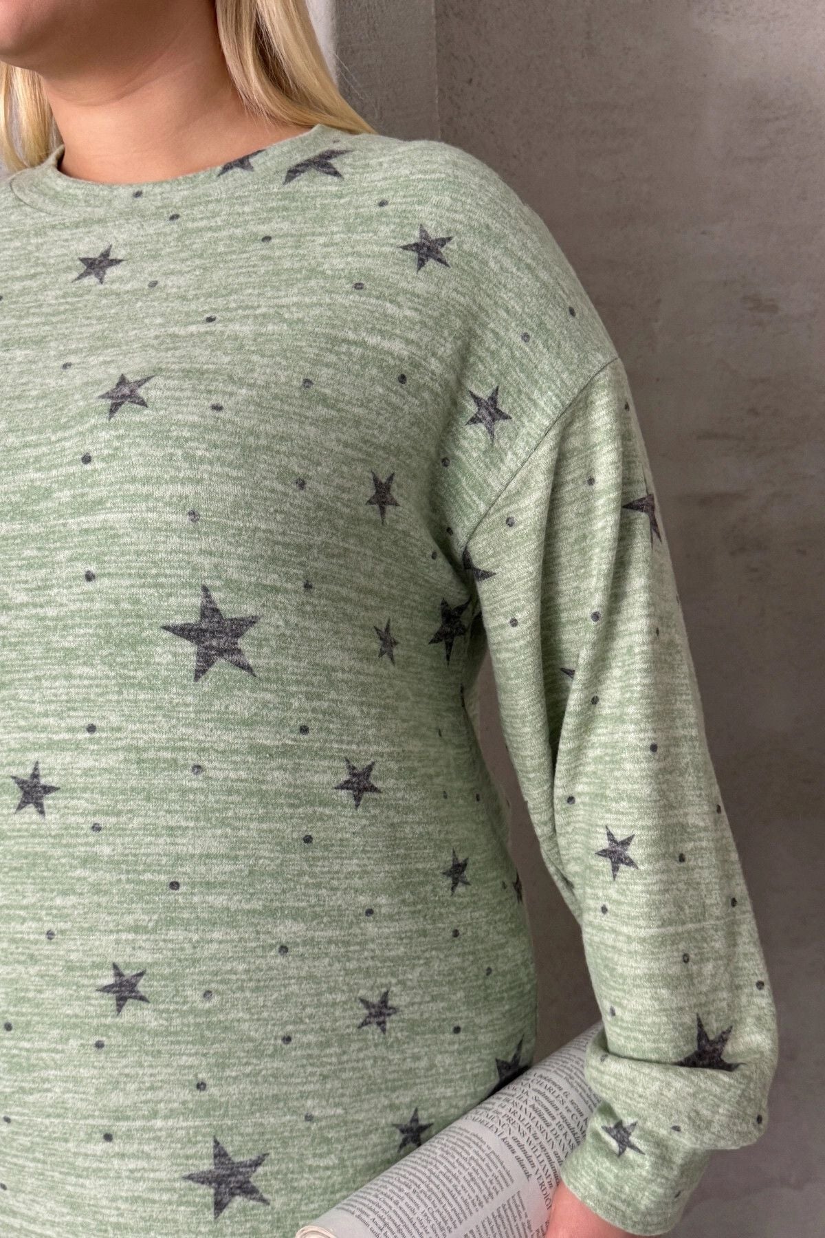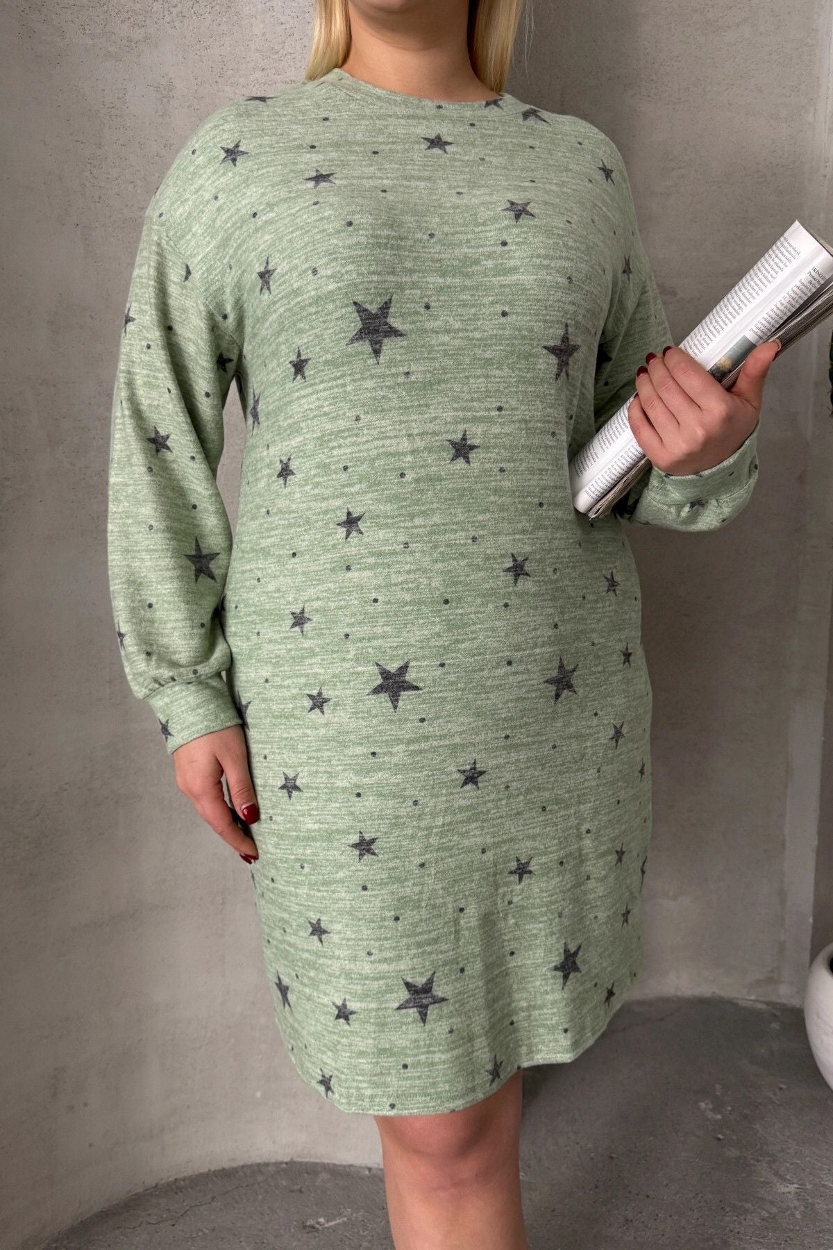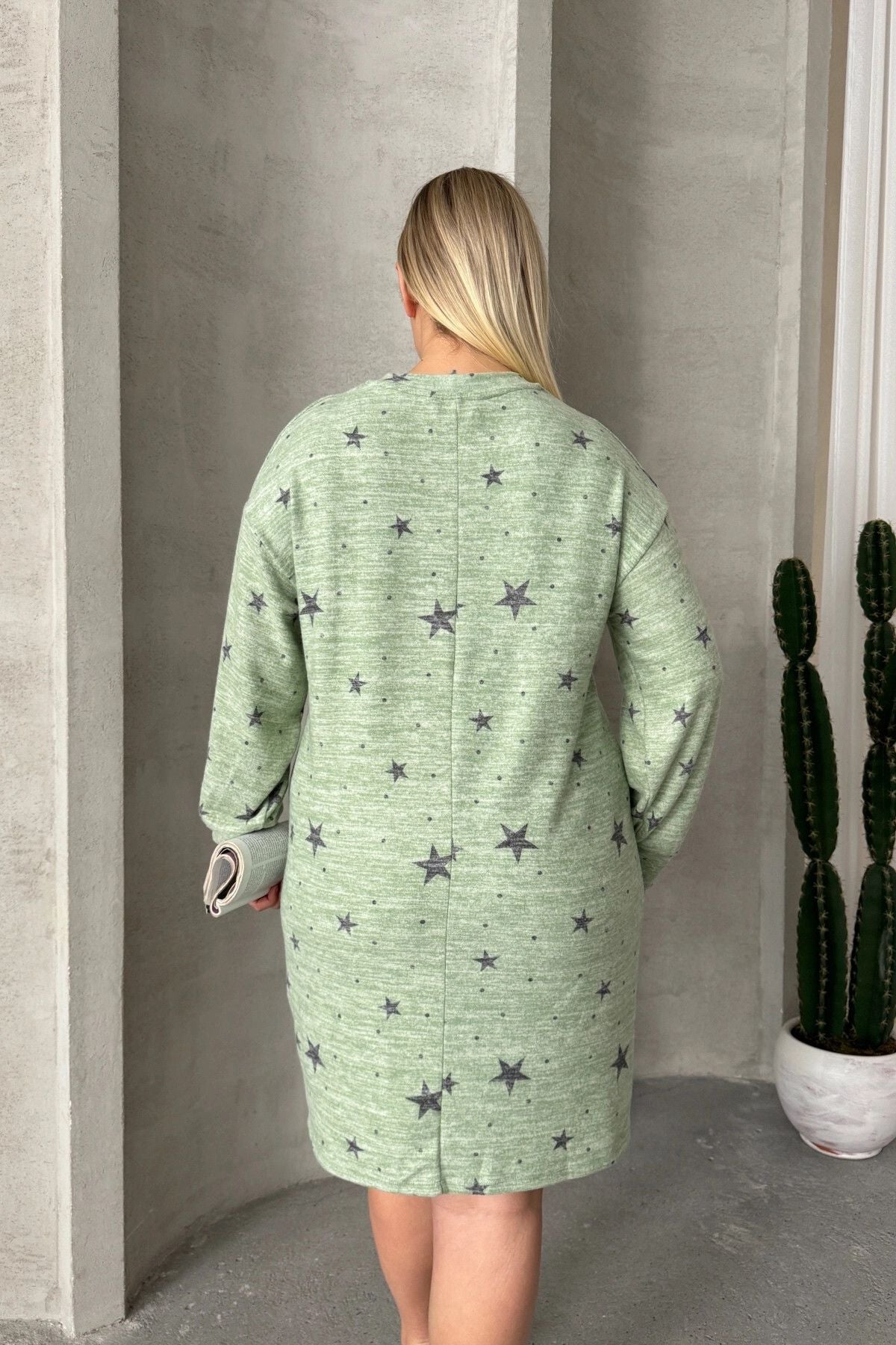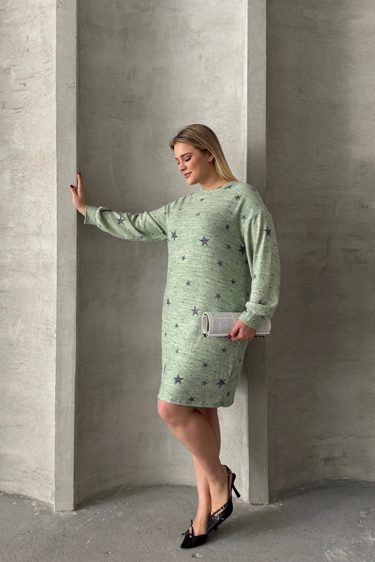 Büyük Beden Uzun Kollu Bisiklet Yaka Yıldız Desenli Esnek Elbise 84-158