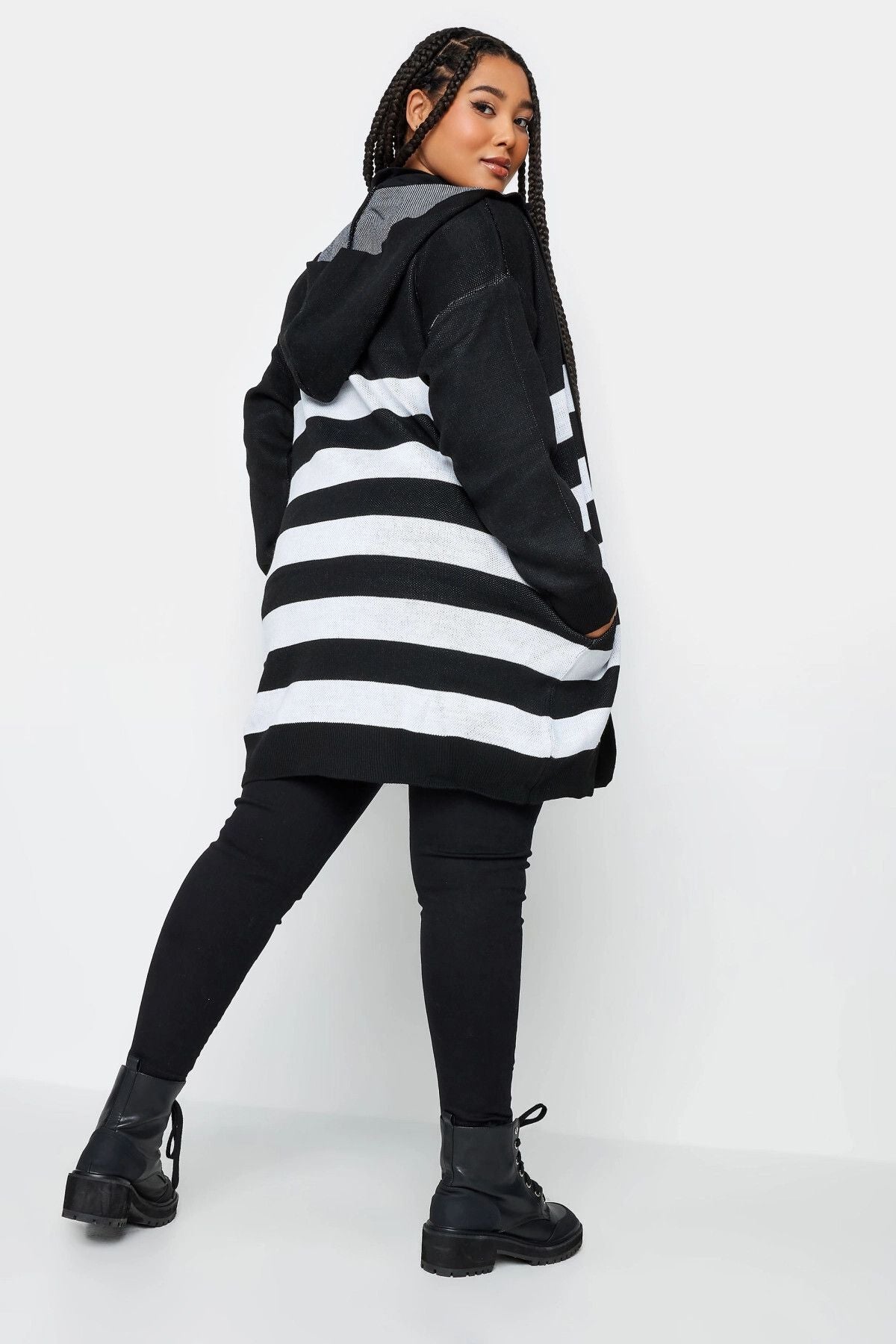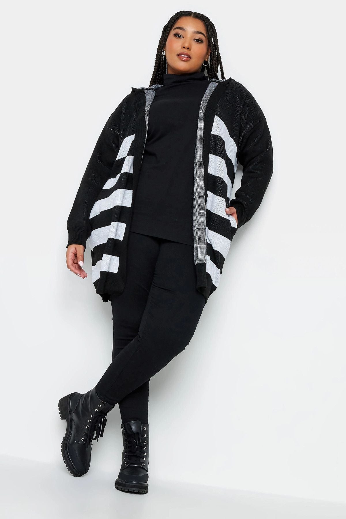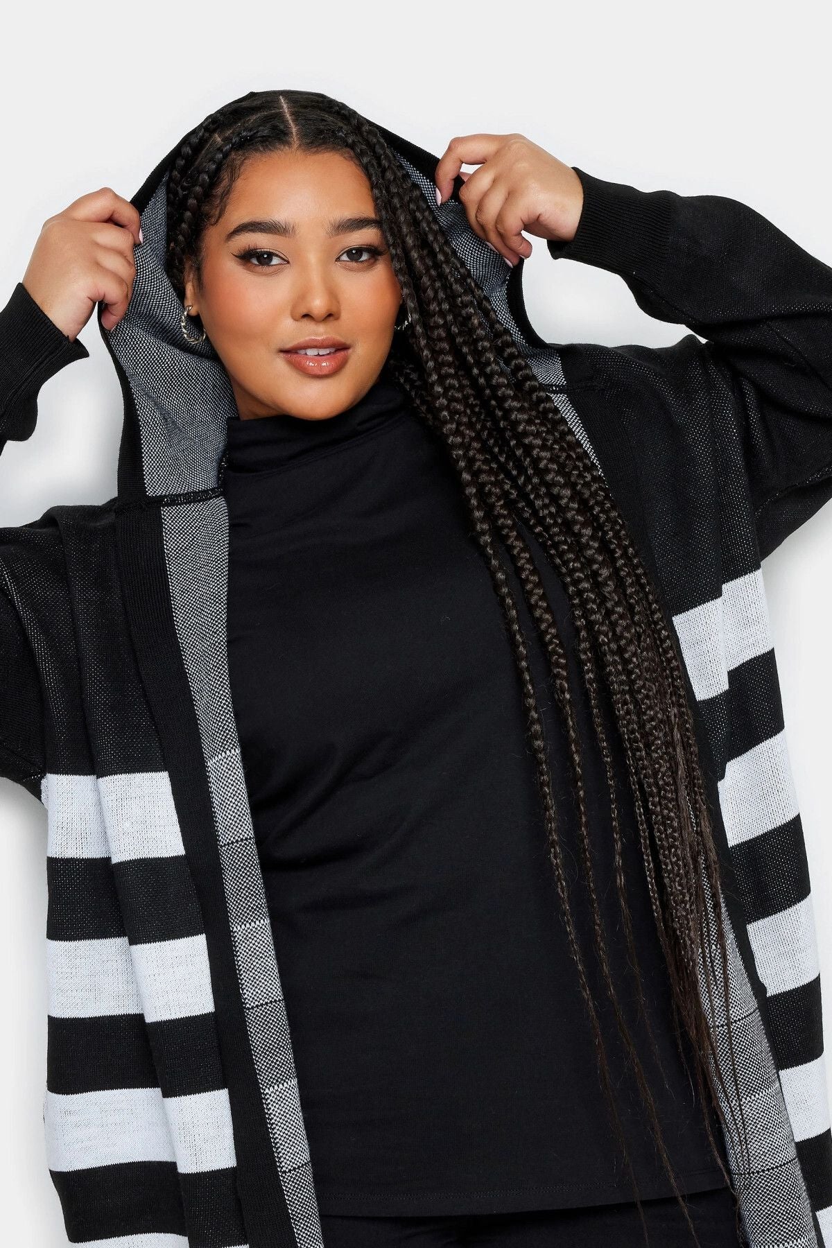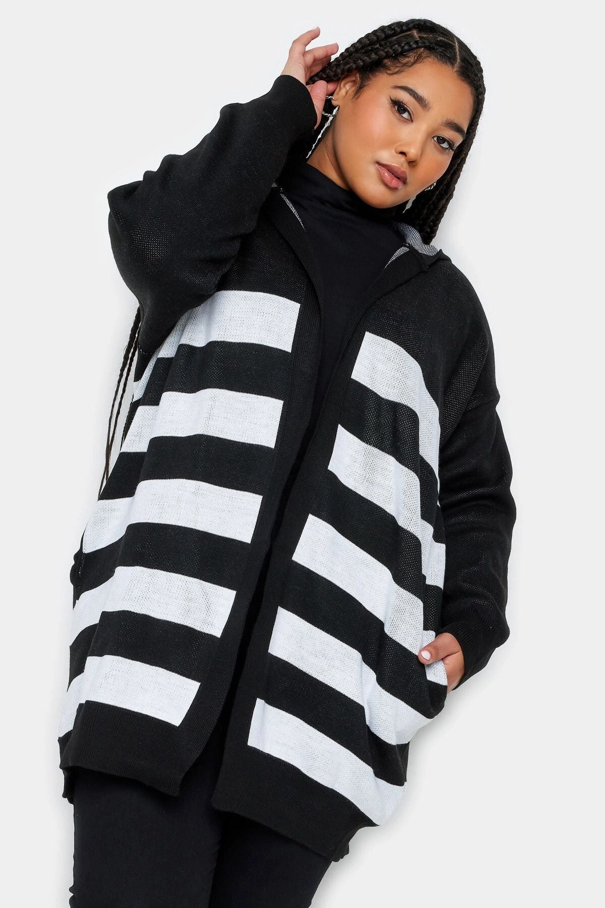 Büyük Beden Uzun Kollu Cepli Kapüşonlu Çizgili Örme Hırka 302793
