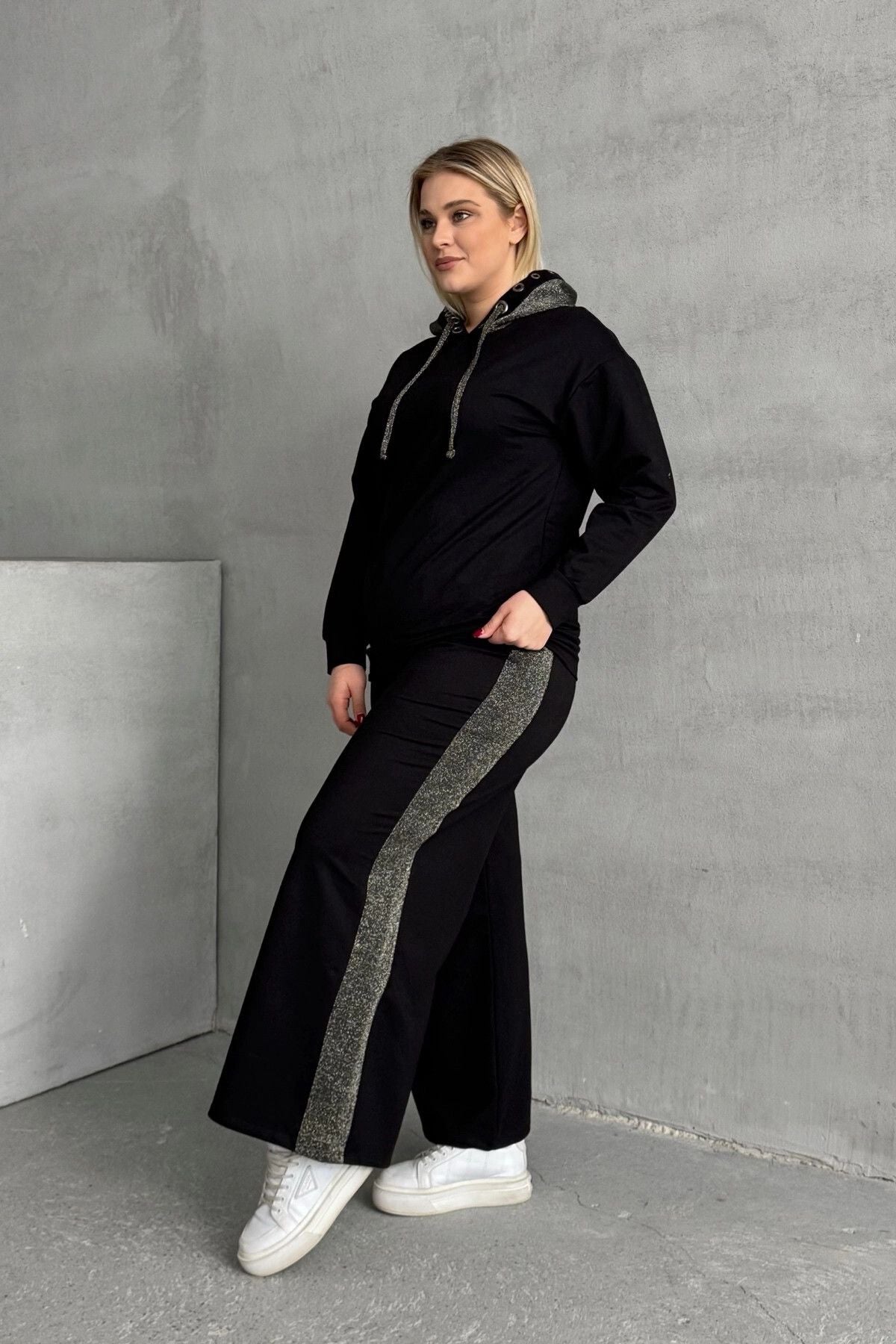 Büyük Beden Uzun Kollu Kapüşonlu ve Bol Paça Cepsiz Eşofman Takımı 106-73-74