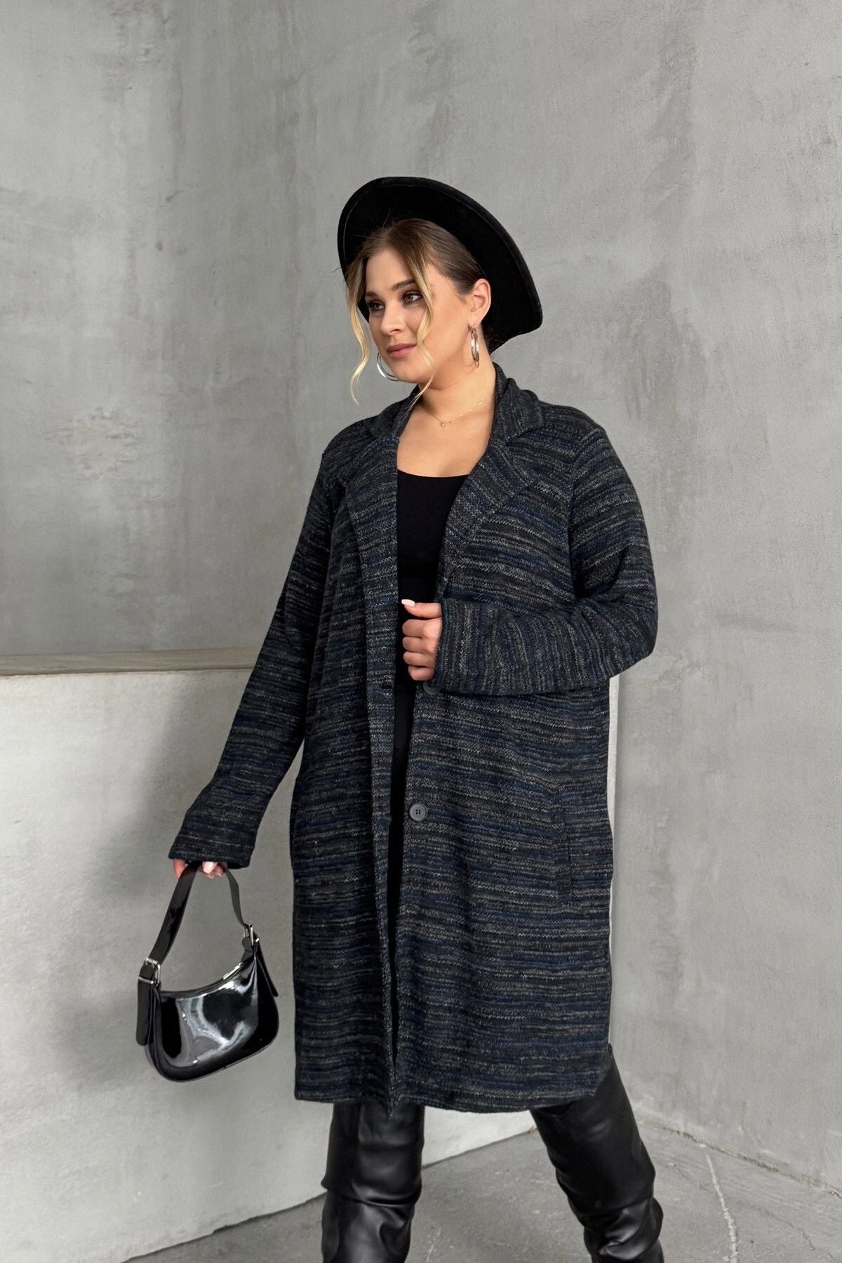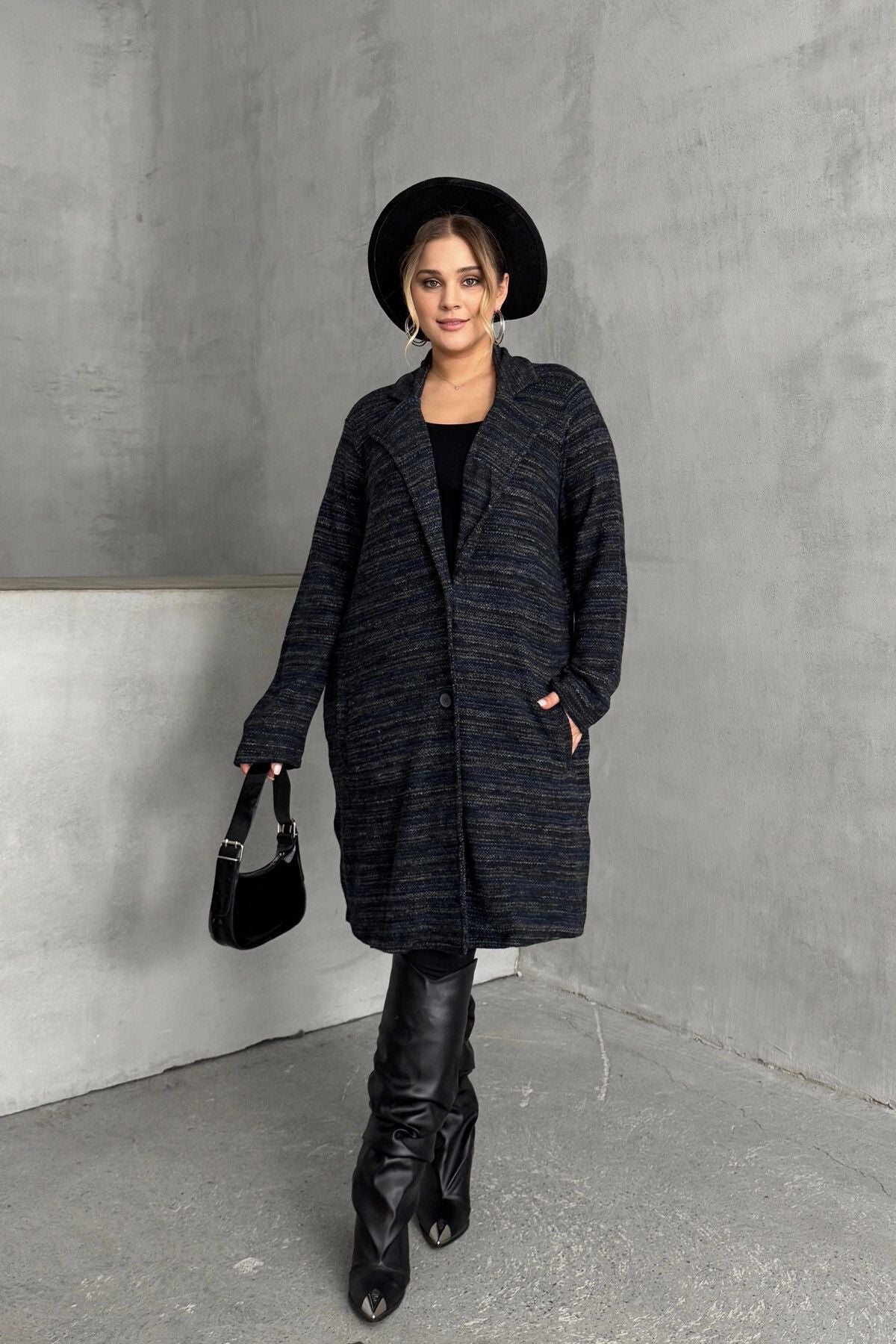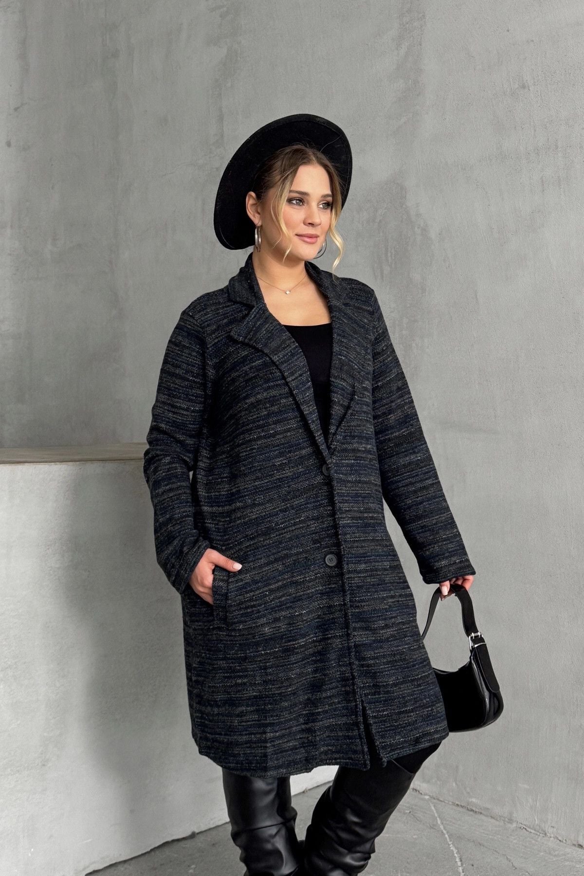 Büyük Beden Uzun Kollu Önü Düğmeli Cepli Uzun İnce Ceket 301800