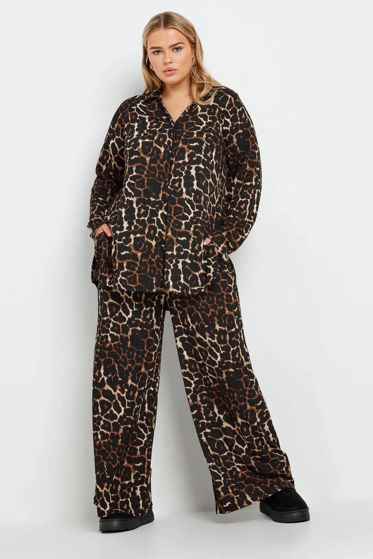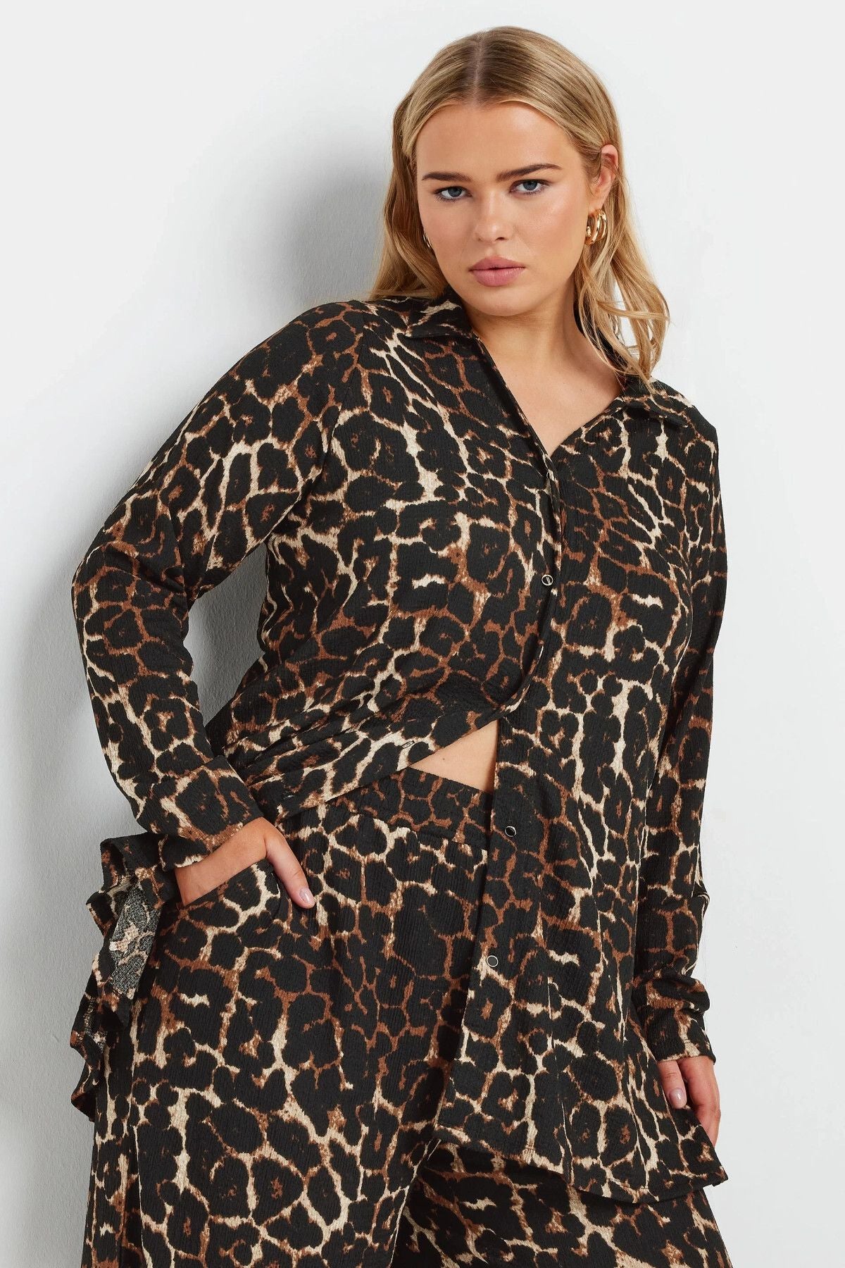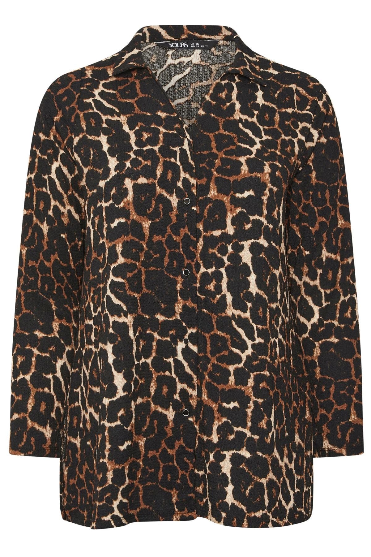 Büyük Beden Uzun Kollu Önü Düğmeli Leopar Desenli Gömlek 322258