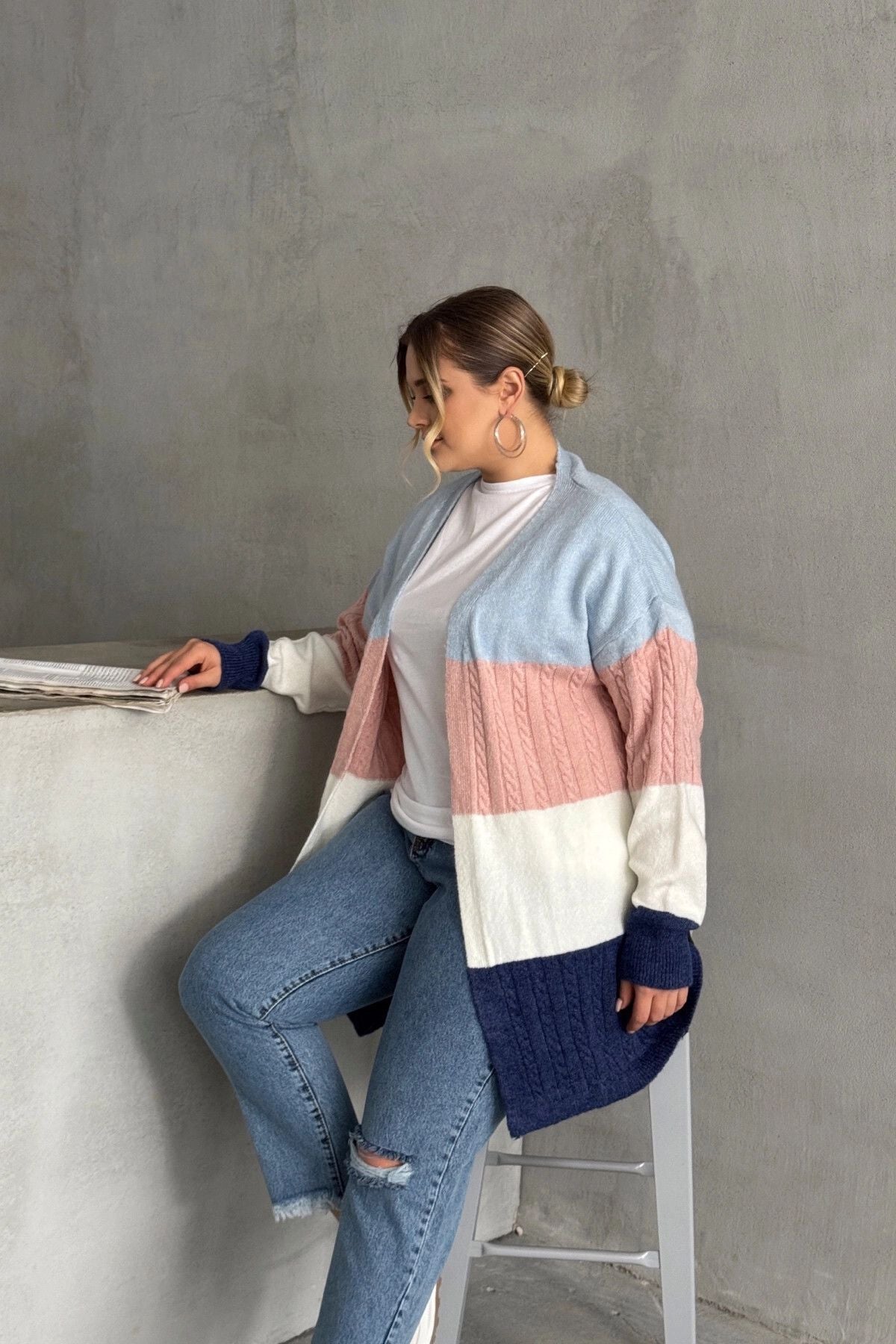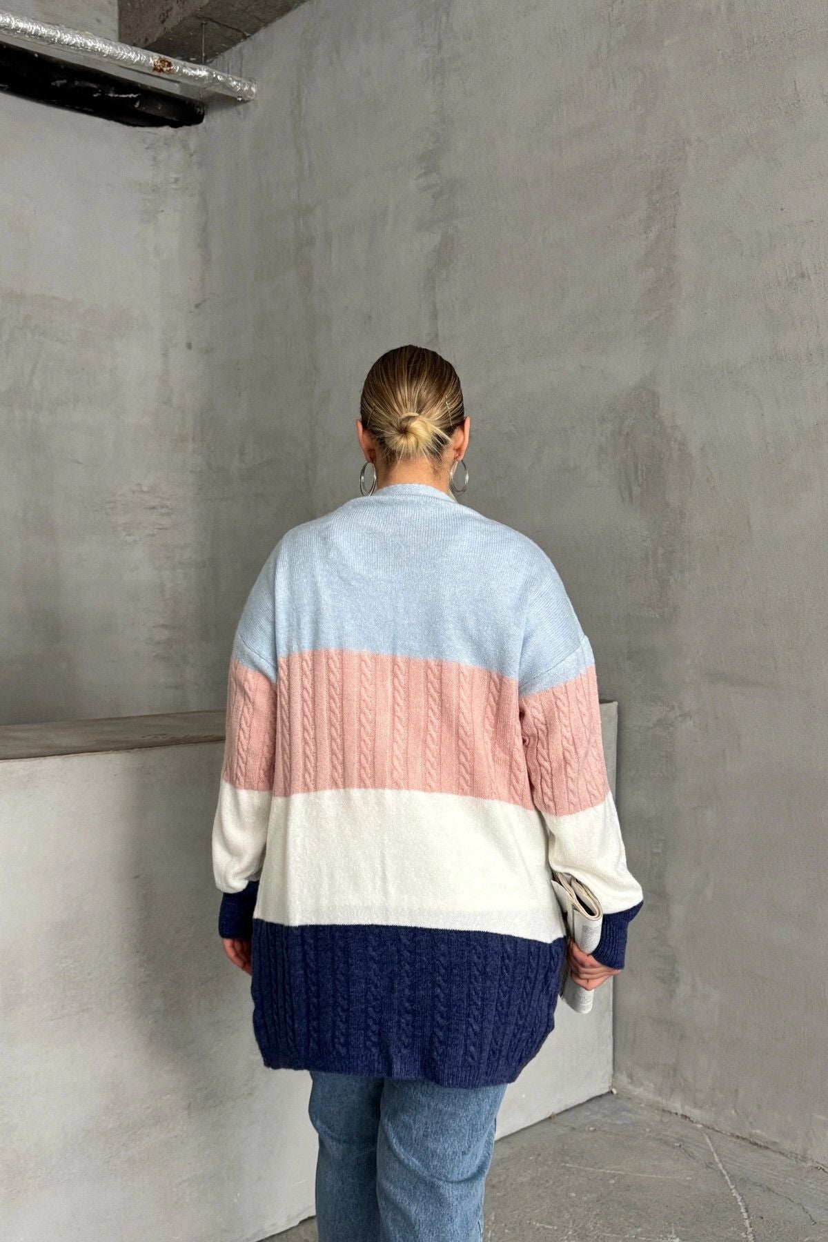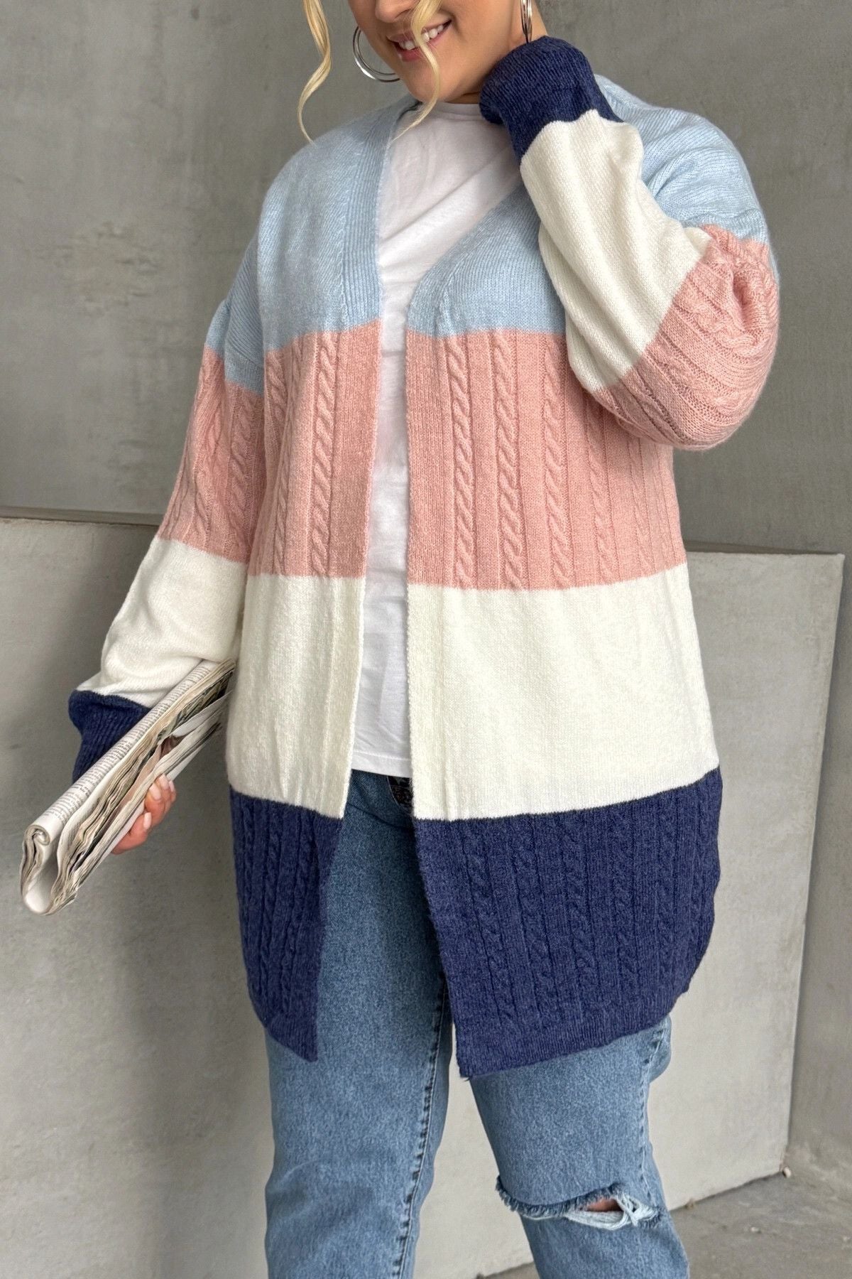 Büyük Beden Uzun Kollu Önü Kapamasız Renk Bloklu Triko Hırka 302147