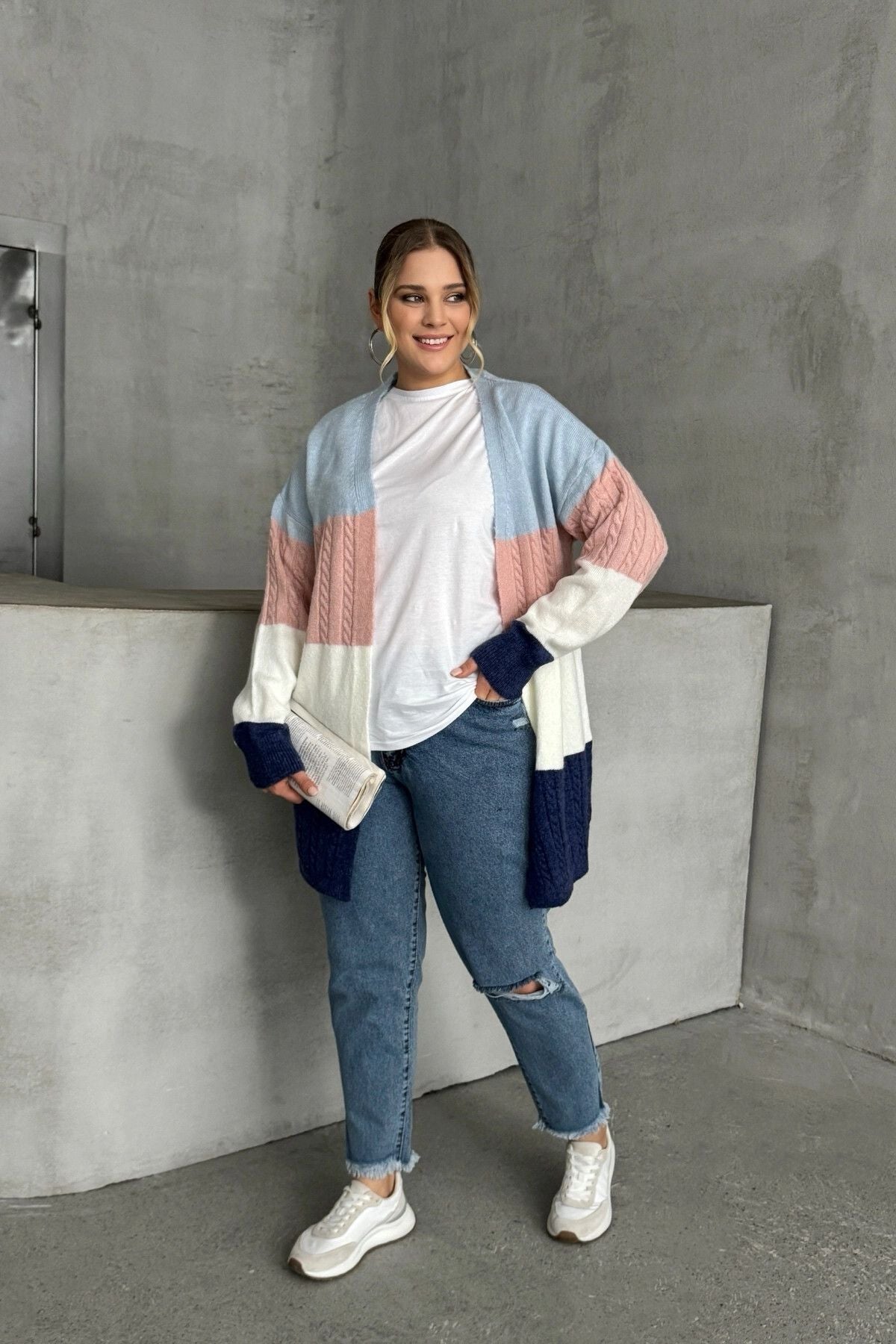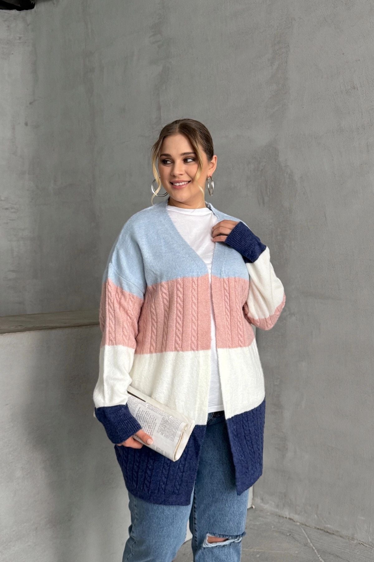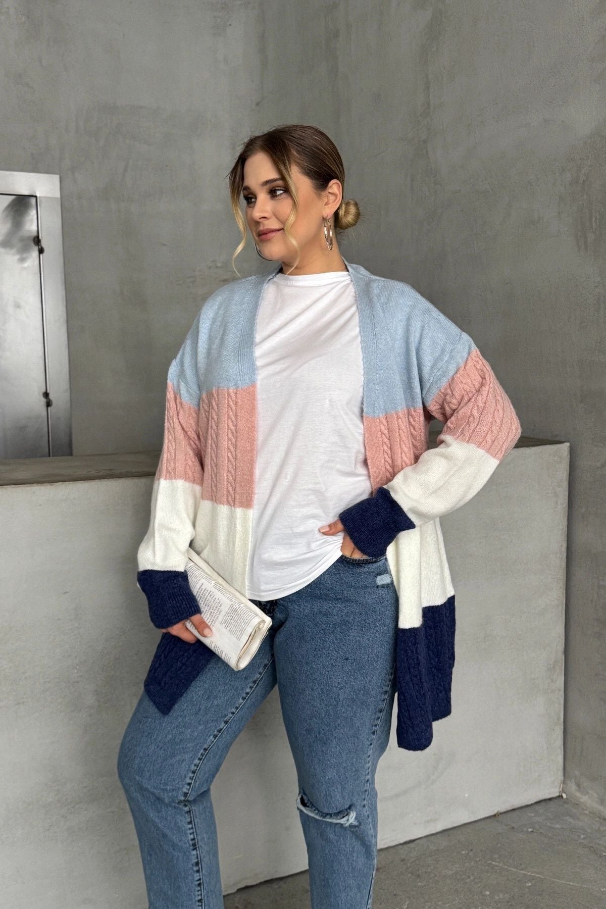Büyük Beden Uzun Kollu Önü Kapamasız Renk Bloklu Triko Hırka 302147