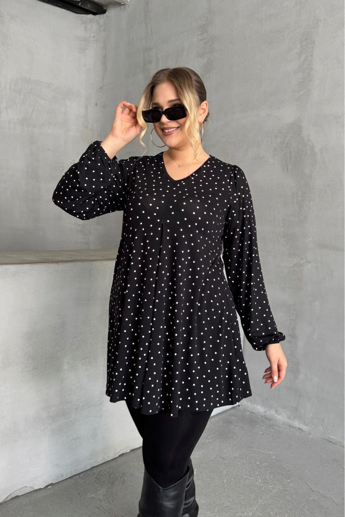 Büyük Beden Uzun Kollu Önü Pileli Bilekleri Lastikli Puantiyeli Bluz 322348