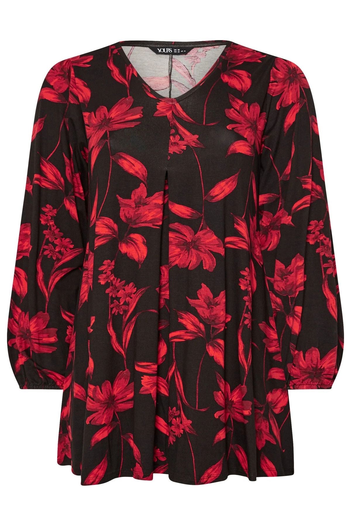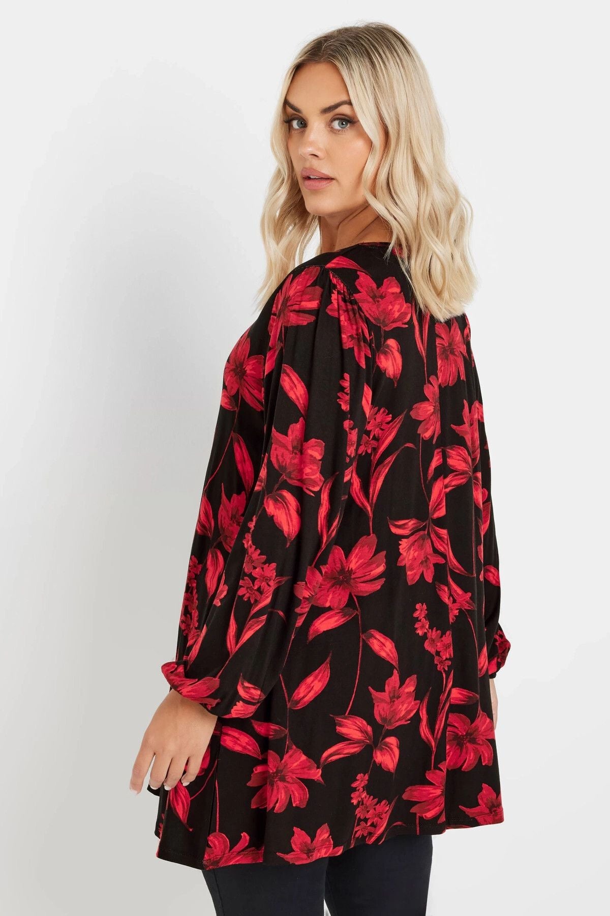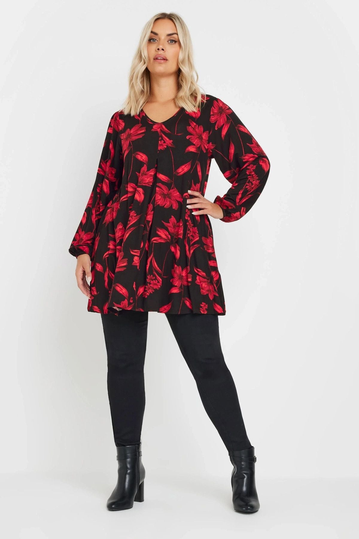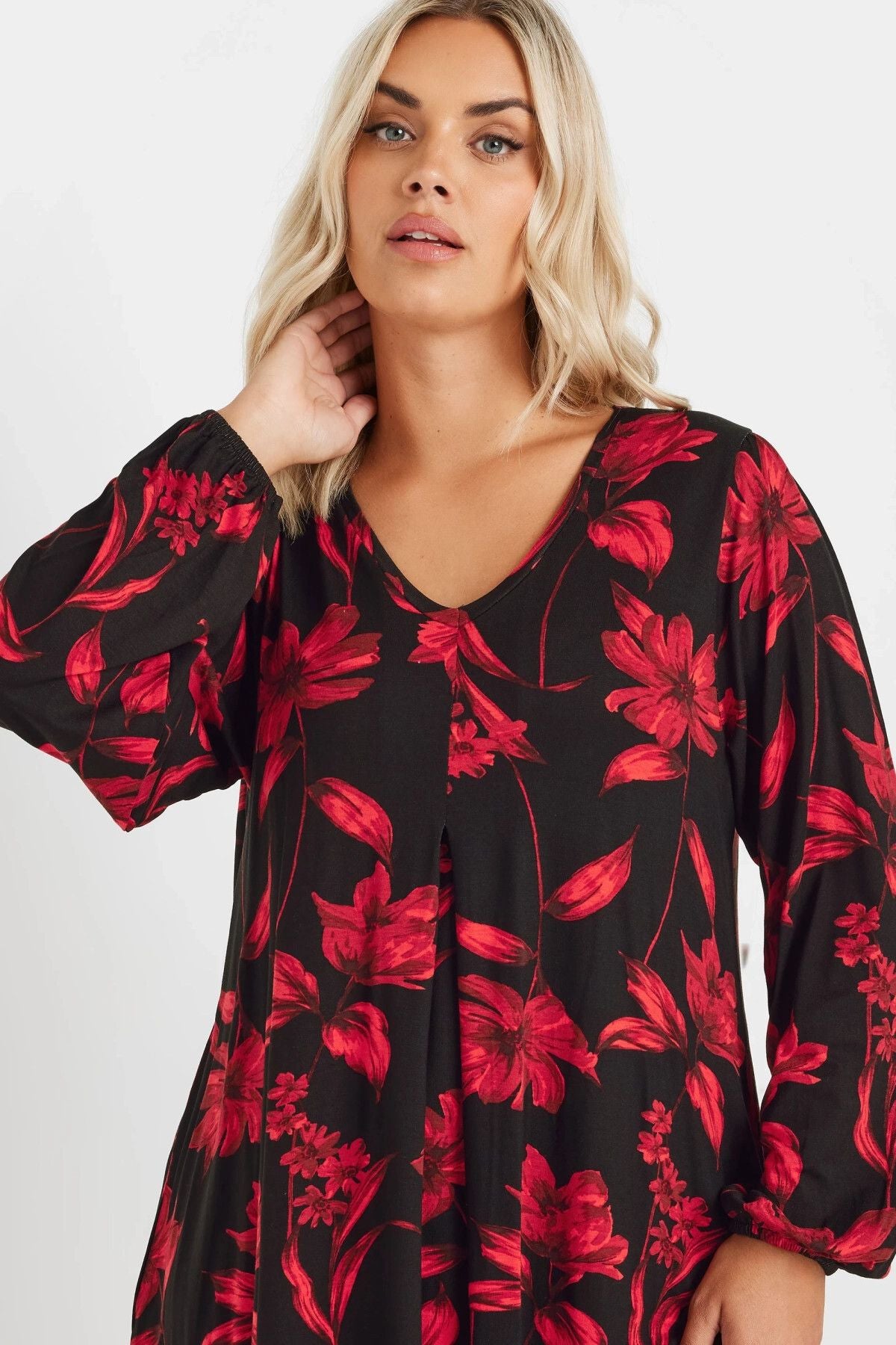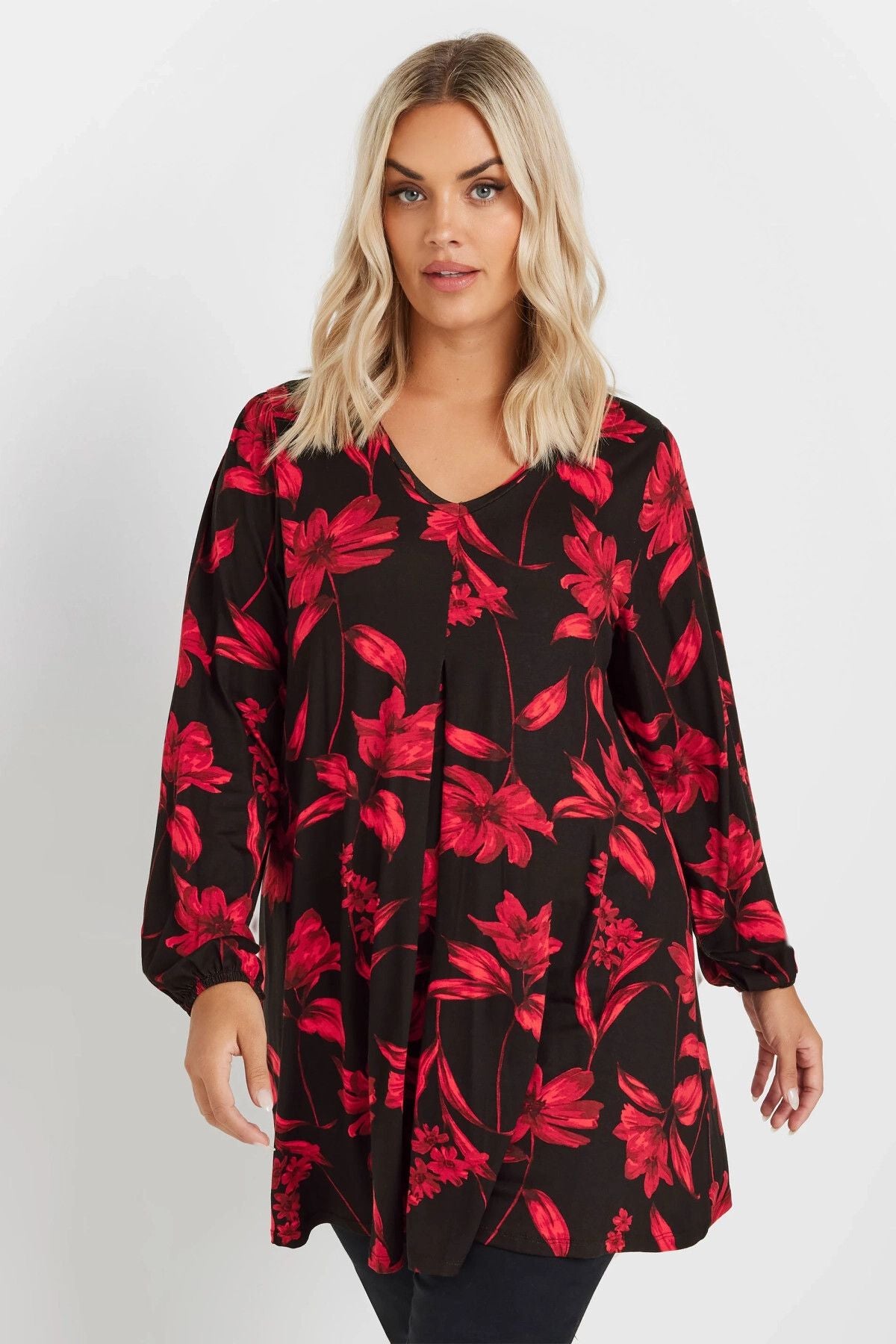 Büyük Beden Uzun Kollu V Yaka Önü Pileli Çiçek Desenli Bluz 303721