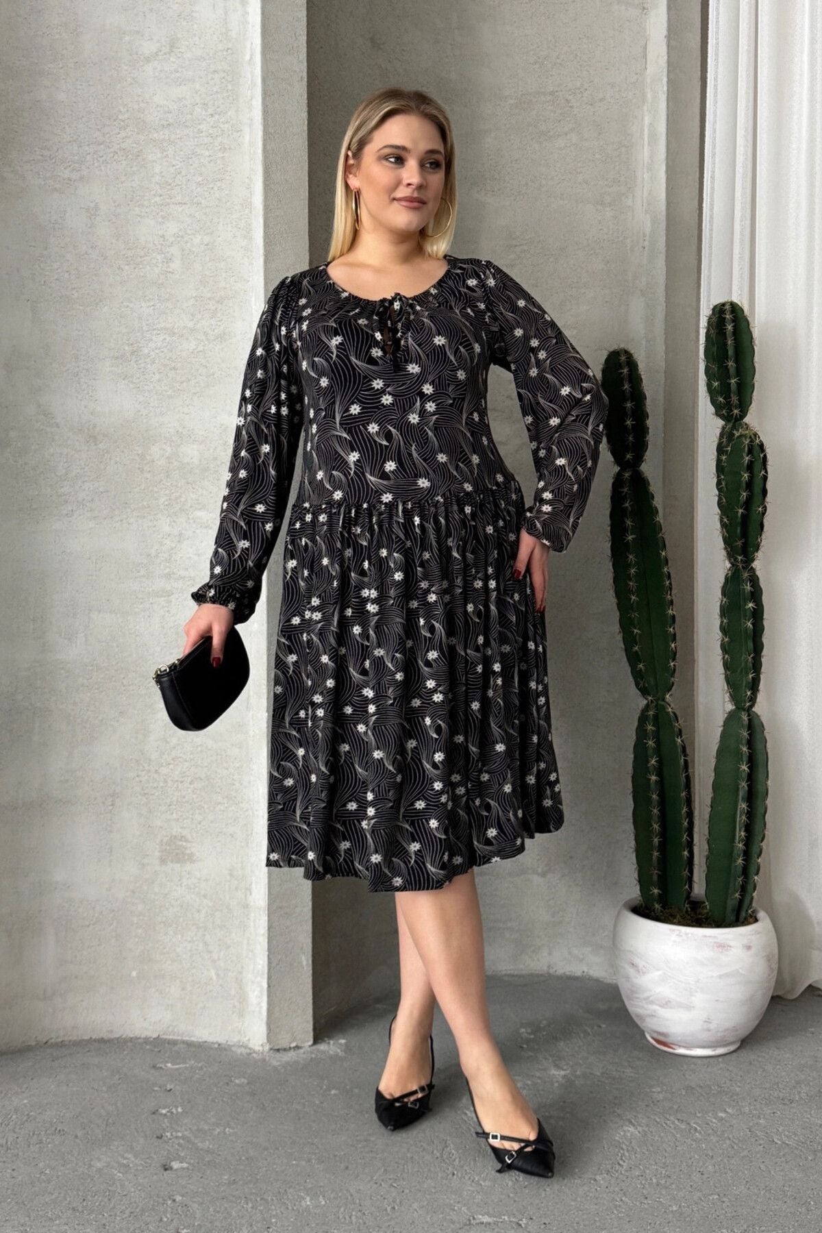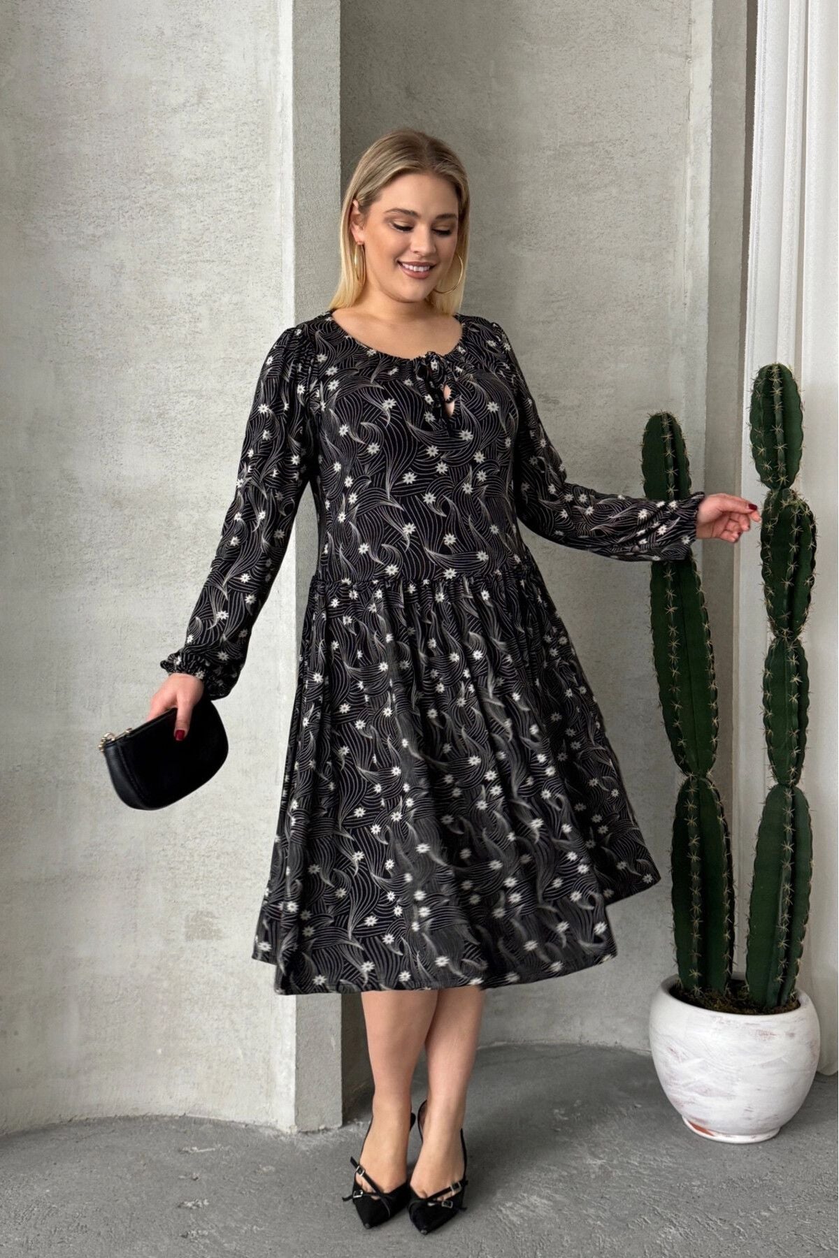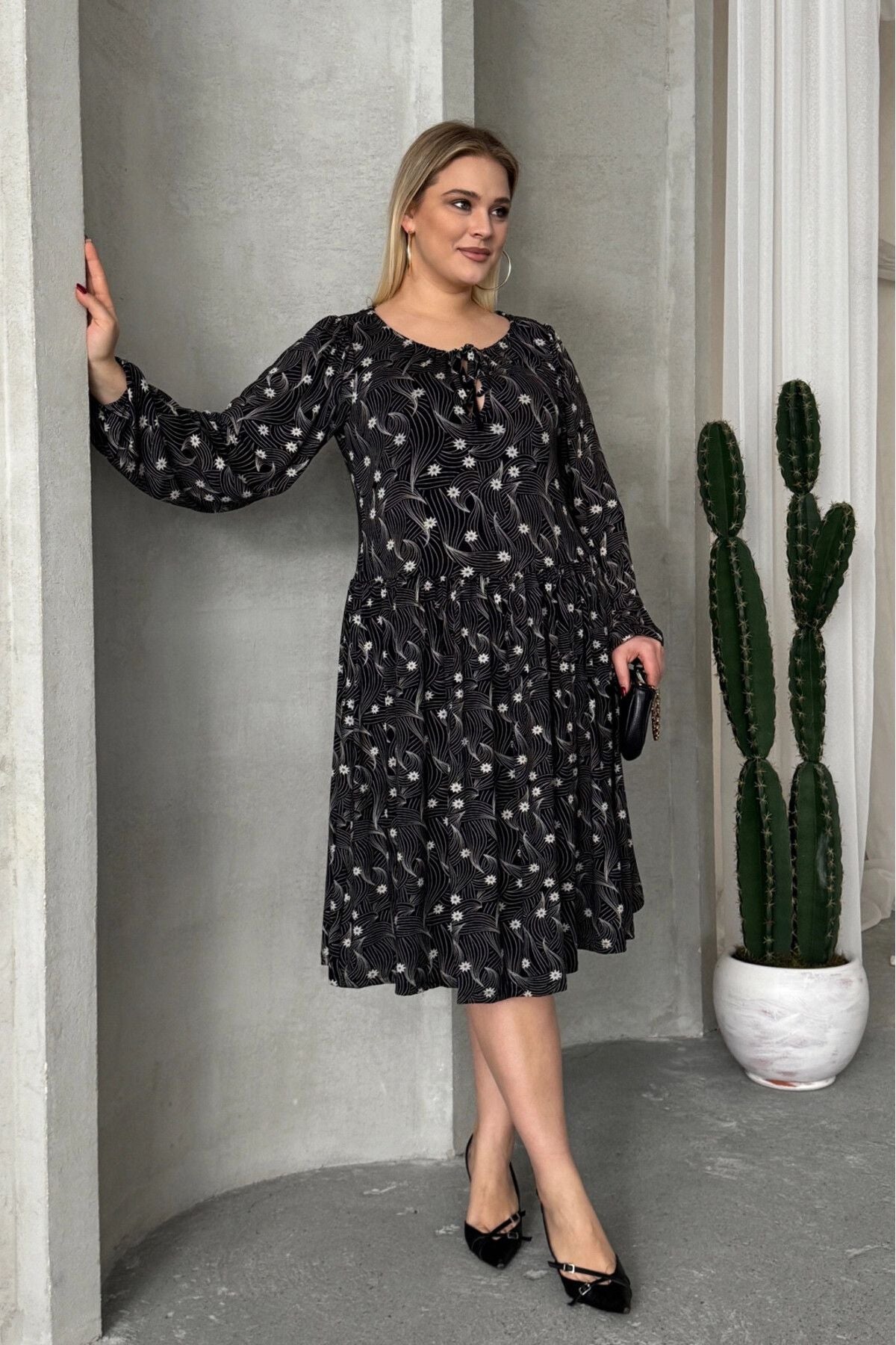 Büyük Beden Uzun Kollu Yakası Bağlama Detaylı Desenli Elbise 100-73