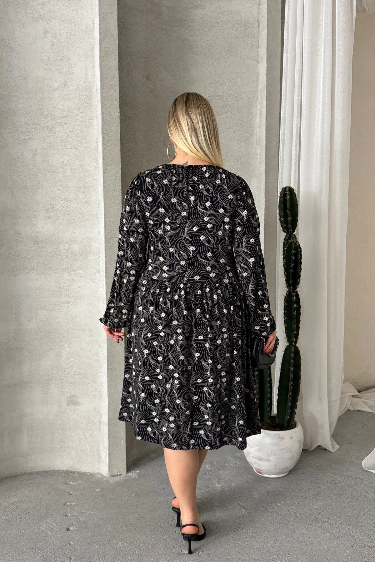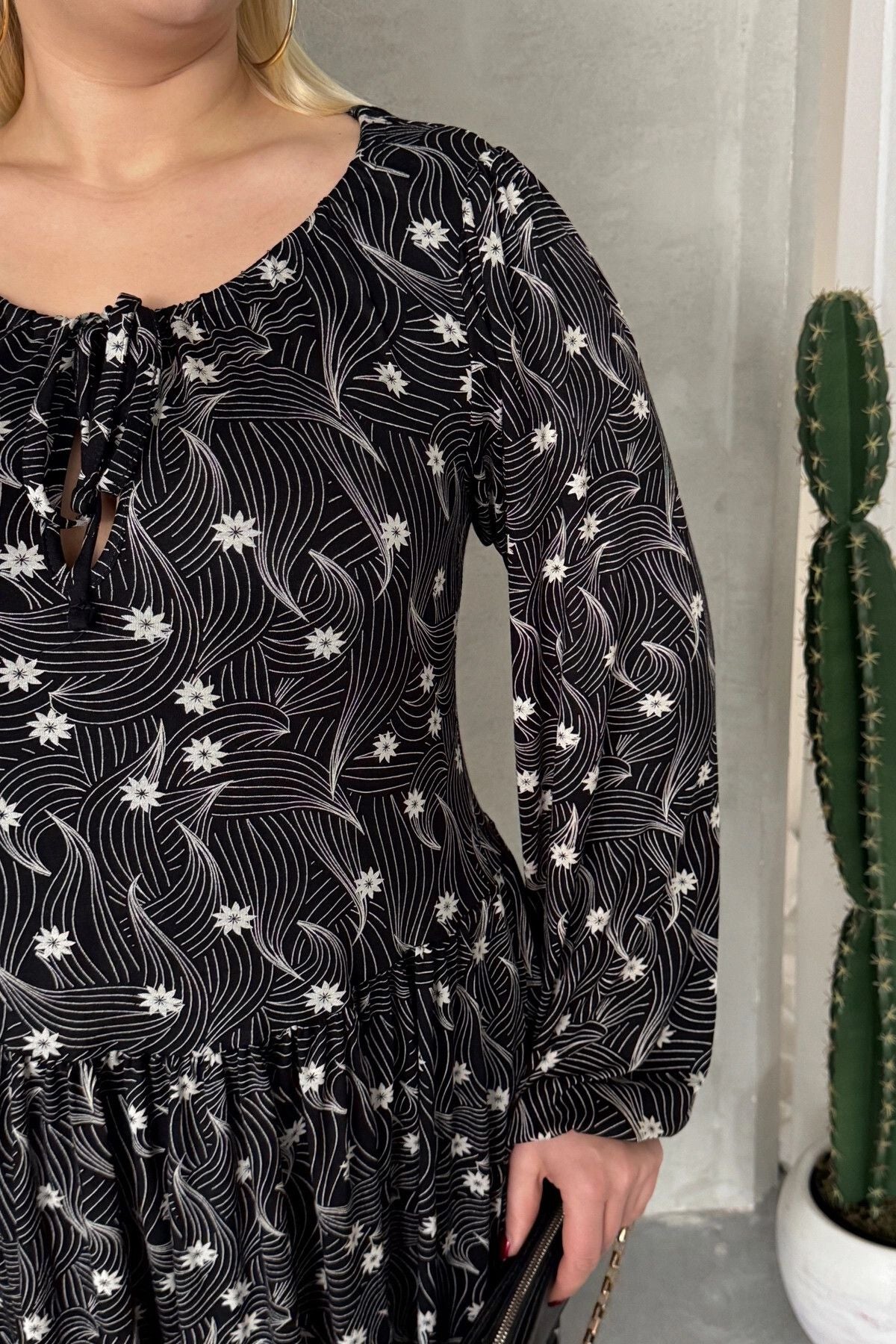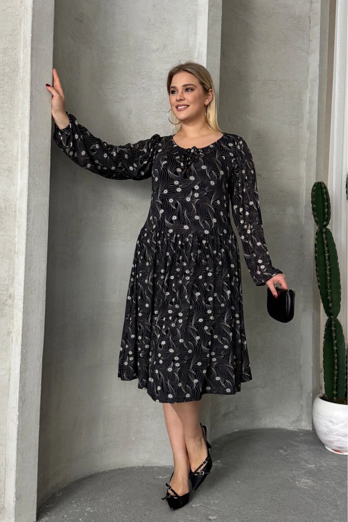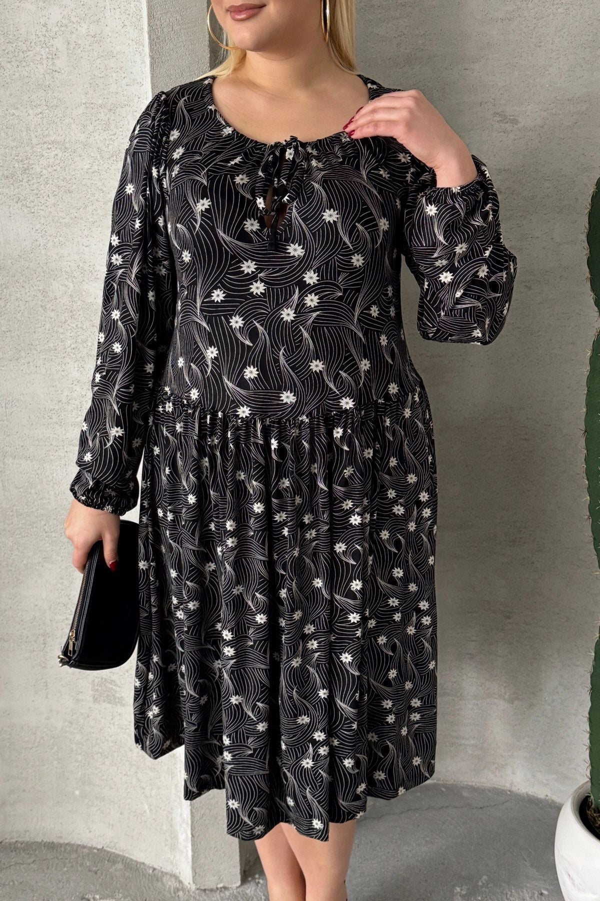 Büyük Beden Uzun Kollu Yakası Bağlama Detaylı Desenli Elbise 100-73