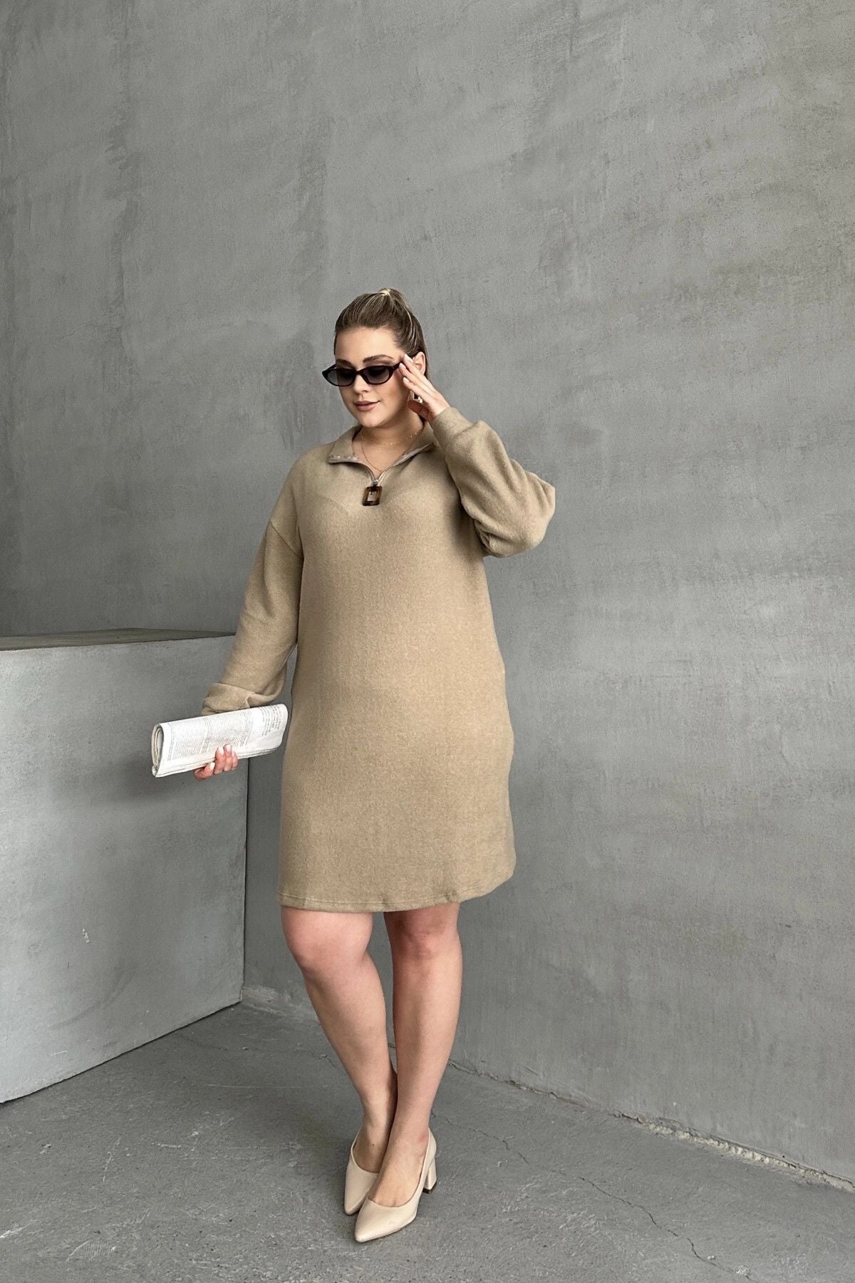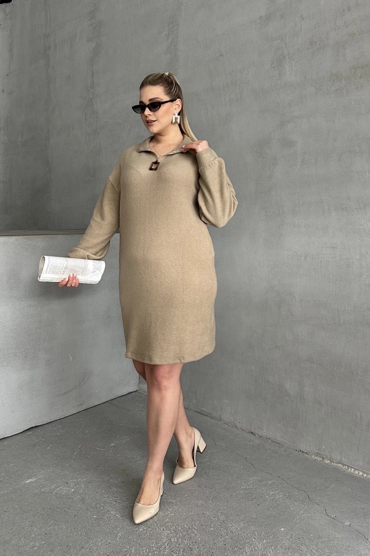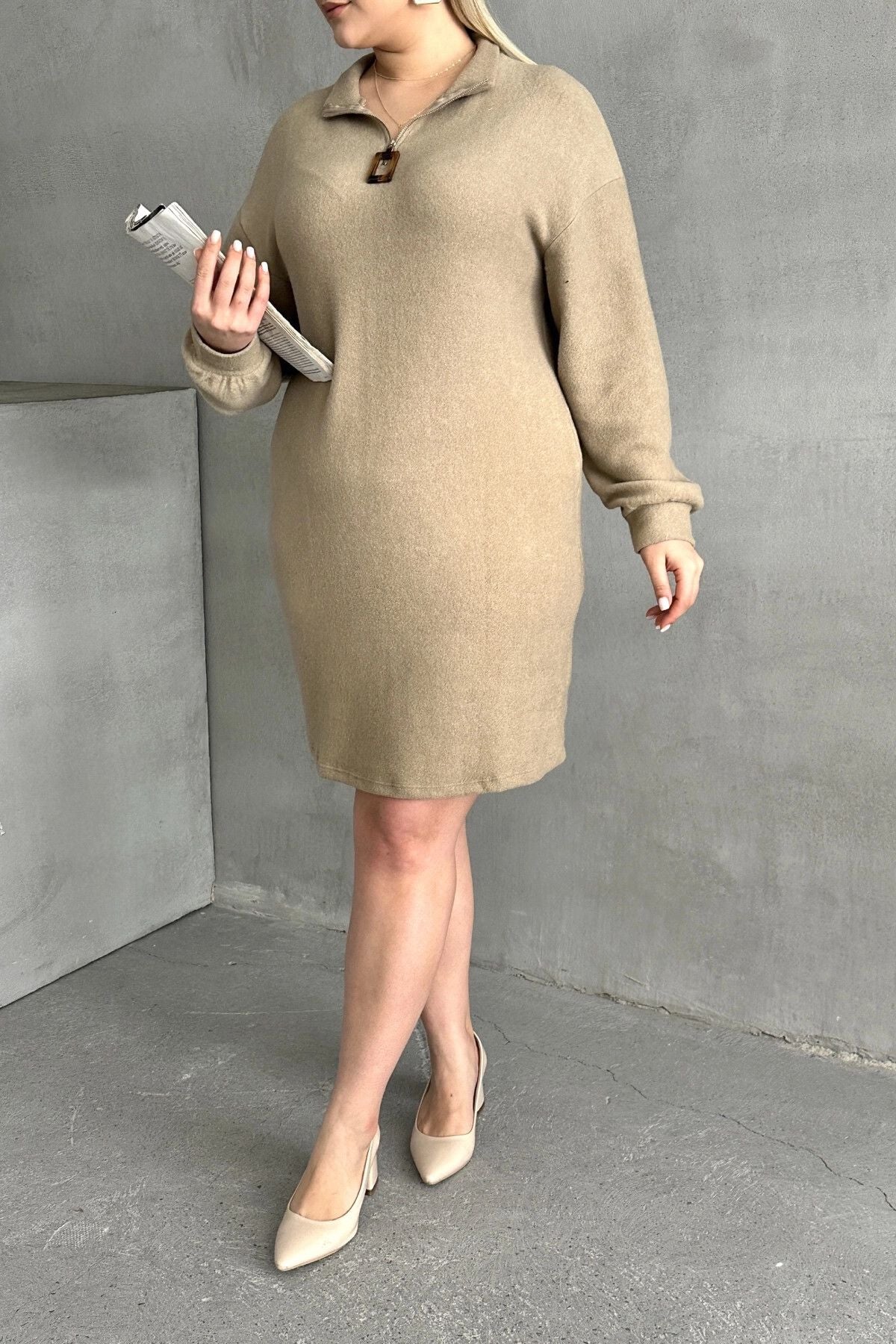 Büyük Beden Uzun Kollu Yumuşak Dokulu Yakası Fermuarlı Triko Elbise 106-37