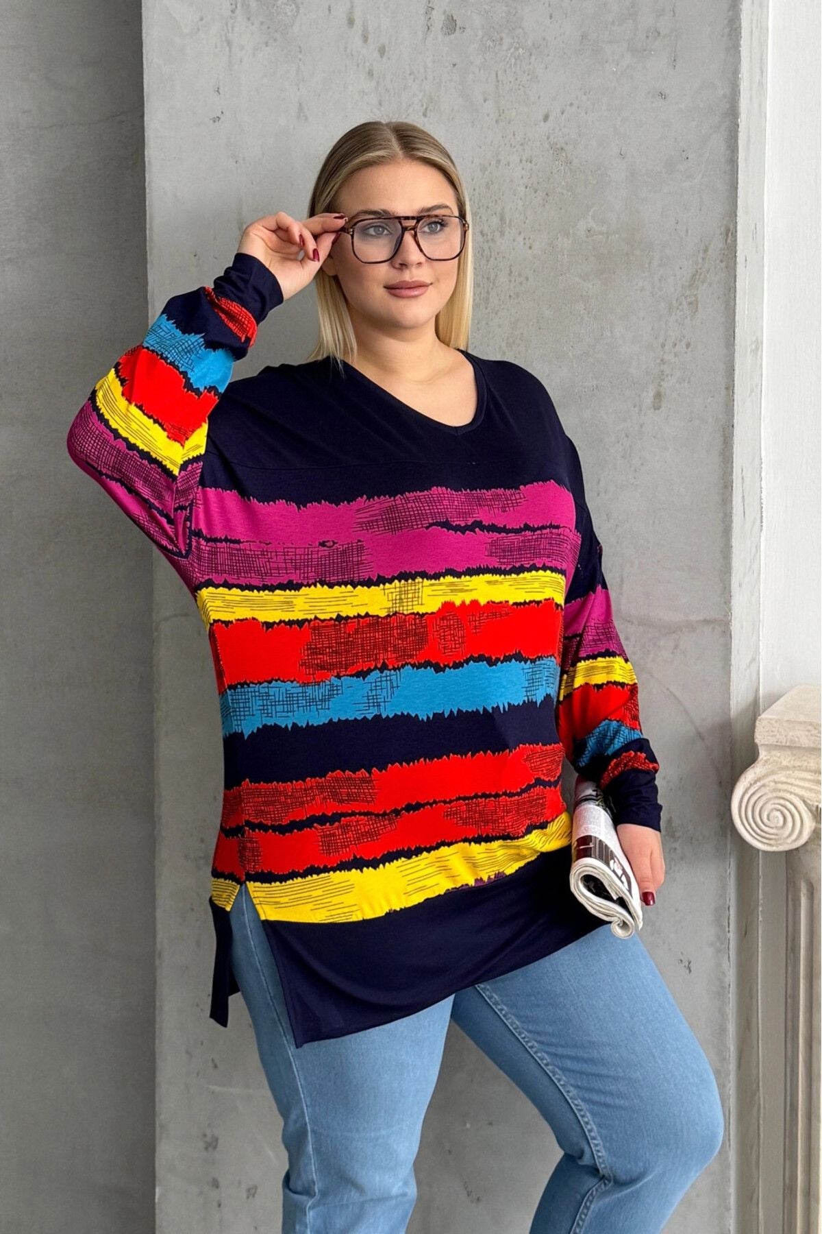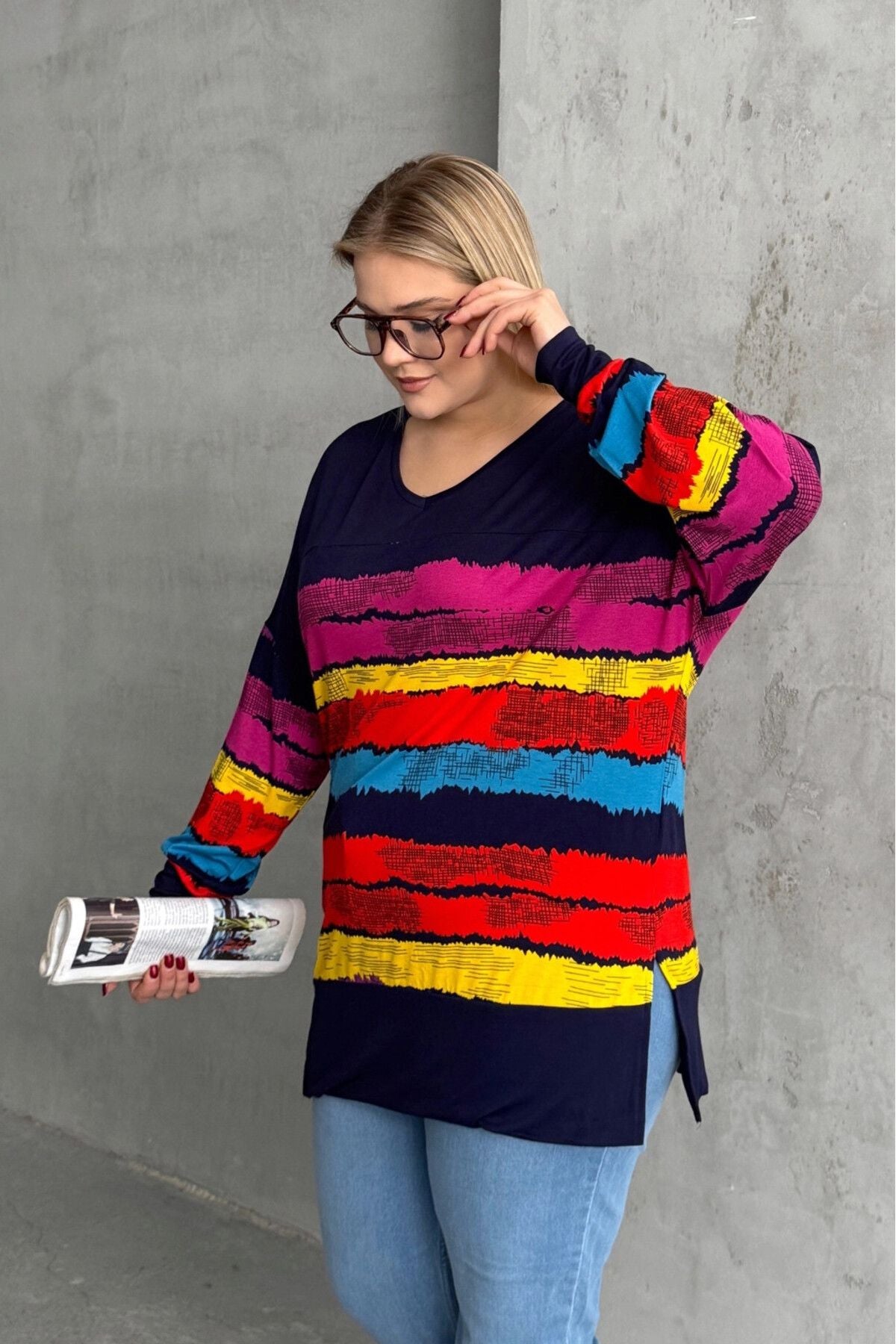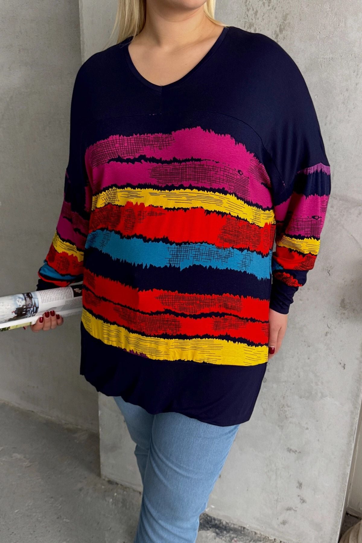 Büyük Beden V Yaka Çizgili Yanları Yırtmaçlı Uzun Kollu Bluz 303118