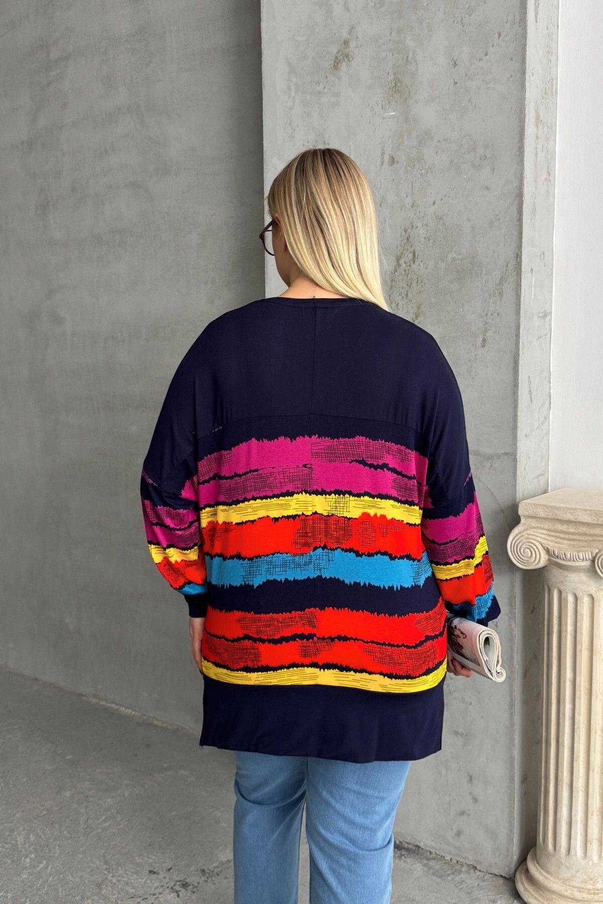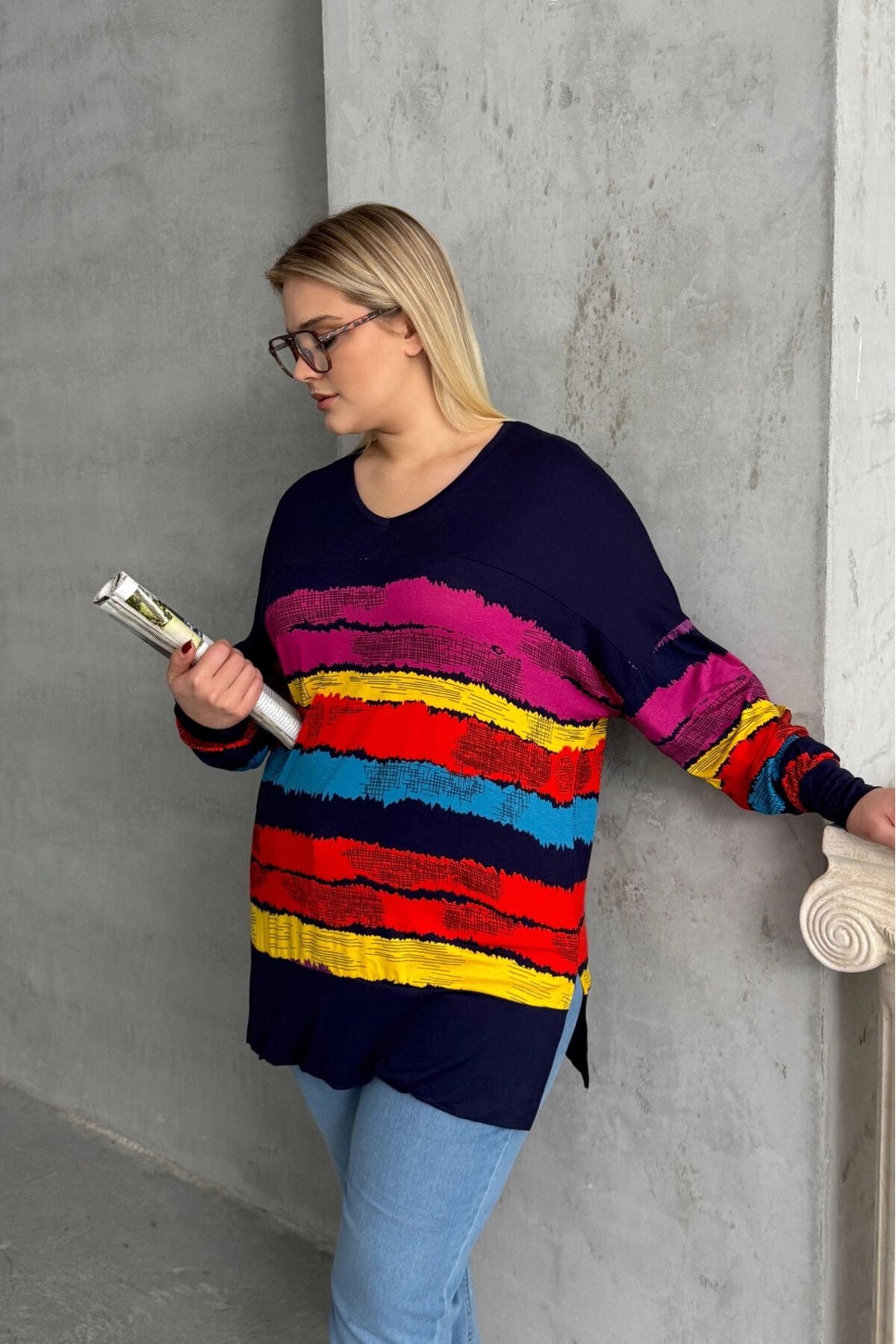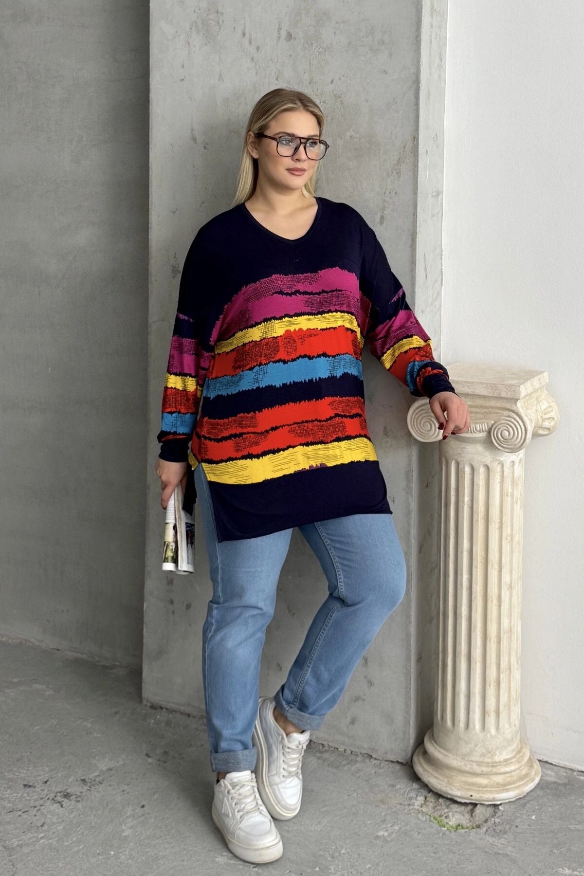 Büyük Beden V Yaka Çizgili Yanları Yırtmaçlı Uzun Kollu Bluz 303118