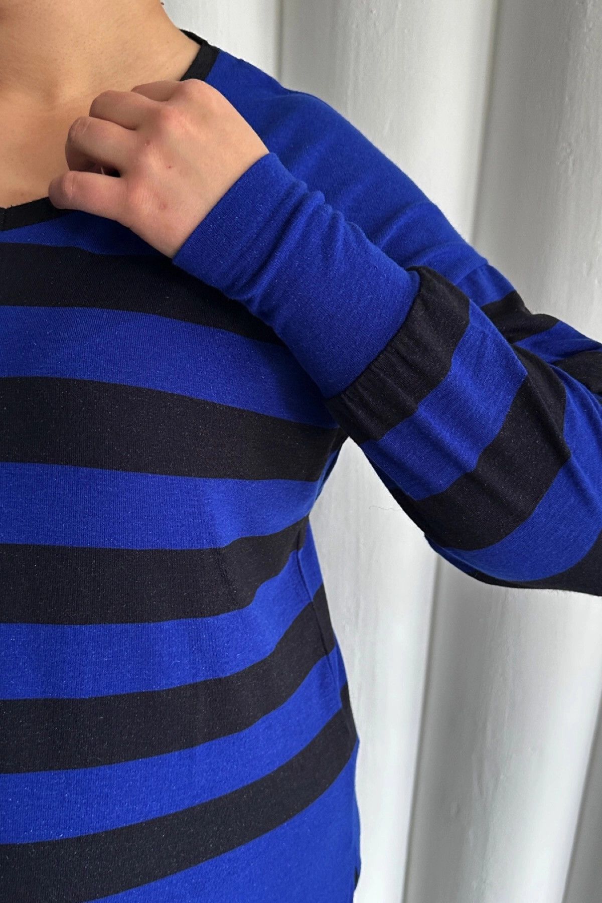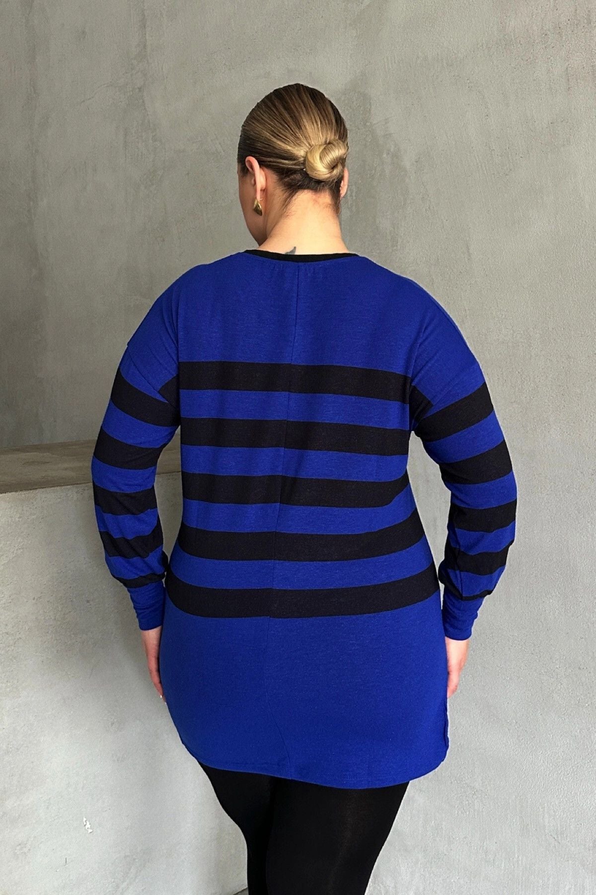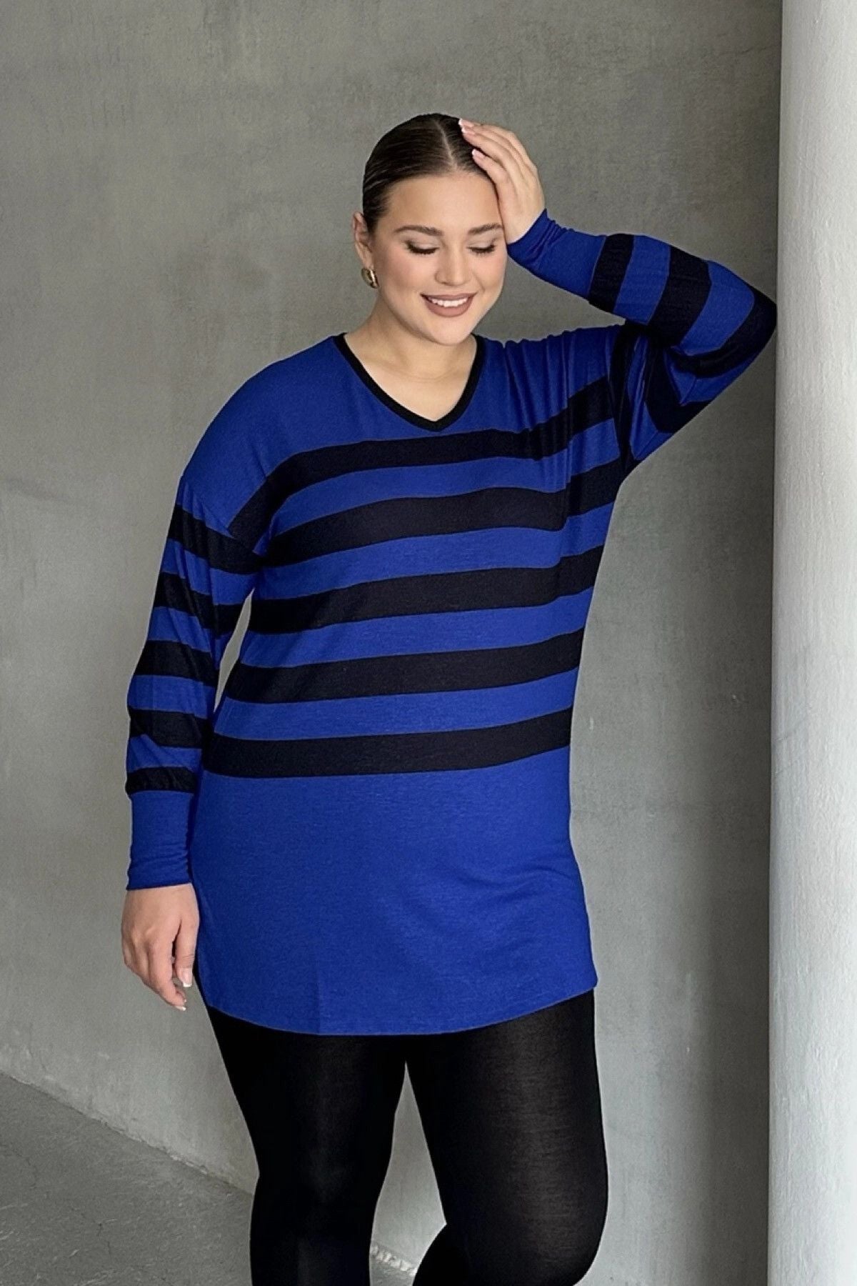 Büyük Beden V Yaka Çizgili Yırtmaç Detaylı İnce Kumaşlı Uzun Bluz 301567