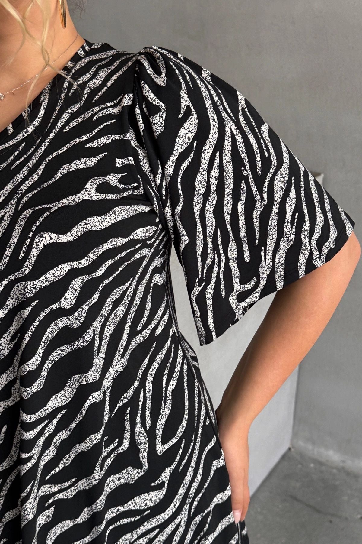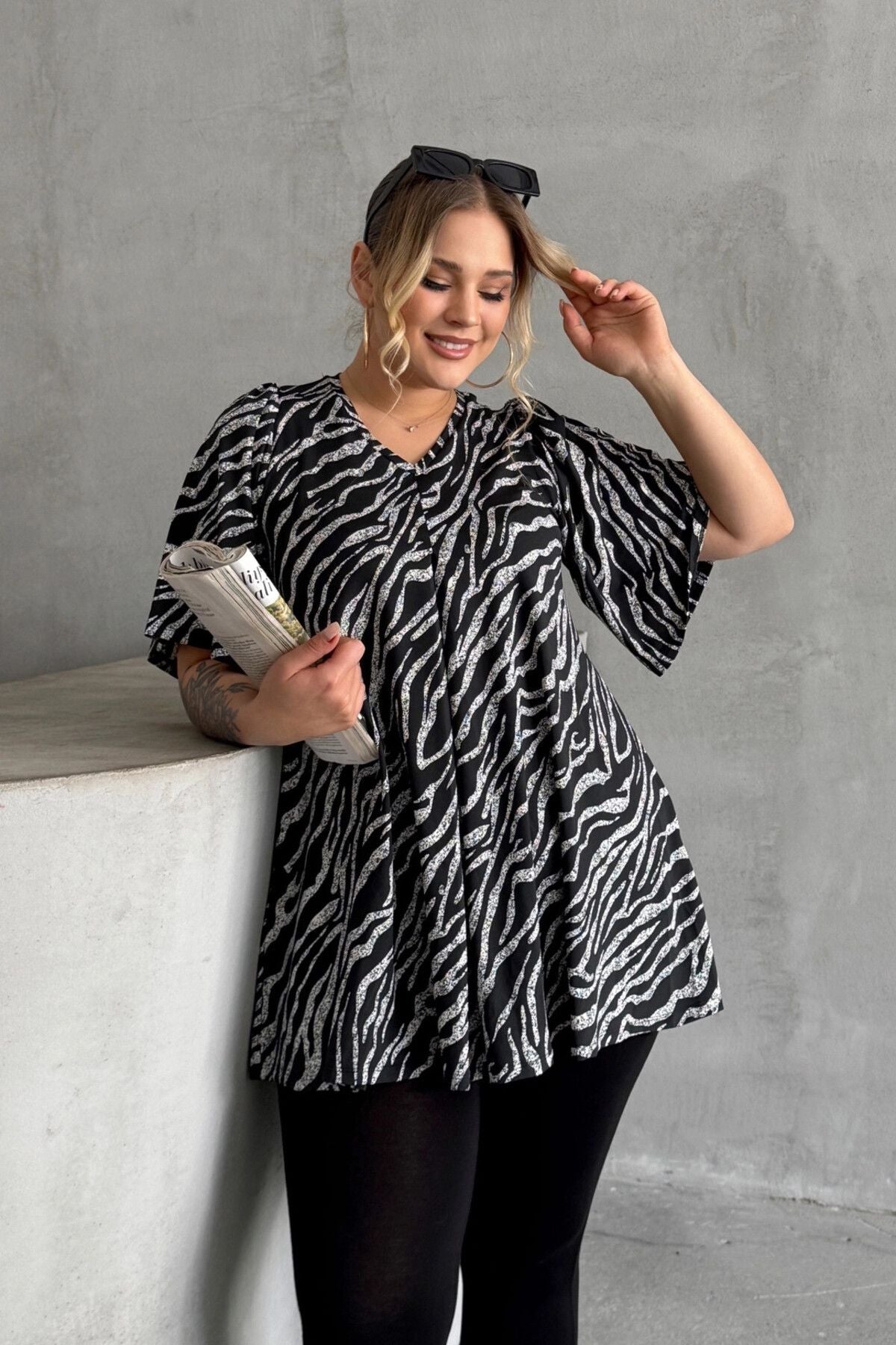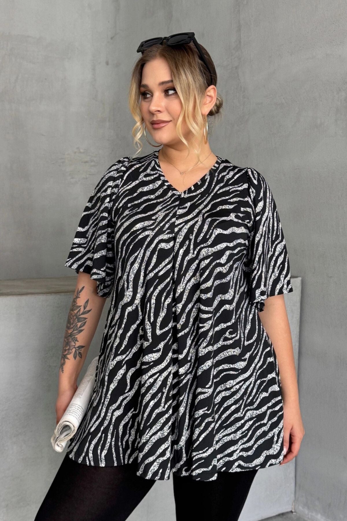 Büyük Beden V Yaka Desenli Asimetrik Kesim Likralı Bluz 302674