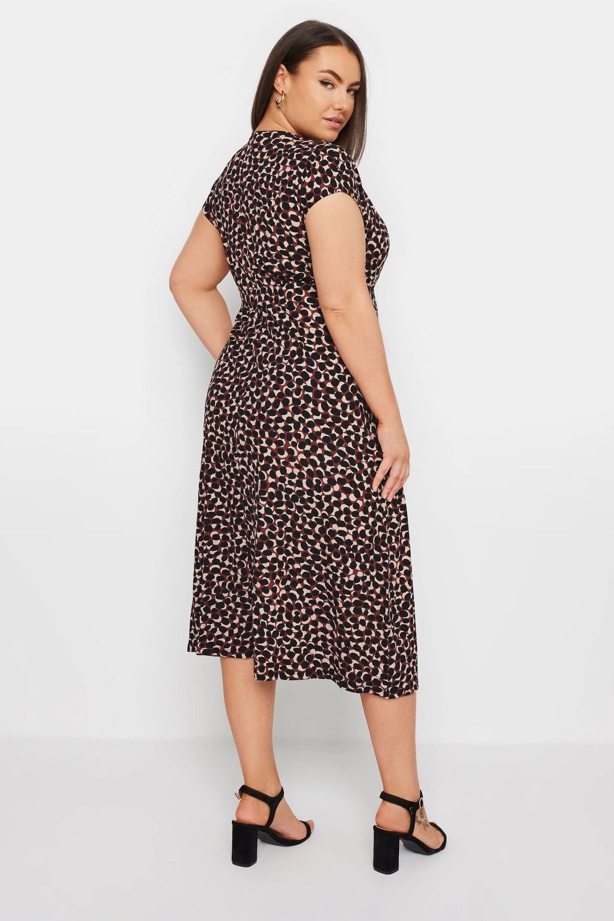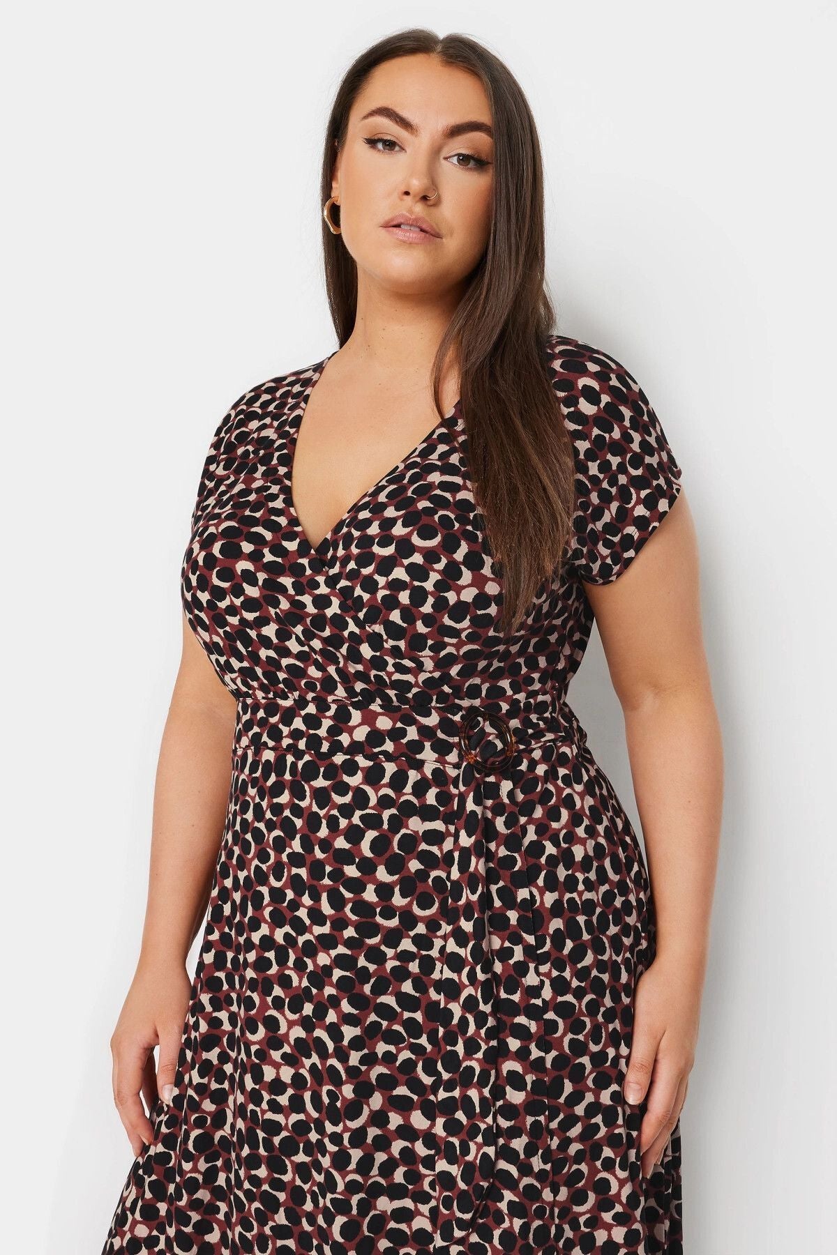 Büyük Beden V Yaka Desenli Kemer Detaylı Midi Boy Elbise 303273