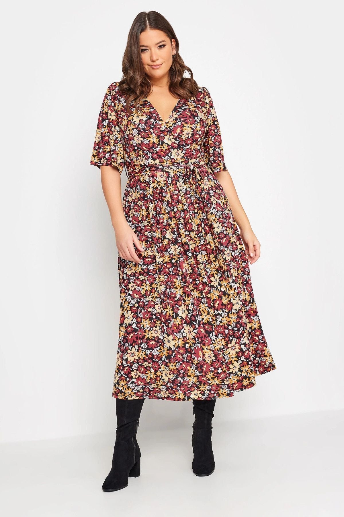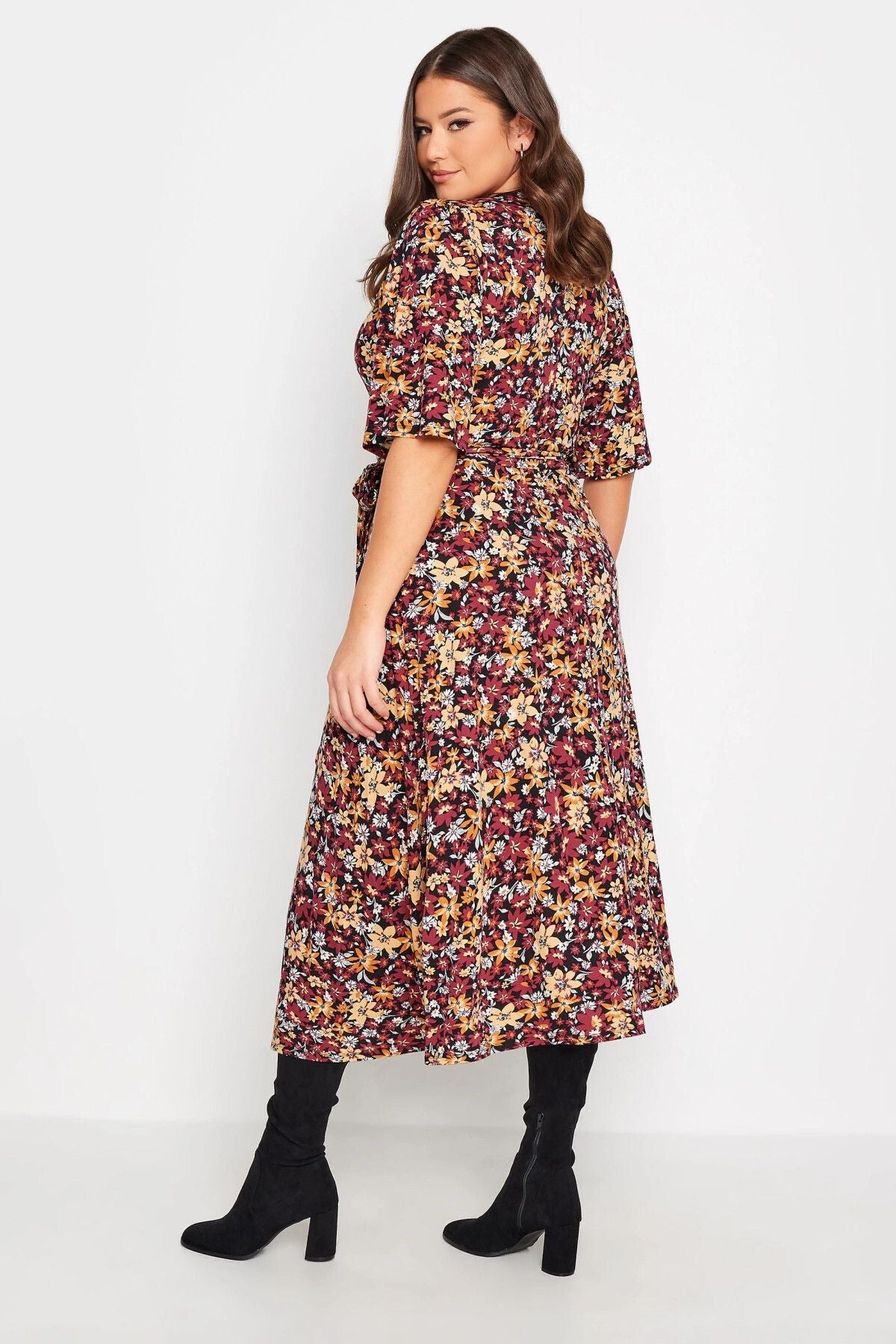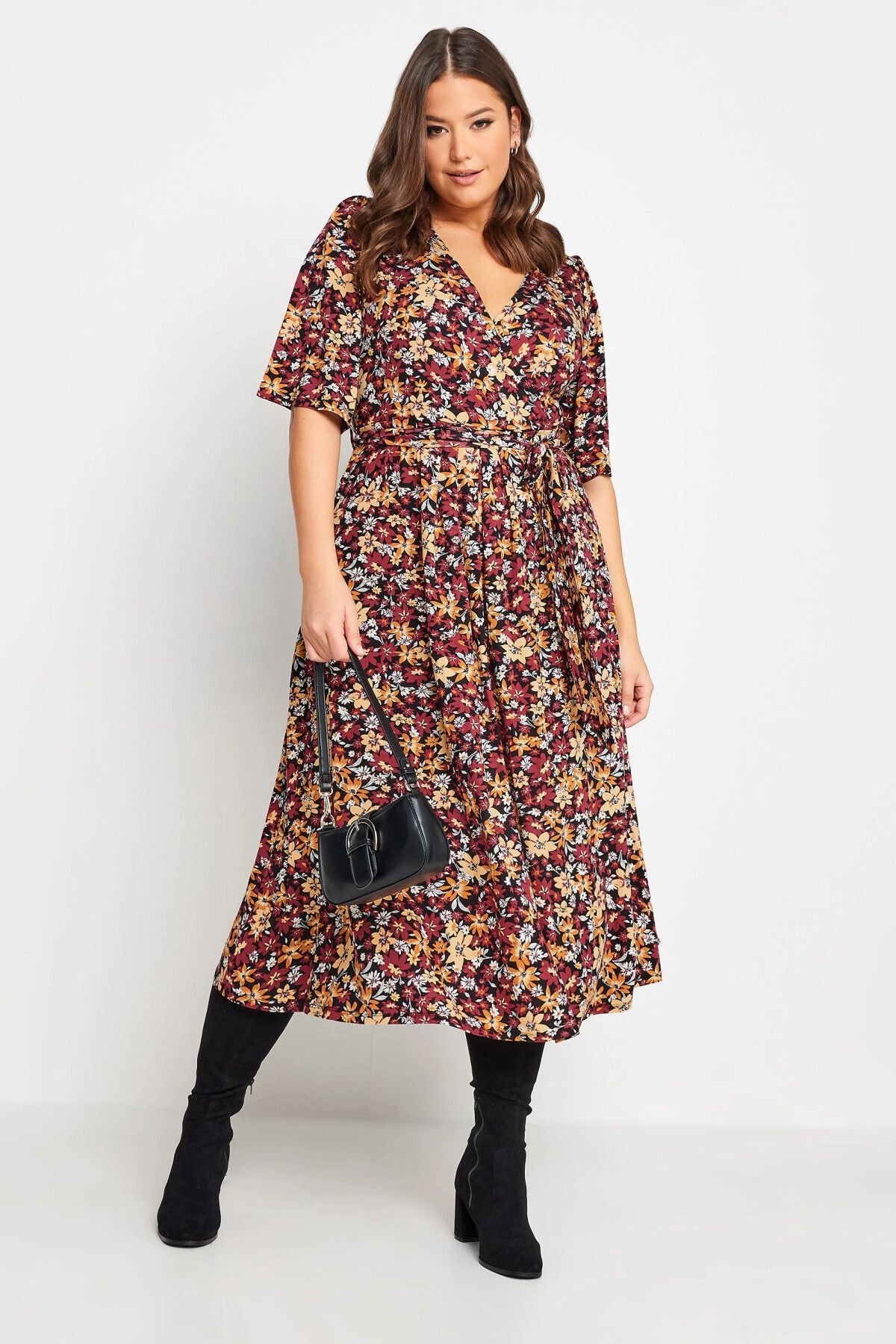 Büyük Beden V Yaka Desenli Kuşaklı Kısa Kol Anvelop Elbise 302746