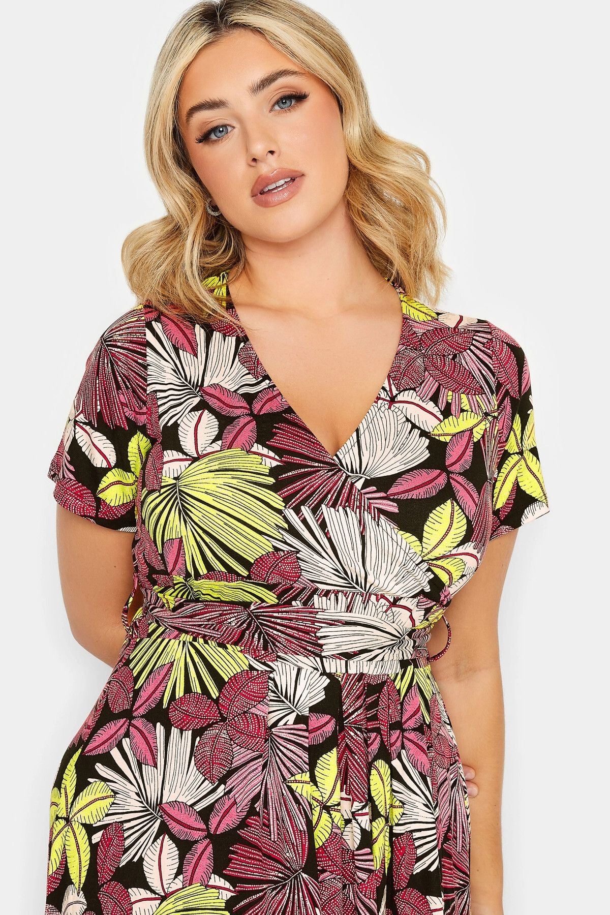 Büyük Beden V Yaka Desenli Kuşaklı Likralı Yarım Kol Anvelop Elbise 302064