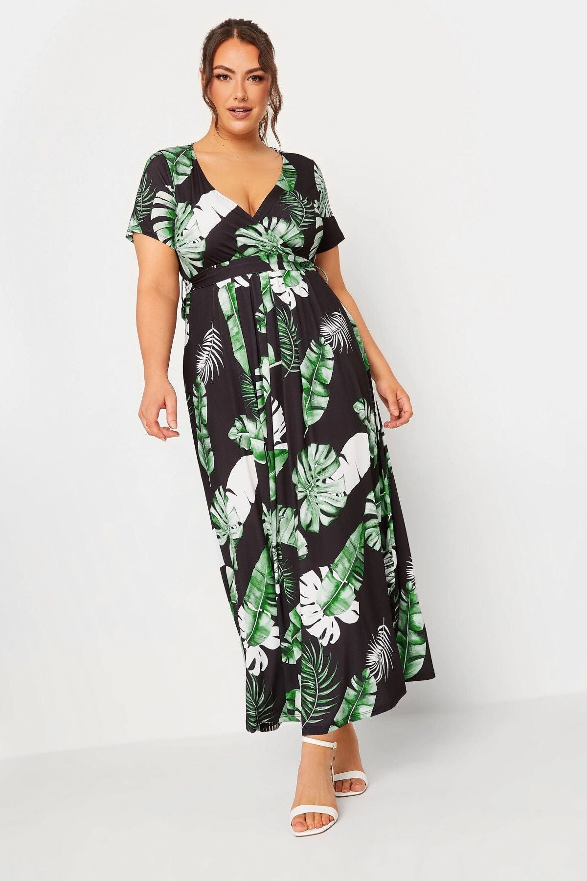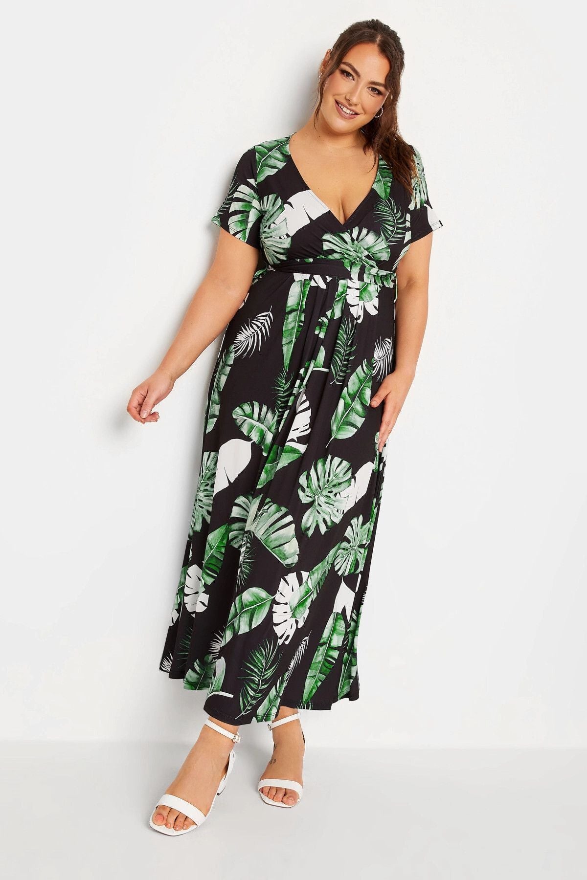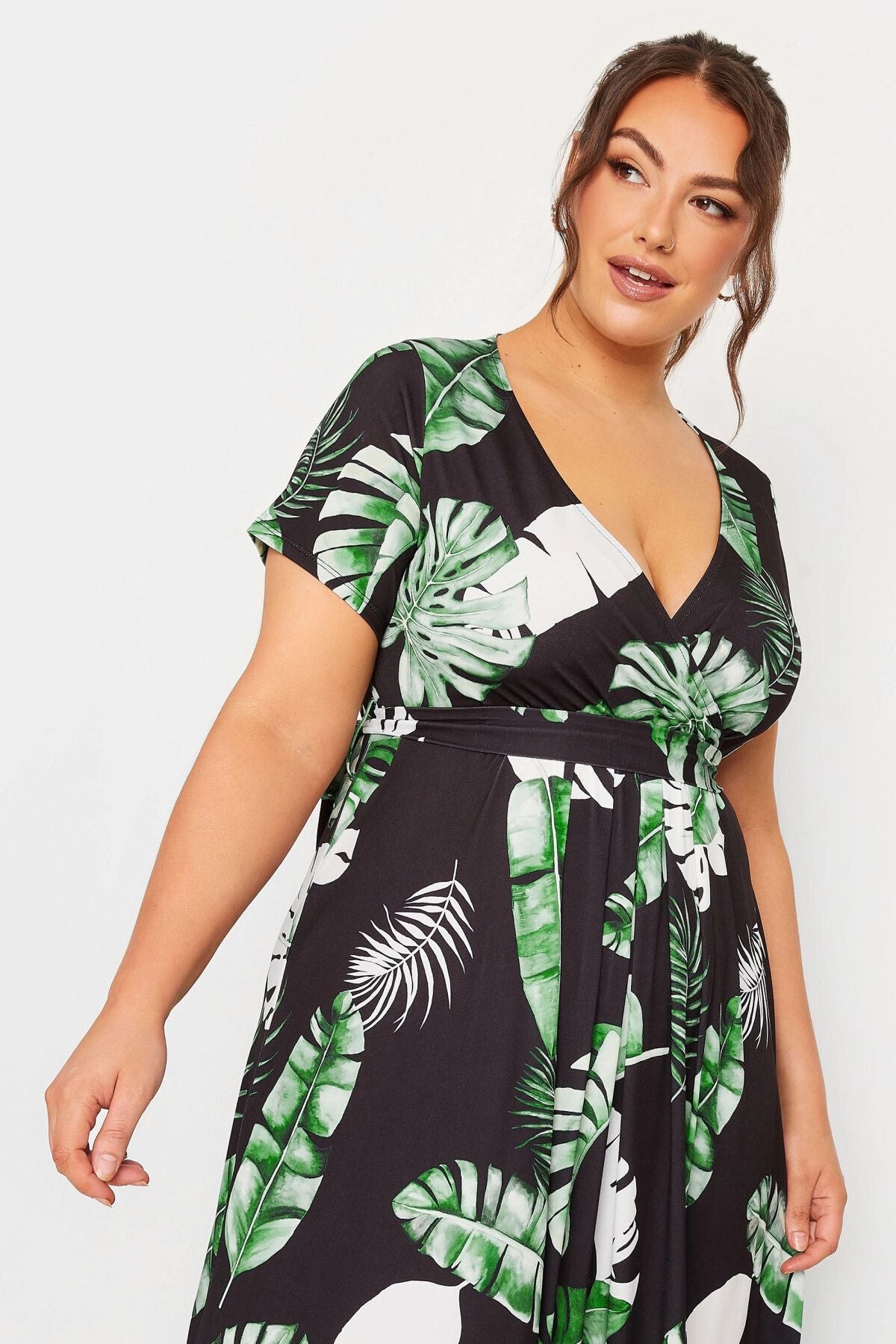 Büyük Beden V Yaka Desenli Kuşaklı Likralı Yarım Kol Anvelop Elbise 302151