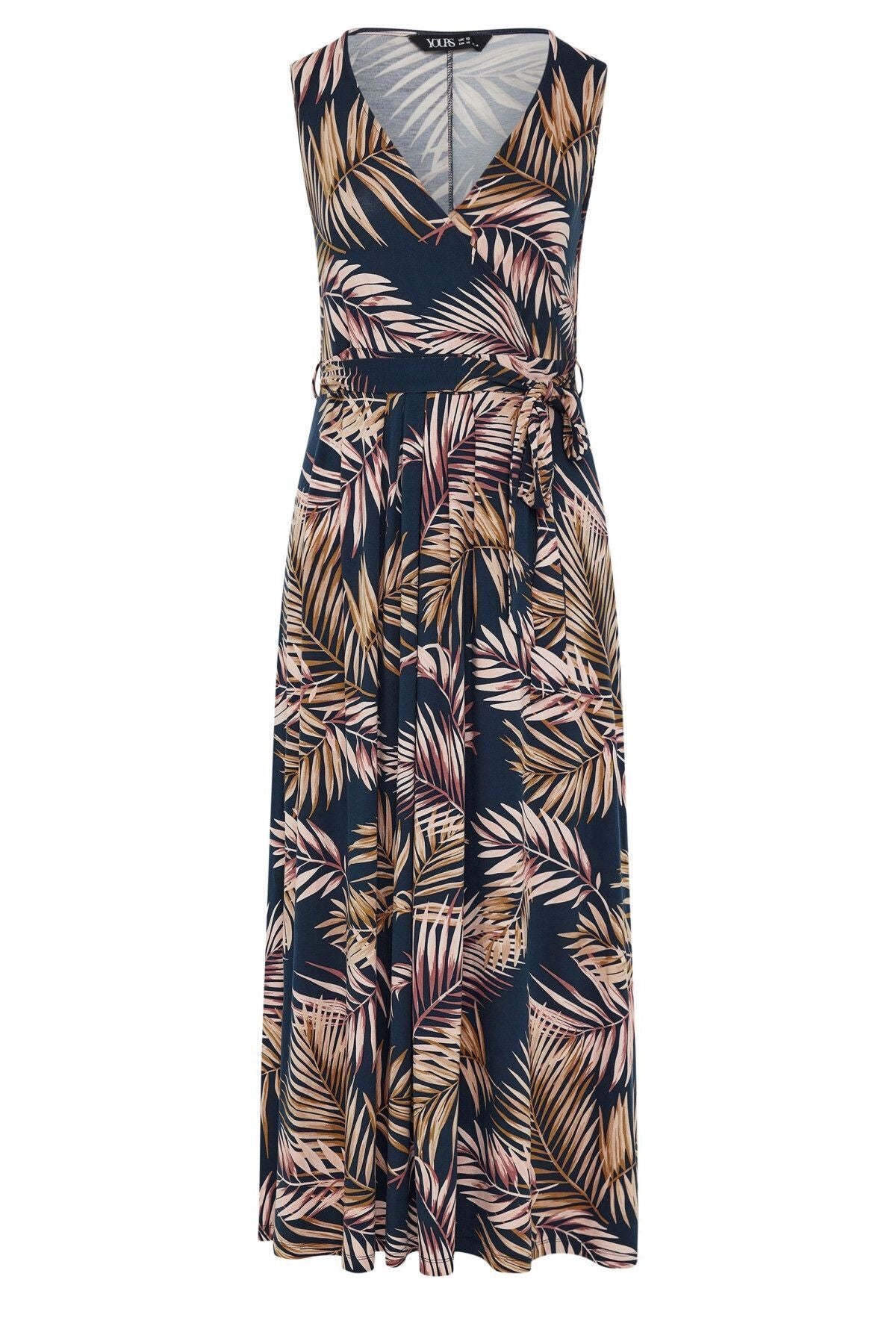 Büyük Beden V Yaka Desenli Kuşaklı Sıfır Kol Anvelop Elbise 137865