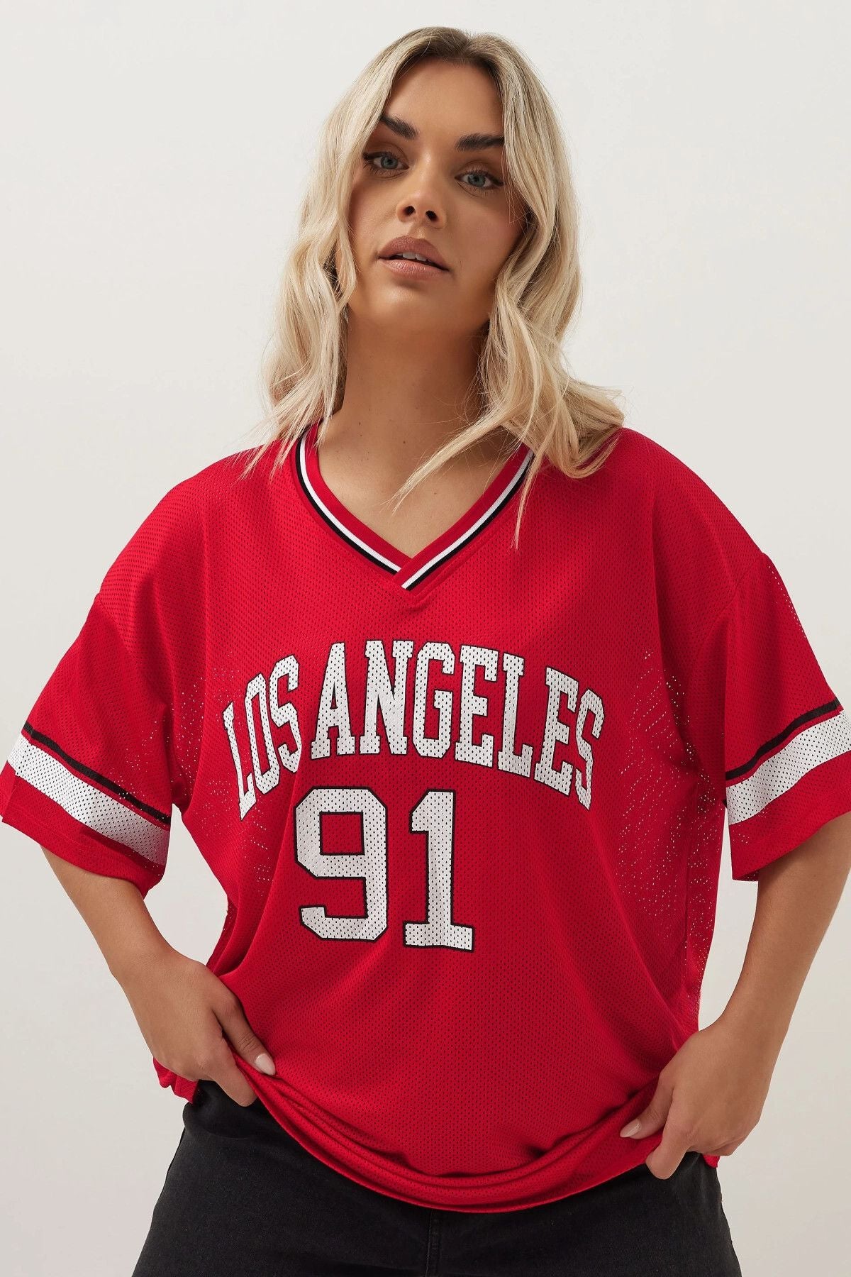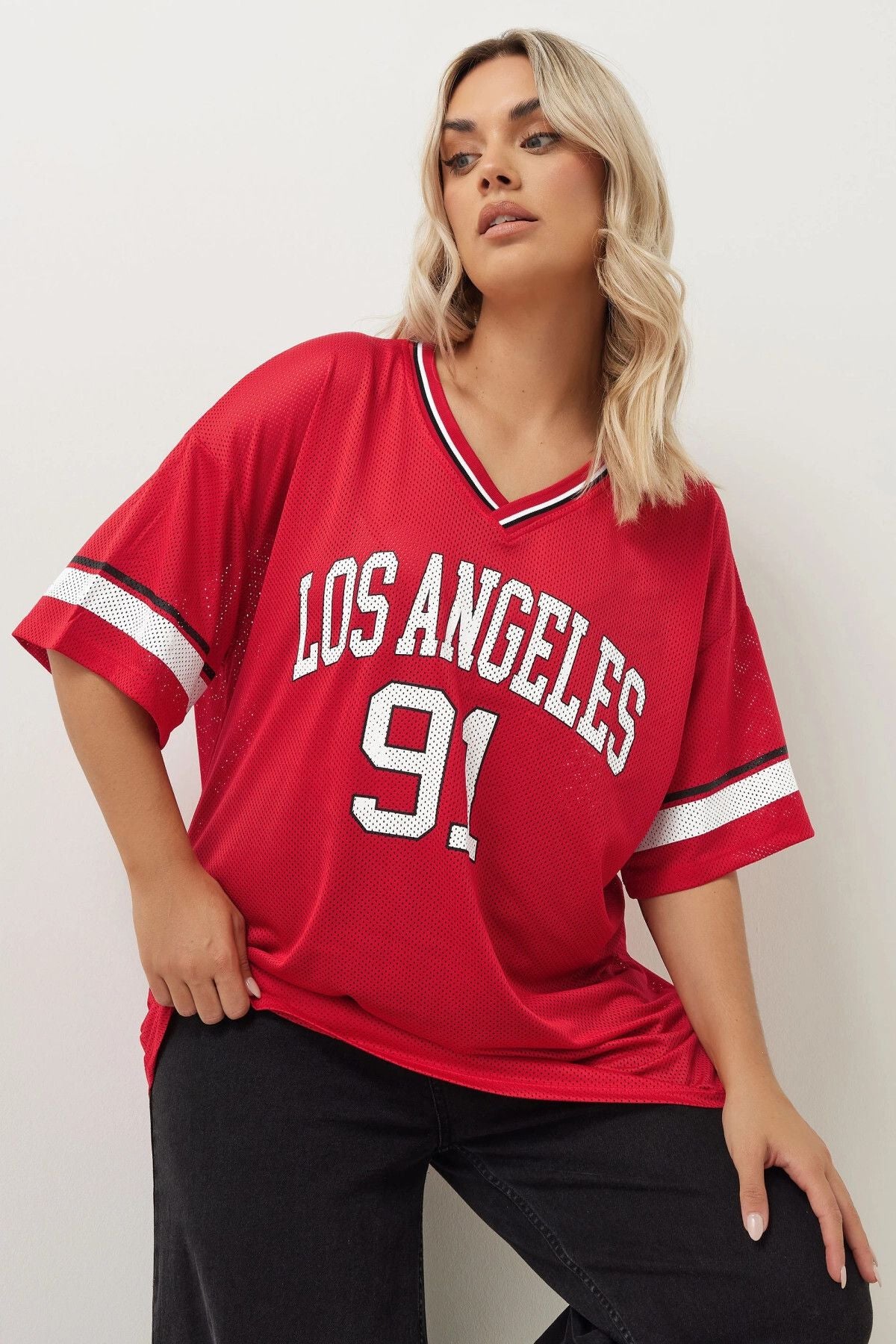 Büyük Beden V Yaka Kısa Kollu Baskılı File T-shirt 303494