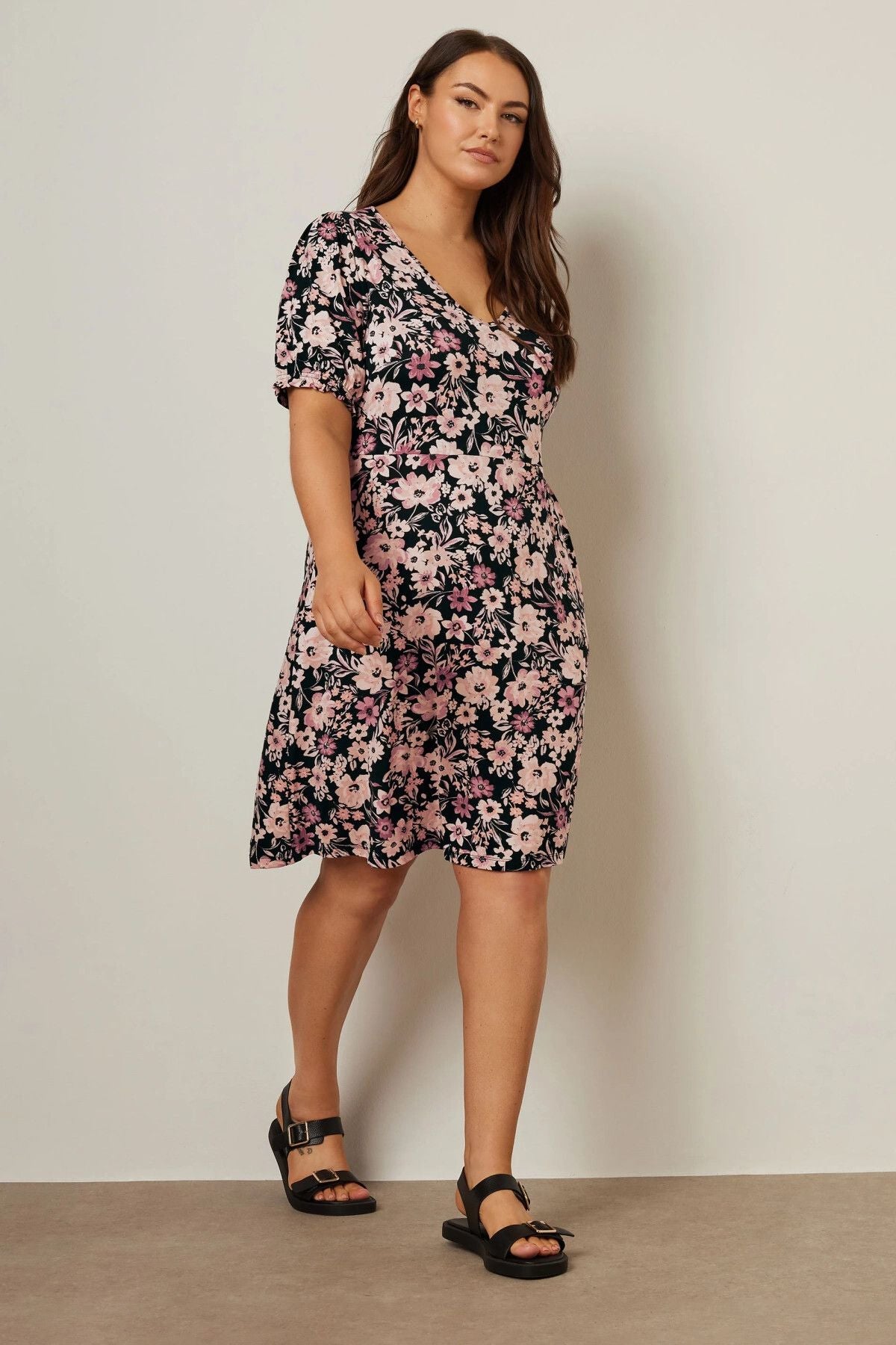 Büyük Beden V Yaka Kısa Kollu Çiçek Desenli Mini Elbise 137983
