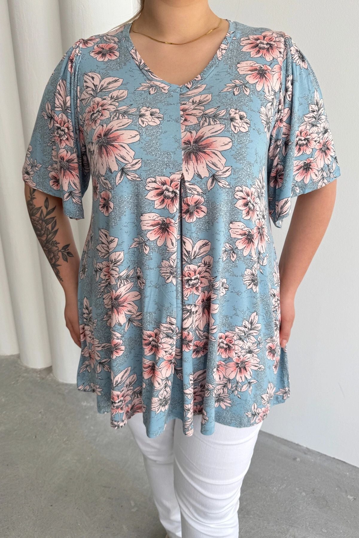 Büyük Beden V Yaka Kısa Kollu Eteği Bollaşan Desenli Bluz 101-44