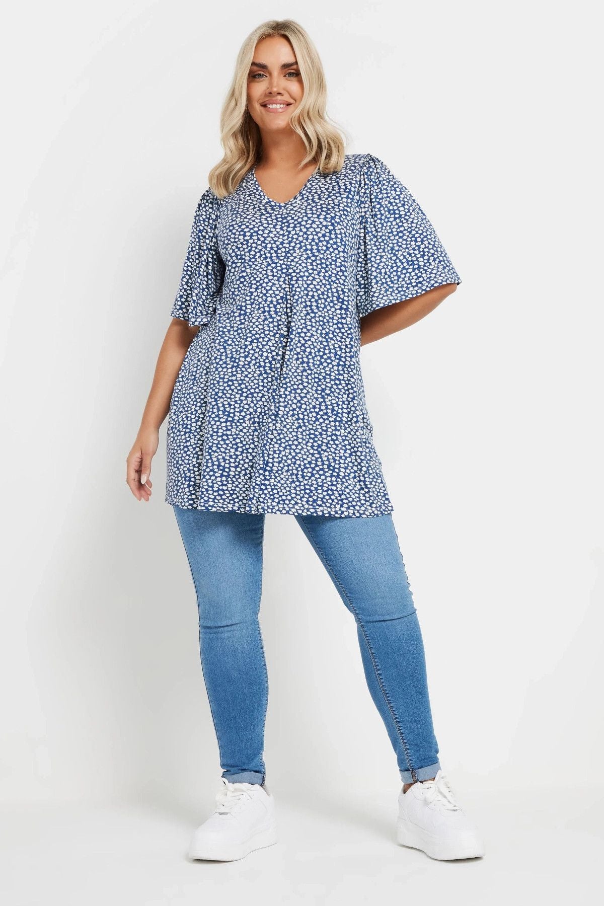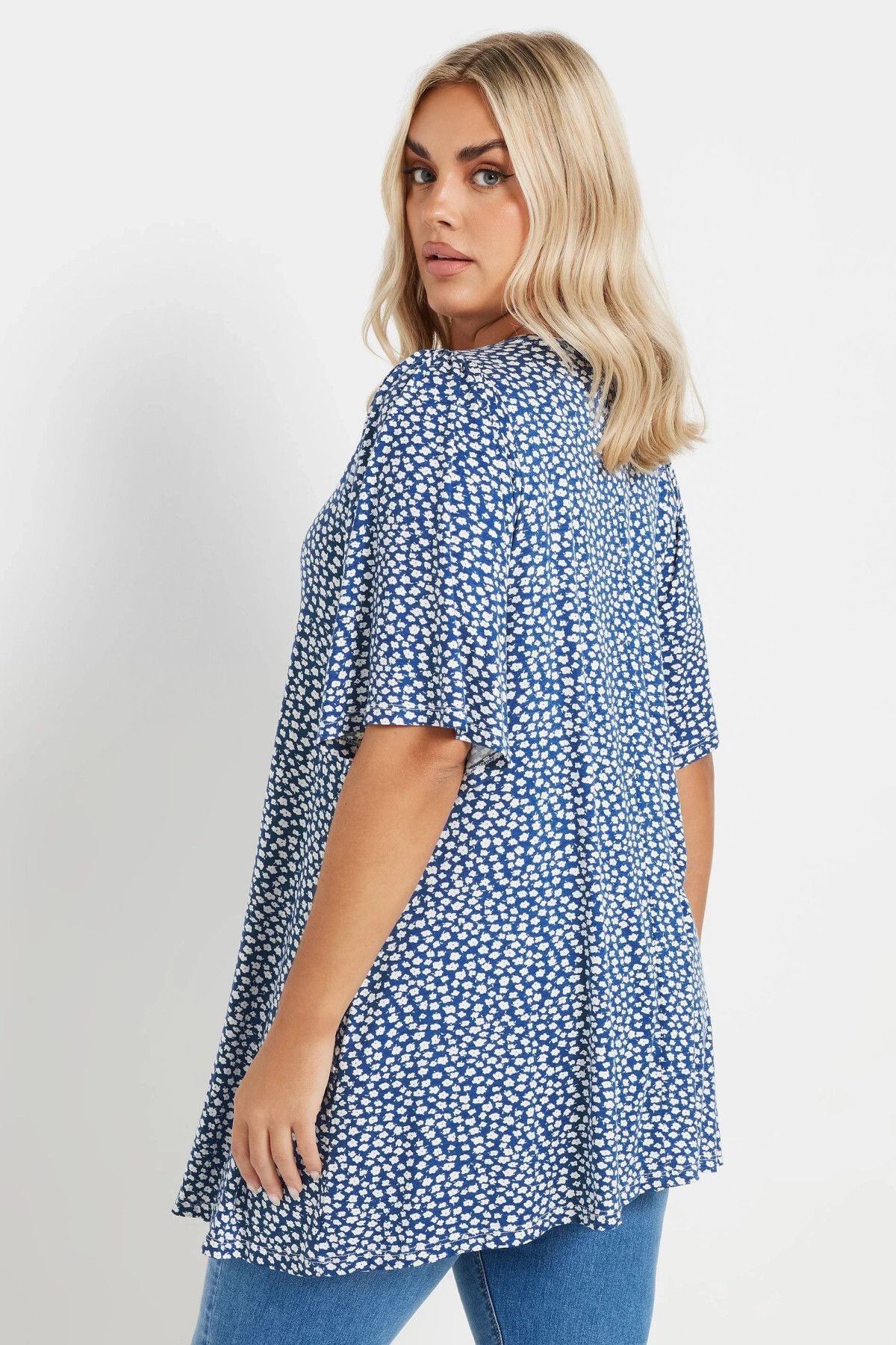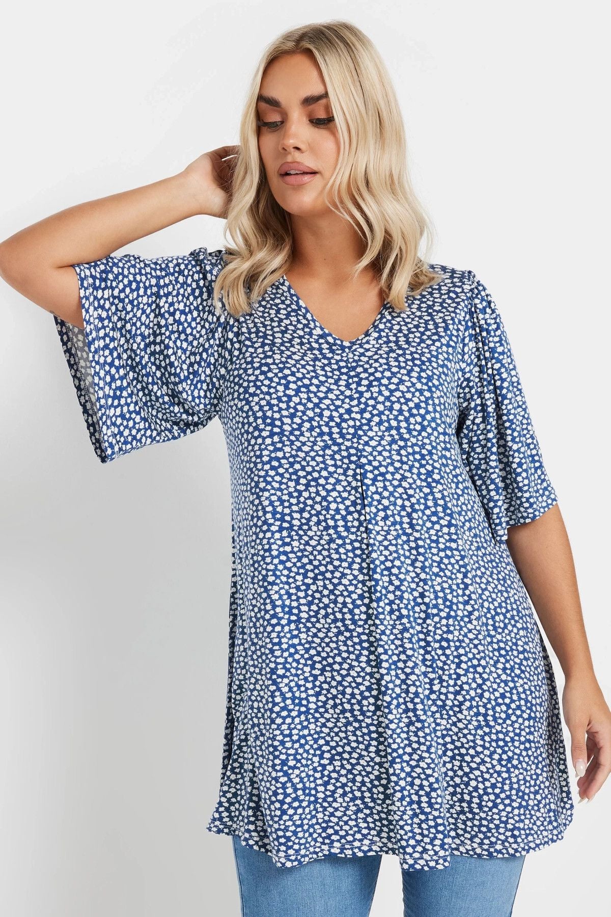 Büyük Beden V Yaka Kısa Kollu Eteği Bollaşan Desenli Bluz 303624